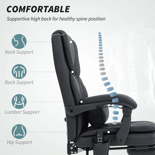 Features: - Six-point vibration massage soothes back, lumbar, and thighs with five modes, three intensities, and a 15-minute timer to fit your personal preference - High back, independent lumbar pillow and linked armrests to fit your body line - Thick high-resilience ensures supportive seating - Its pet-friendly faux leather resists scratches and fur, making cleanup incredibly easy - 140° recline with footrest for optimal relaxation - Swivel wheels and seat adapt to dynamic office environments. PU wheels protect all floor types from damage - Adjustable seat height with secure, smooth class-three gas lift - Assembly required Specification: - Color: Black - Material: Pet-Friendly Faux Leather (60% Polyurethane, 40% Polyester), Foam, Metal, Multi-Layer Board - Overall Dimension: 25.6" W x 26.4" D x 43.3" -46.5" H - Reclining Dimension: 25.6" W x 56.7" D x 36.2" -39.4" H - Seat Size: 20.9" W x 20.5" D x 18.1" -21.3" H - Back Size: 20.5" W x 27.2" H - Seat and Back Thickness: 4.7" - Armrest Height to Seat: 8.7" - Powder Cord Length: 5.9' - Weight Capacity: 264 lbs. - Suitable User Height: 6'1" - Output: 12V/1A, 12W