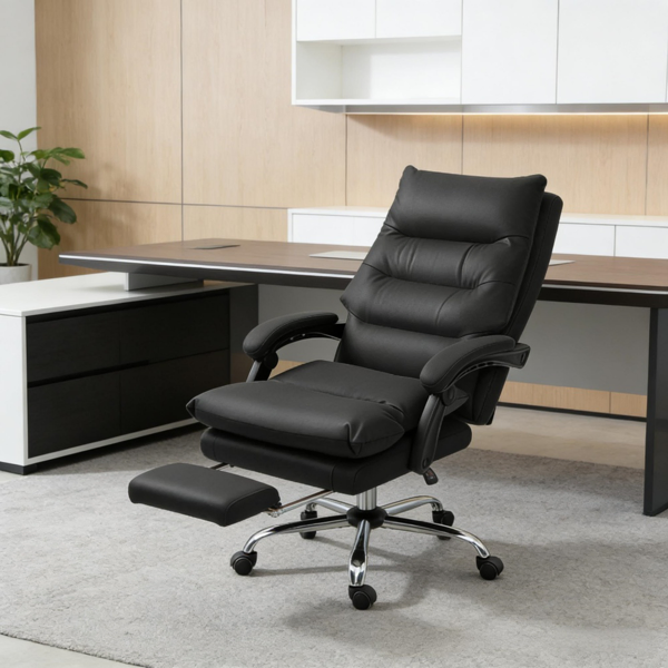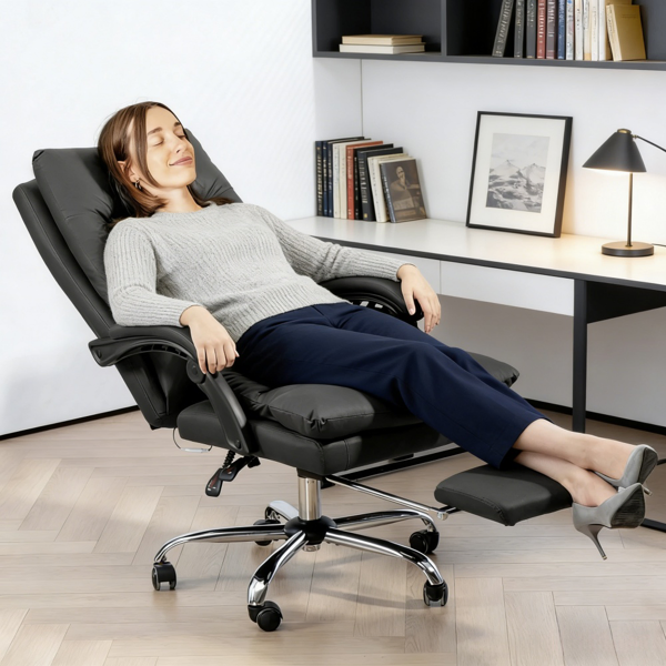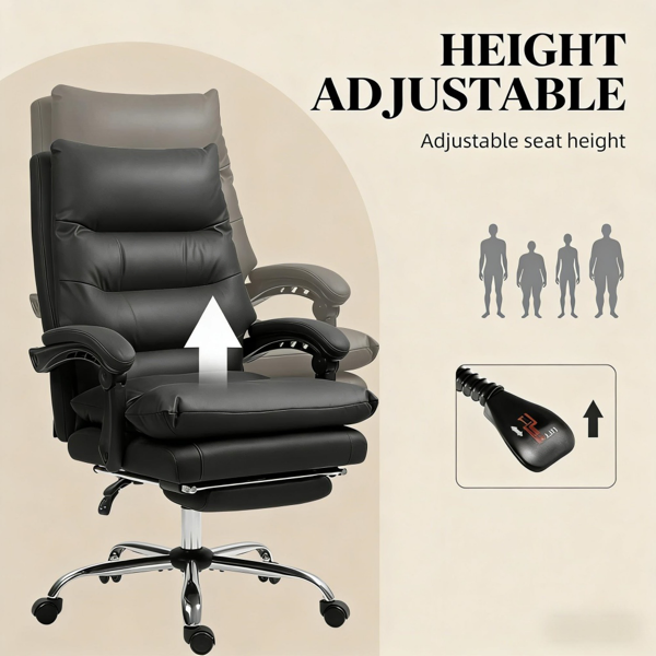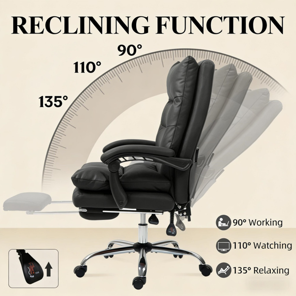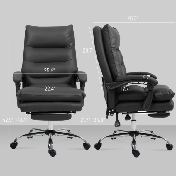 Features: - Six vibration massage points with five modes and lumbar heating to relax your body - Take a break and stretch out with a 135° recline angle and footrest - Heating function targeted the lower back - Curved backrest and double-tier padding provide extra support - Adjustable seat height to fit your comfort - Use massage with a wired remote control - Leathaire is soft, comfortable, easy-care, and resistant to the wear and tear of busy households - Swivel wheels and seat ensure easy and quick mobility - Assembly required Specification: - Color: Black - Material: Leathaire (100% Polyester), Foam, Multi-layer Board, Steel - Overall Dimension: 25.5" W x 28.25" D x 43" -46" H - Reclining Dimension: 24.75" W x 60.25" D x 38.5" -41.75" H - Seat Size: 22.5" W x 17.75" D - Seat Height: 21.75" -24.75" - Armrest Height to Seat: 6.75" - Back Size: 20" W x 28.75" L - Seat Thickness: 7" - Back Thickness: 6.75" - Cord Length: 5.9 ft - Weight Capacity: 265 lbs - Input: 100-240V, 50/60Hz - Output: 12V/1A, 12W