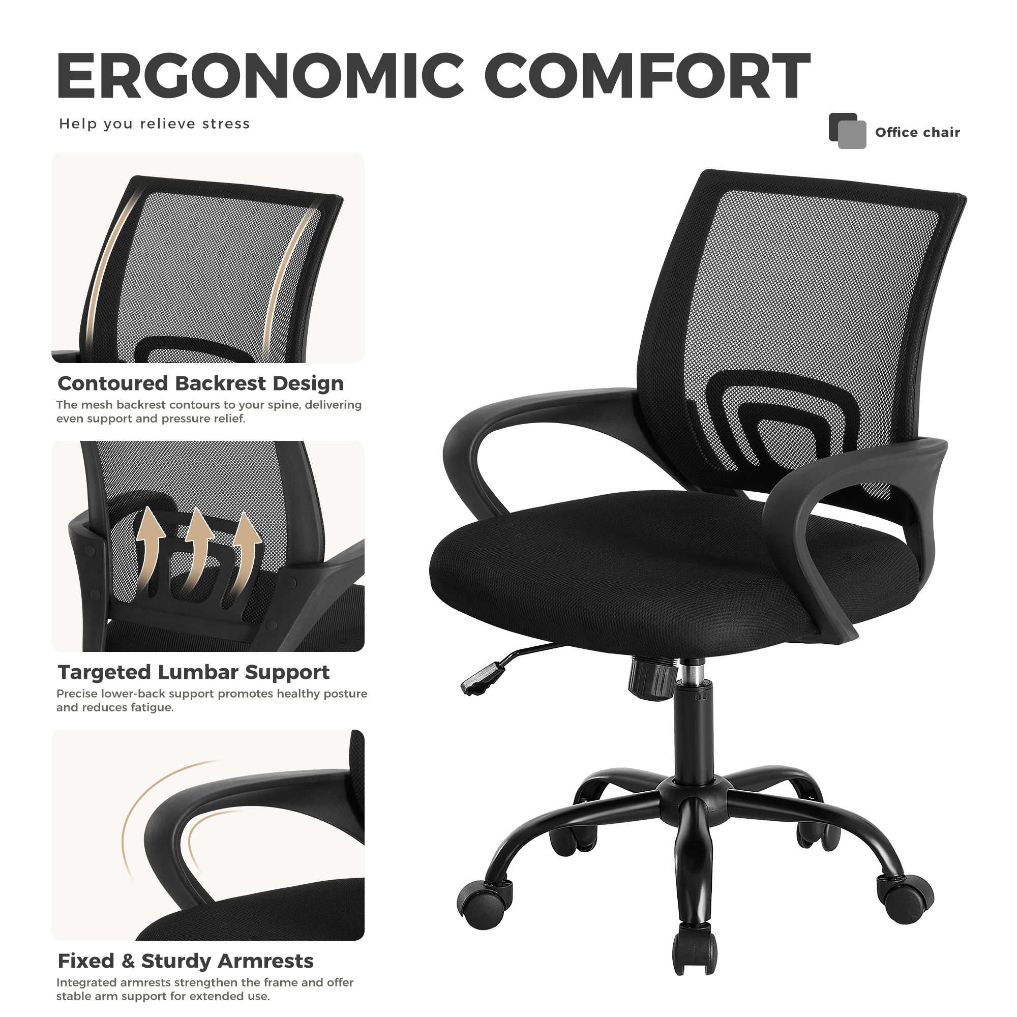 It conforms to the natural curve of the waist and back, providing scientific support for the middle back and waist, effectively relieving the soreness caused by prolonged sitting. The breathable mesh backrest dissipates heat without causing excessive sweating, and the high-elastic sponge seat pad does not collapse even after long sitting, offering comfort and spinal protection.