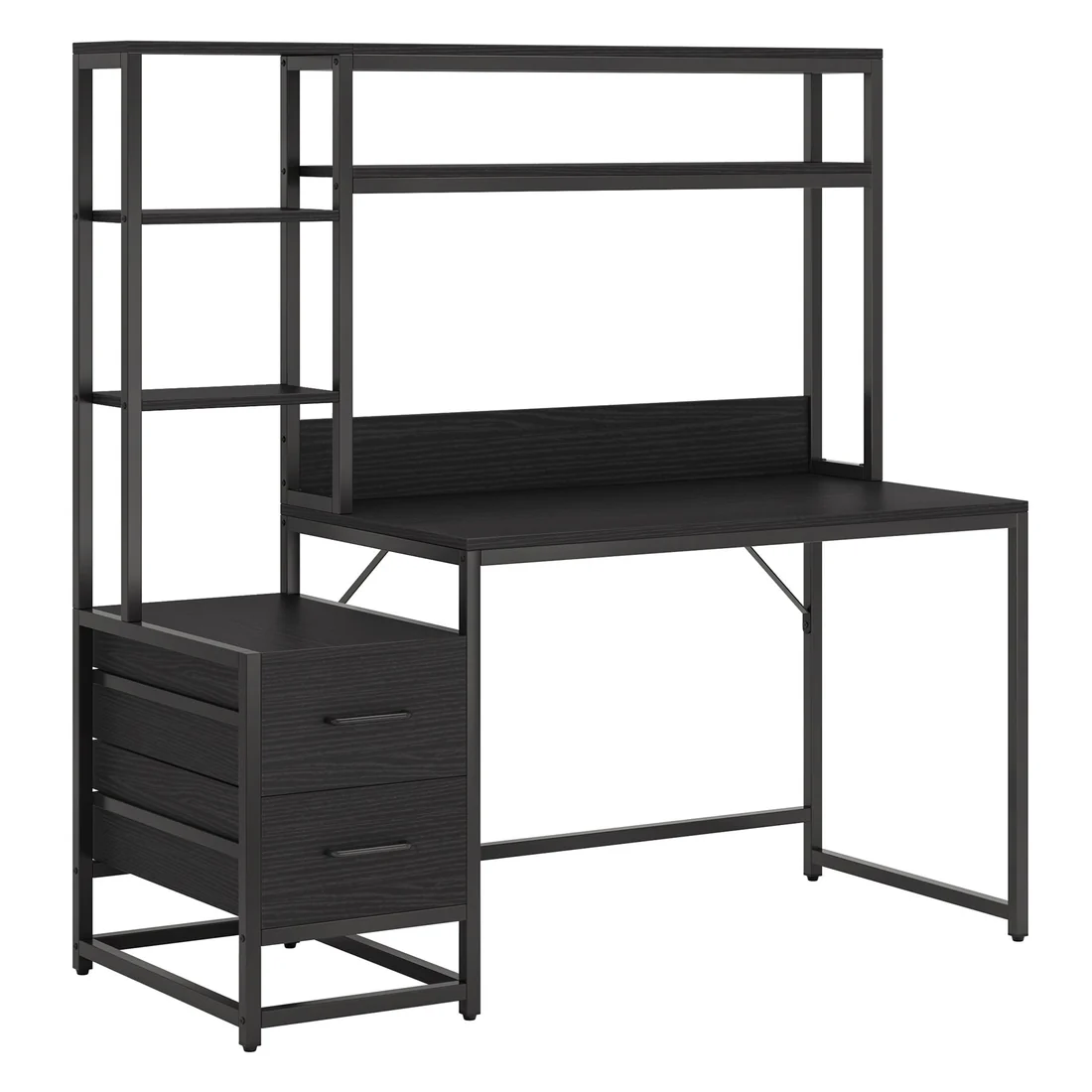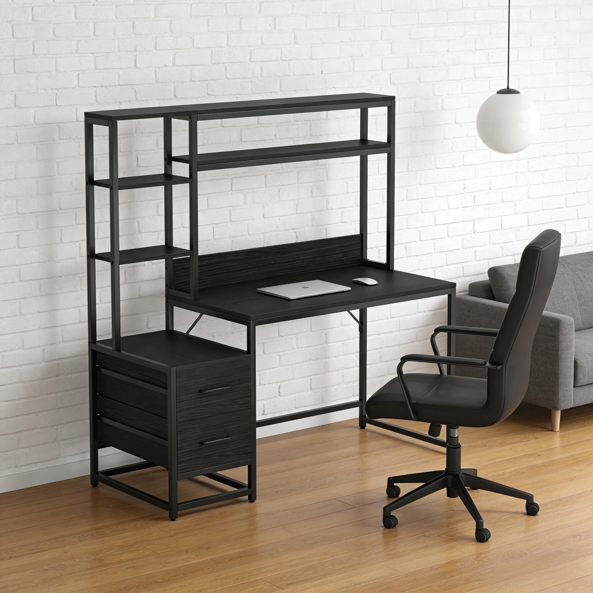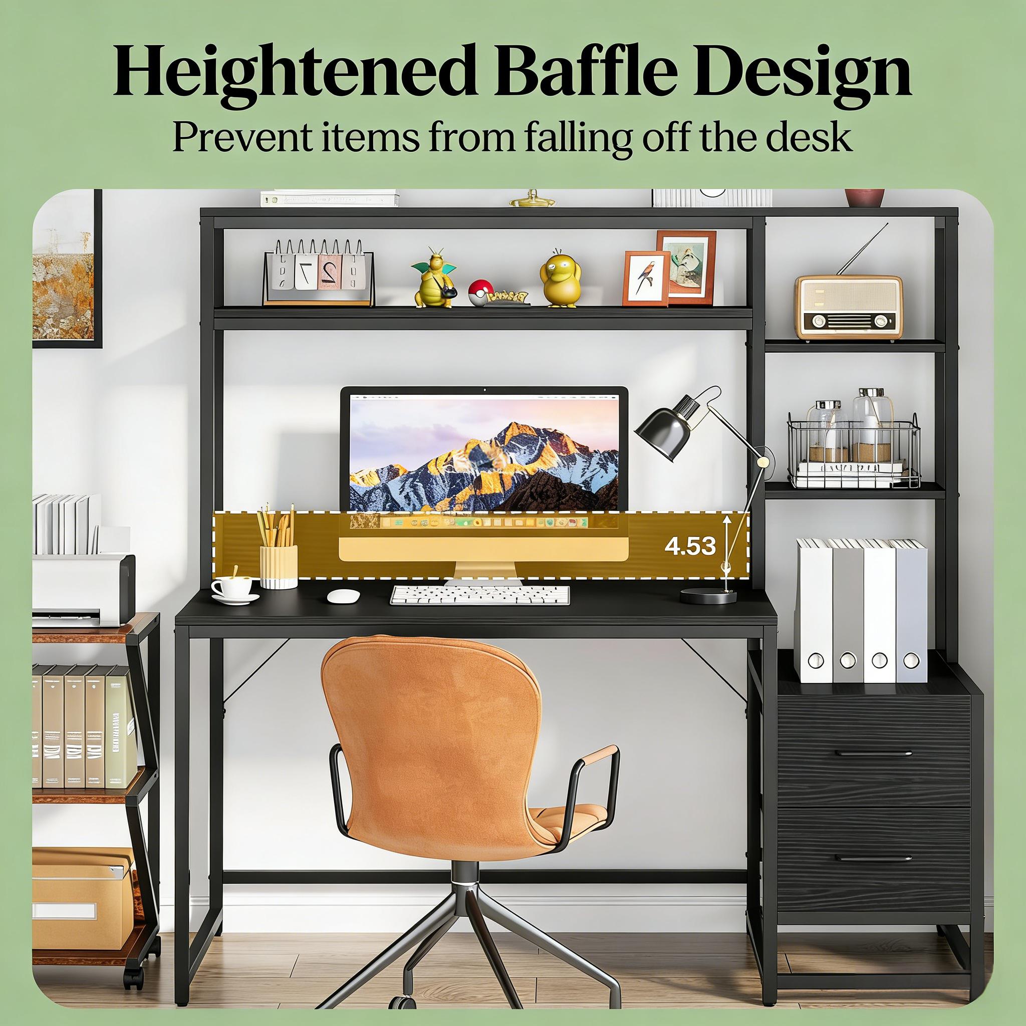 Important Reminder!!! 1) Attention: All products in our store do not support Canada self pickup ordering. Please do not create shipping labels for Canada. Our American products do not support self pickup to Canada 2)We do not ship to Alaska, Hawaii, US protectorates (e.g., Puerto Rico), P.O. boxes, or APO/FPO addresse 3)We don’t accept non-defective remorse returns All-in-One Computer Desk - Our multifunctional desk, featuring 2 drawers, a top hutch, and storage shelves, provides a versatile workspace suitable for computer use, studying, writing, or gaming. Enhanced Workspace - Showcasing a spacious desktop with a heightened baffle to prevent item spillage, the sleek design also offers ample legroom for a comfortable and unhindered work experience. Ample Storage - Enhance your workspace with an eye-catching display of books, artwork, and personal items on the top hutch and side shelves. The two drawers offer concealed storage, keeping your desk tidy. Durable and Stylish - Blending a rustic veneer finish with a black metal frame achieves a stylish, industrial look while ensuring durability and stability. The compact design complements any home decor.