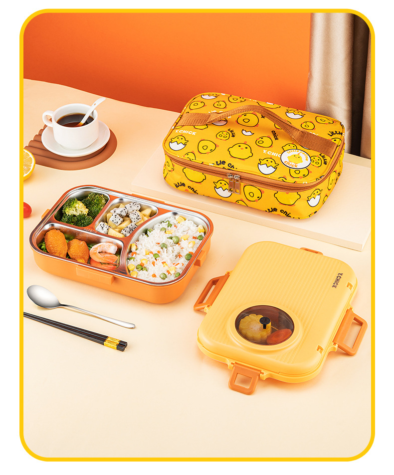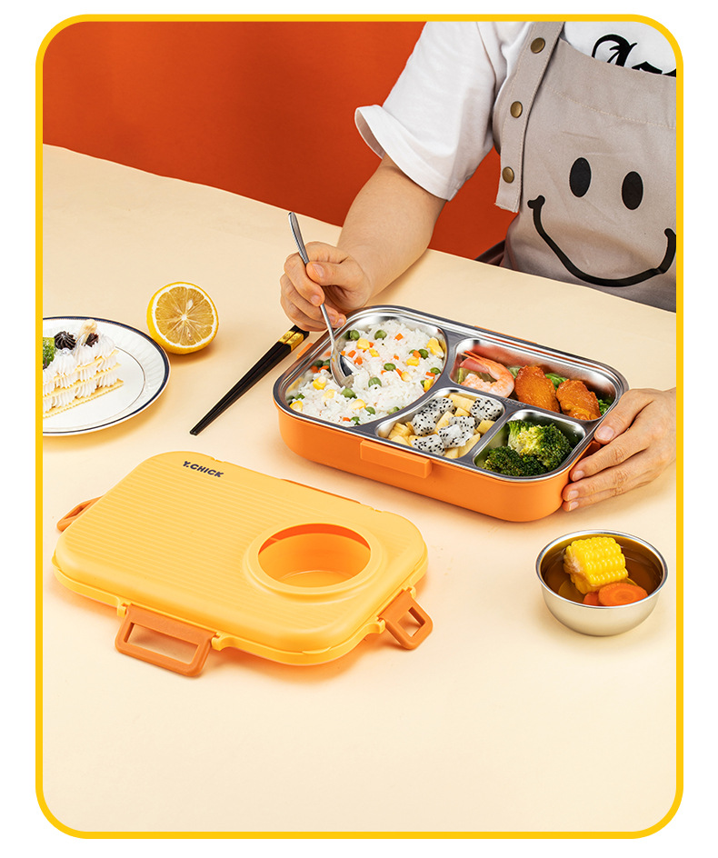 Double-layer lunch boxes with different storage space can be used to place different foods to meet children's lunch and dessert after dinner. The first layer is a stainless steel plate without cross taste, the second layer is used to place cookies, cakes and snacks, and the sealed soup bowl can also be used as a fruit bowl