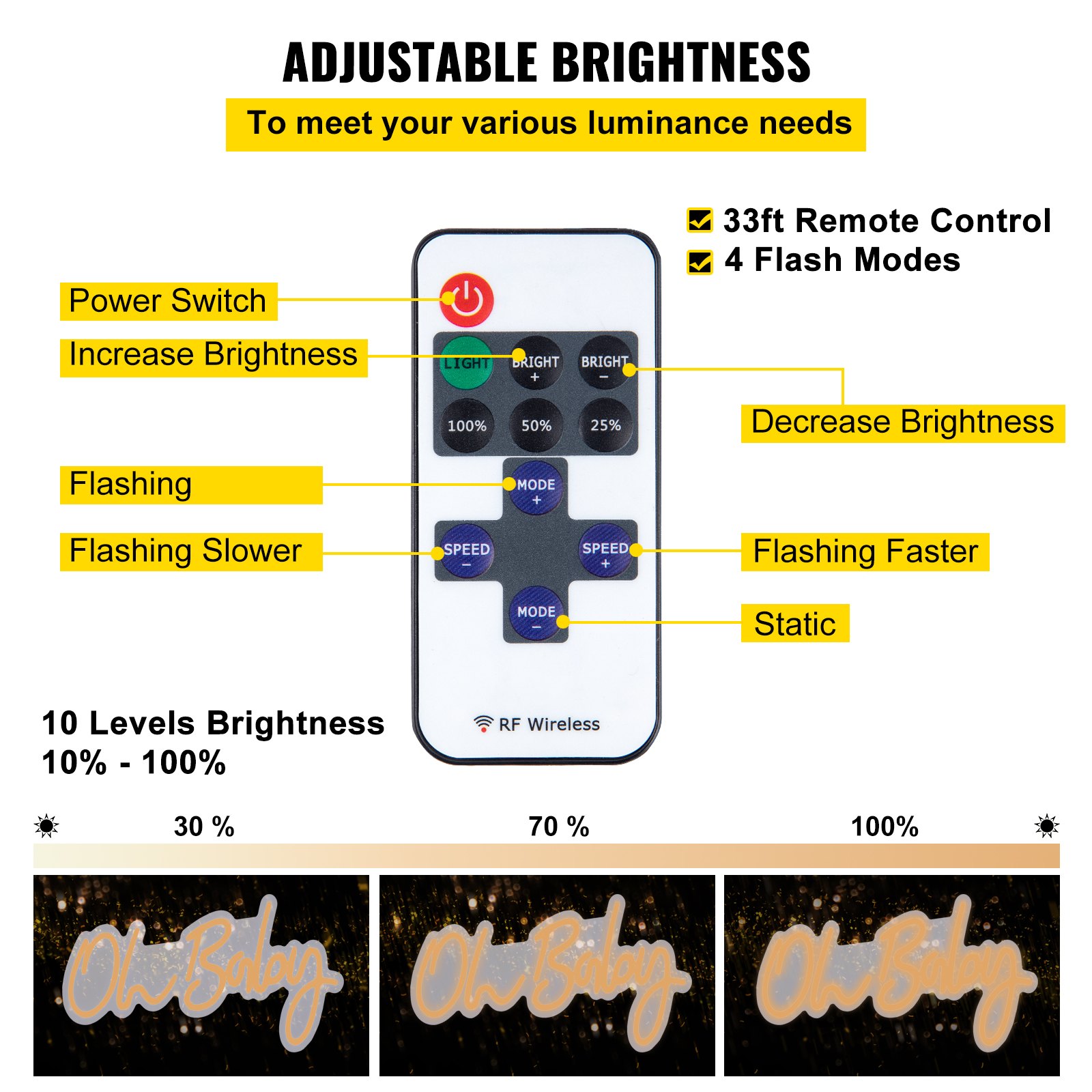 4 Flash Modes & Adjustable Brightness: Our neon sign is adjustable via the remote control, press the “MODE” and “SPEED” buttons to choose 4 modes of lighting effects, which are slow flashing, medium flashing, fast flashing, and gradient flashing. The brightness can also be adjusted from 10% to 100% according to your various needs. Remote control distance: 33 ft/10 m.