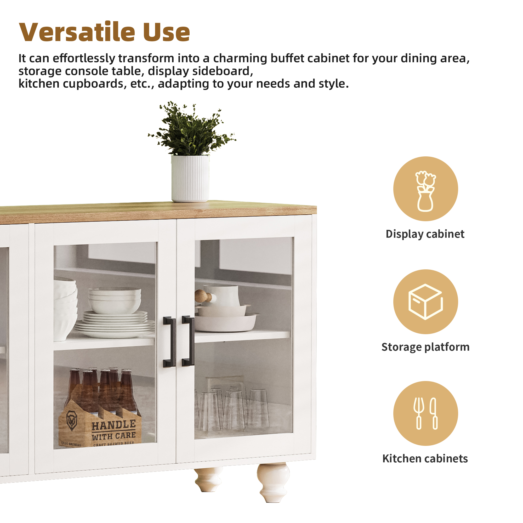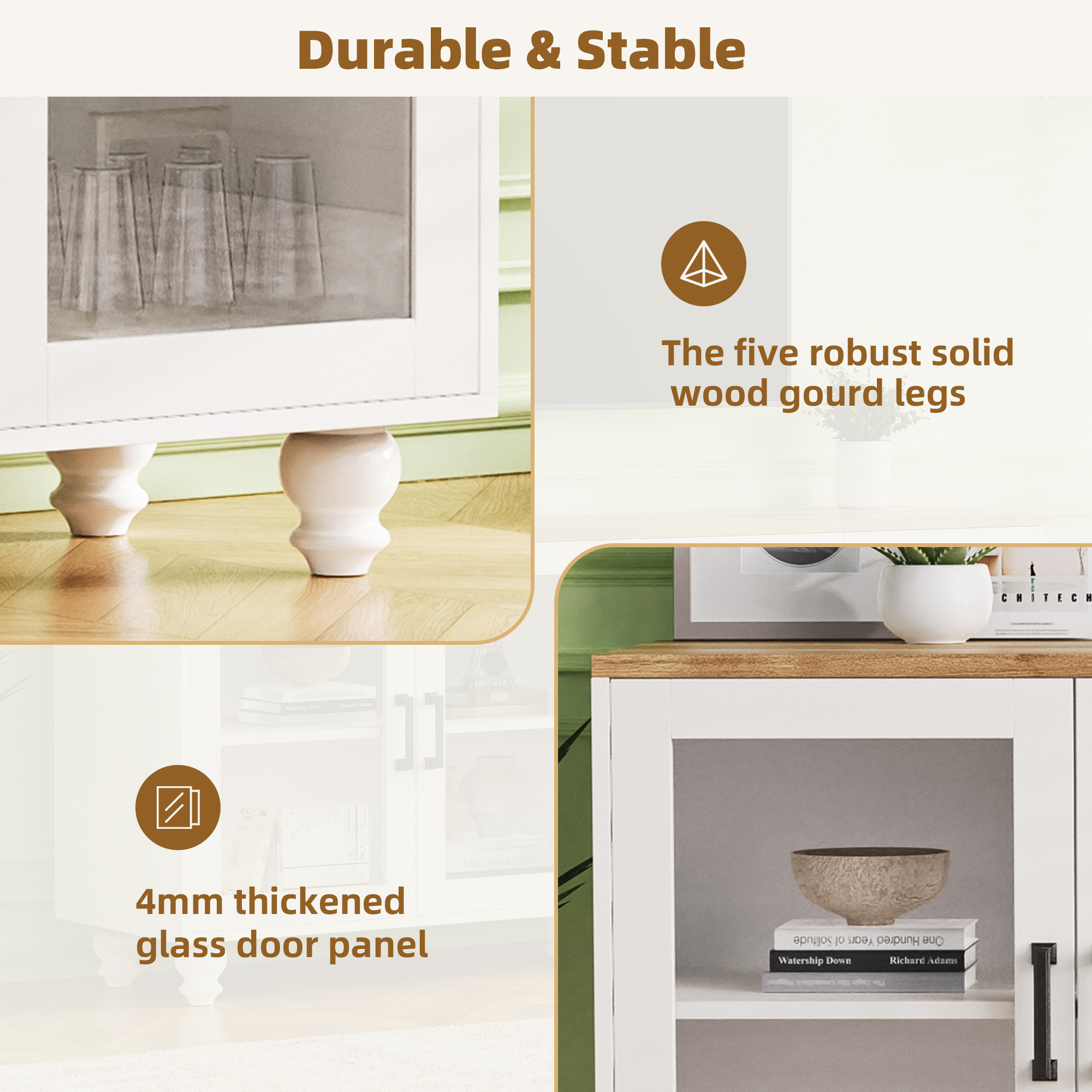 Combining premium materials with exquisite craftsmanship, this cabinet is solid enough to offer long lasting using satisfaction with 4mm thickened glass door panel. The five robust solid wood gourd legs not only significantly increase the weight capacity, but also provide stability even on uneven fl