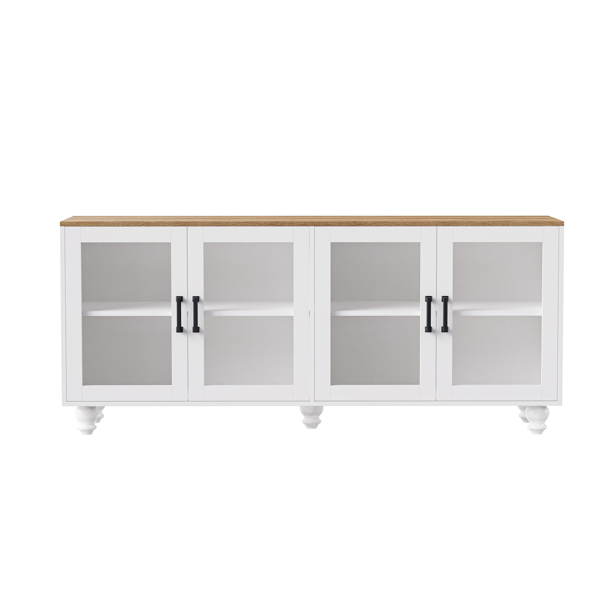 Product Name:ON-TREND Farmhouse TV Stand with Tempered Glass Doors for TVs Up to 70", Versatile Sideboard with Adjustable Shelves, Elegant Buffet Cabinet with 5 Solid Wood Gourd-Shaped Legs for Living Room, White