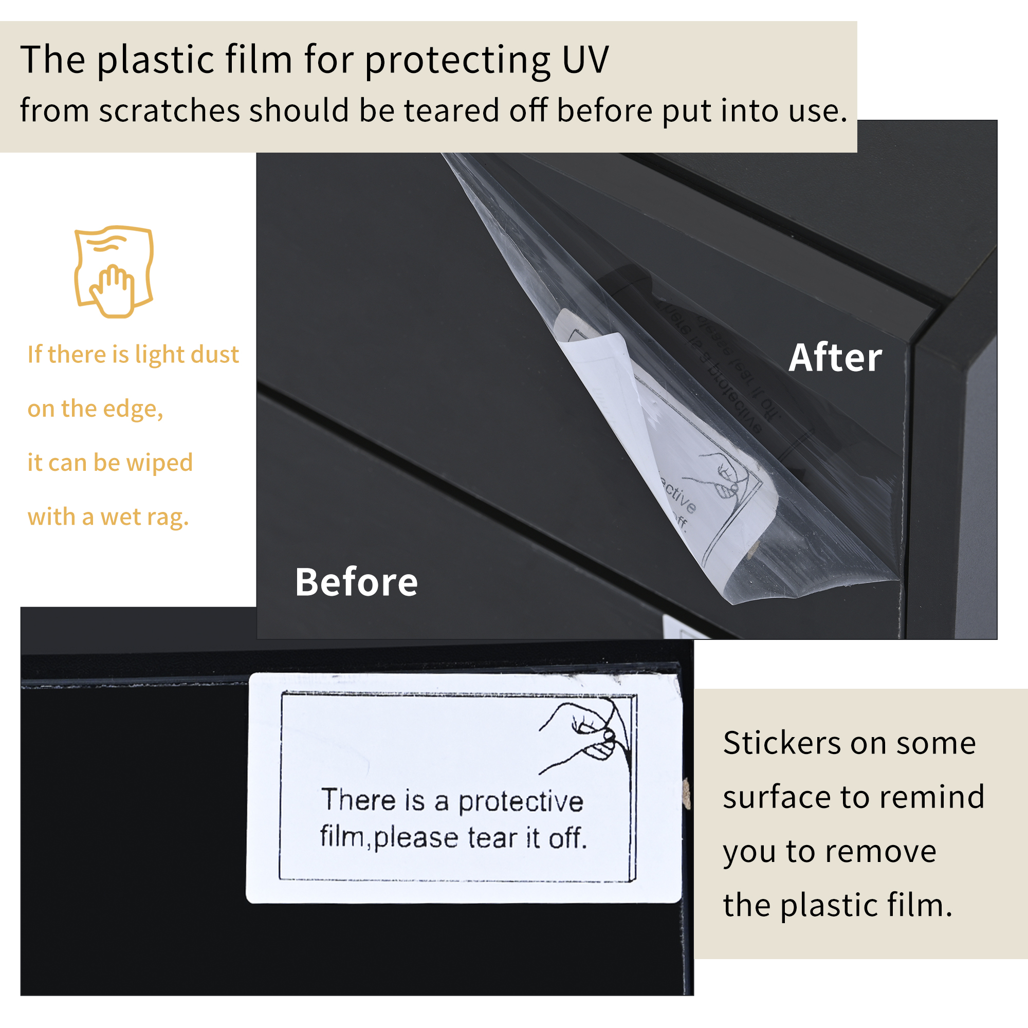 | Notice | The plastic film for protecting UV from scratches should be teared off before put into use. If there is light dust on the edge, it can be wiped with a wet rag. |