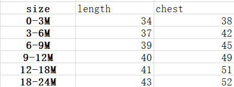 Suitable height: 0-3-S,3-6-M,6-9-L,9-12-XL,12-18-XXL,18-24-XXXL