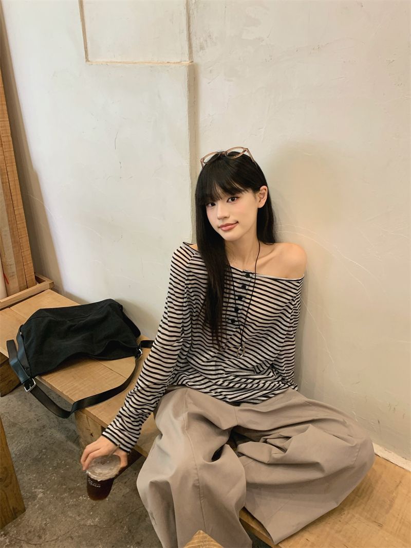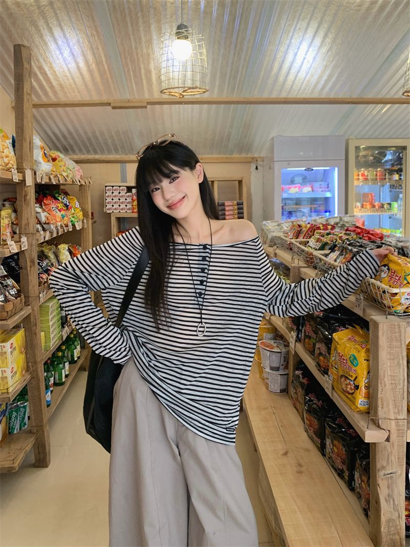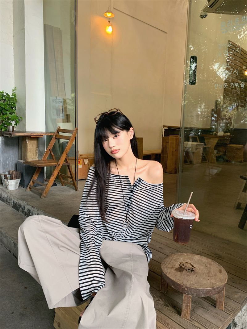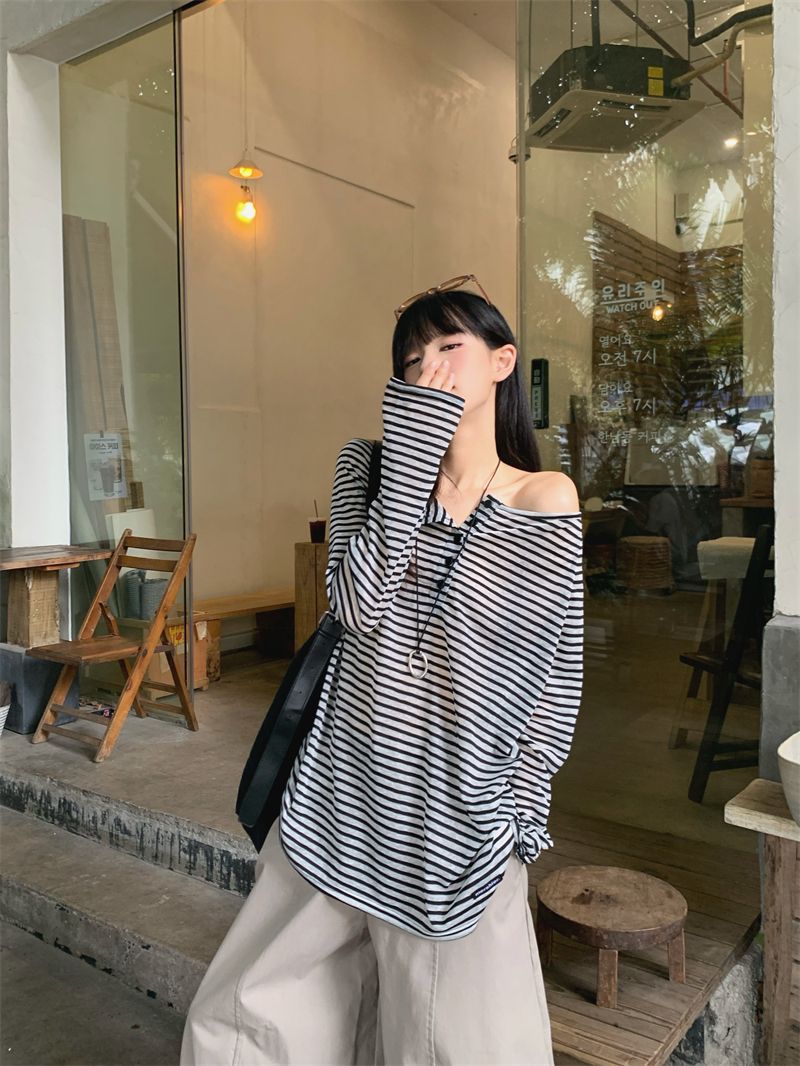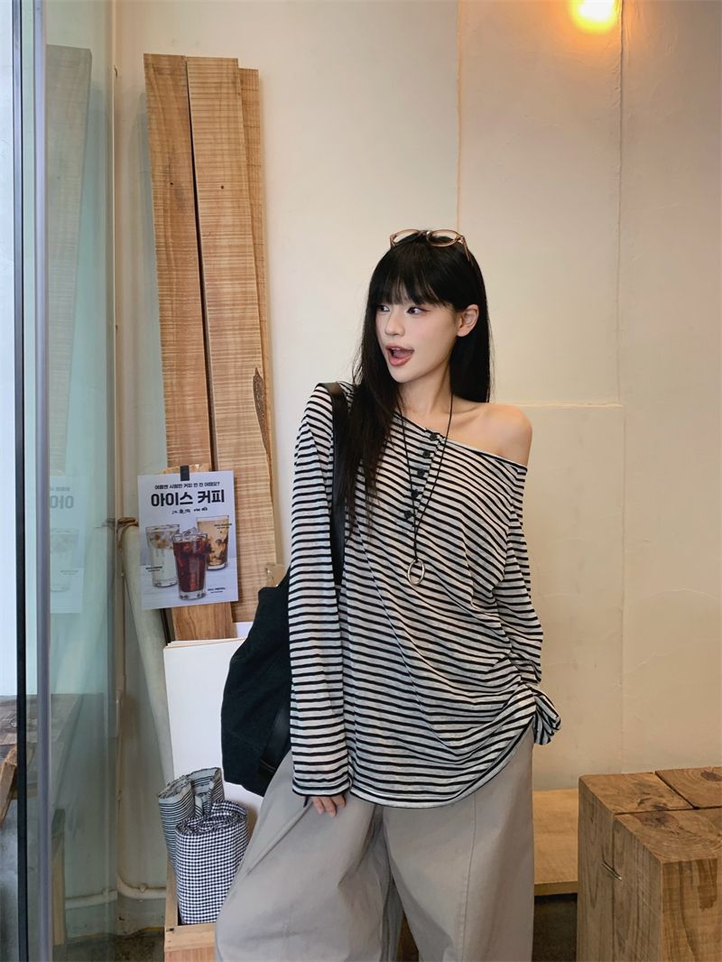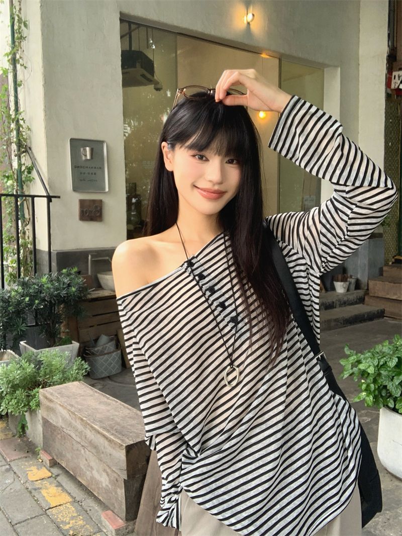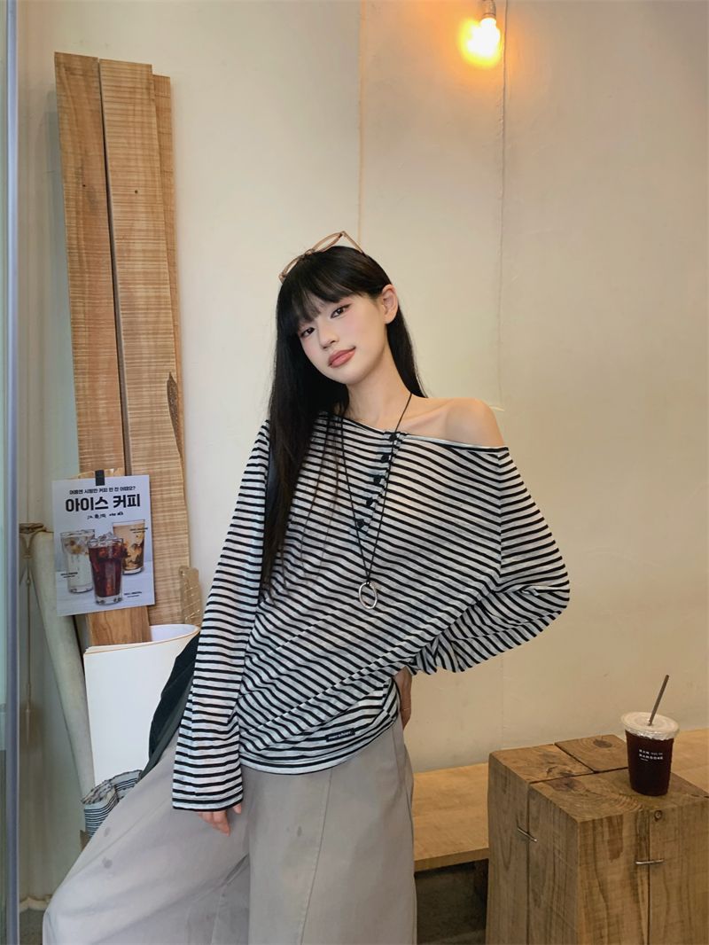 One-shoulder Thin Striped Slimming Base Shirt T-shirt For Women