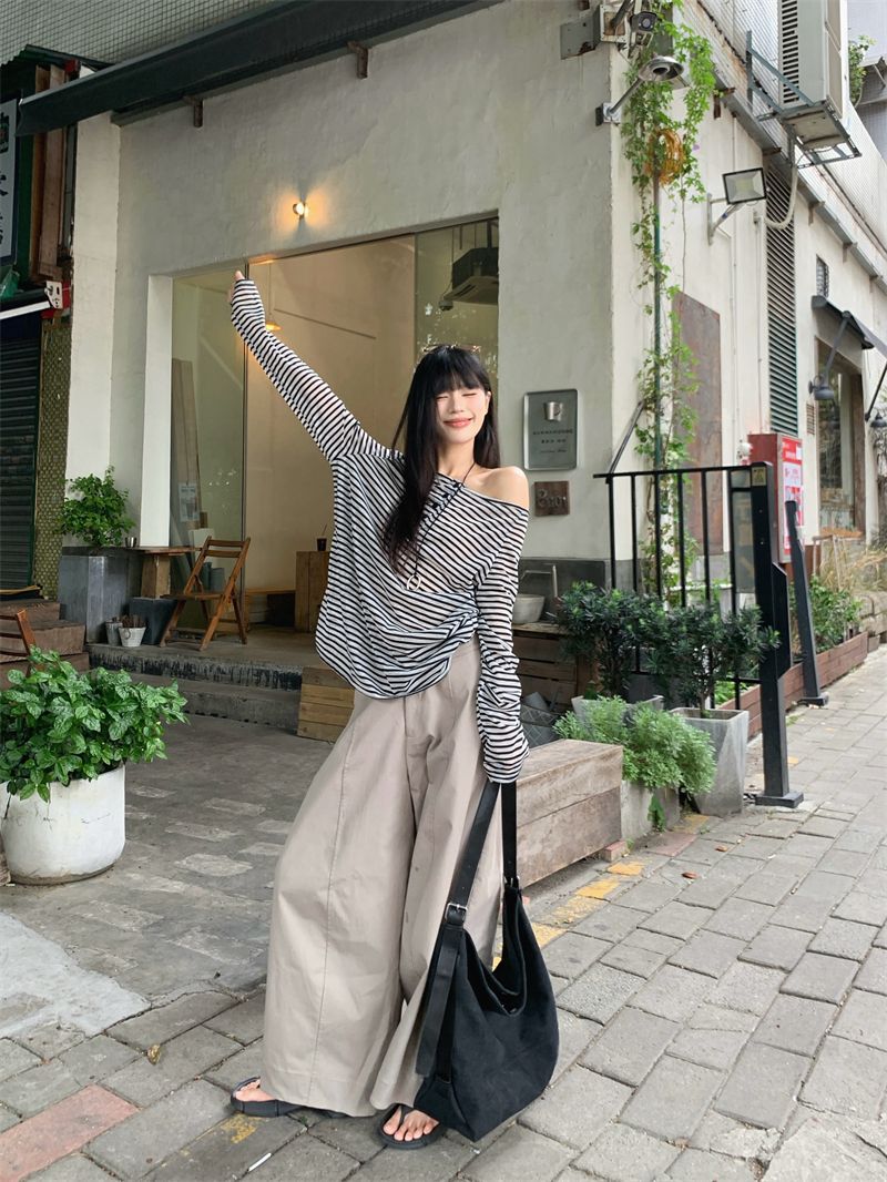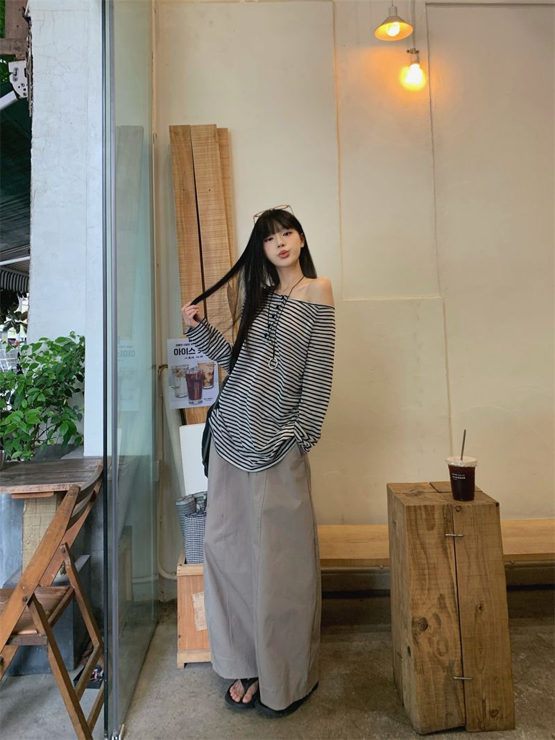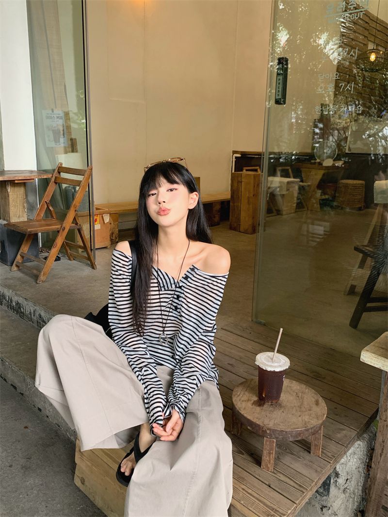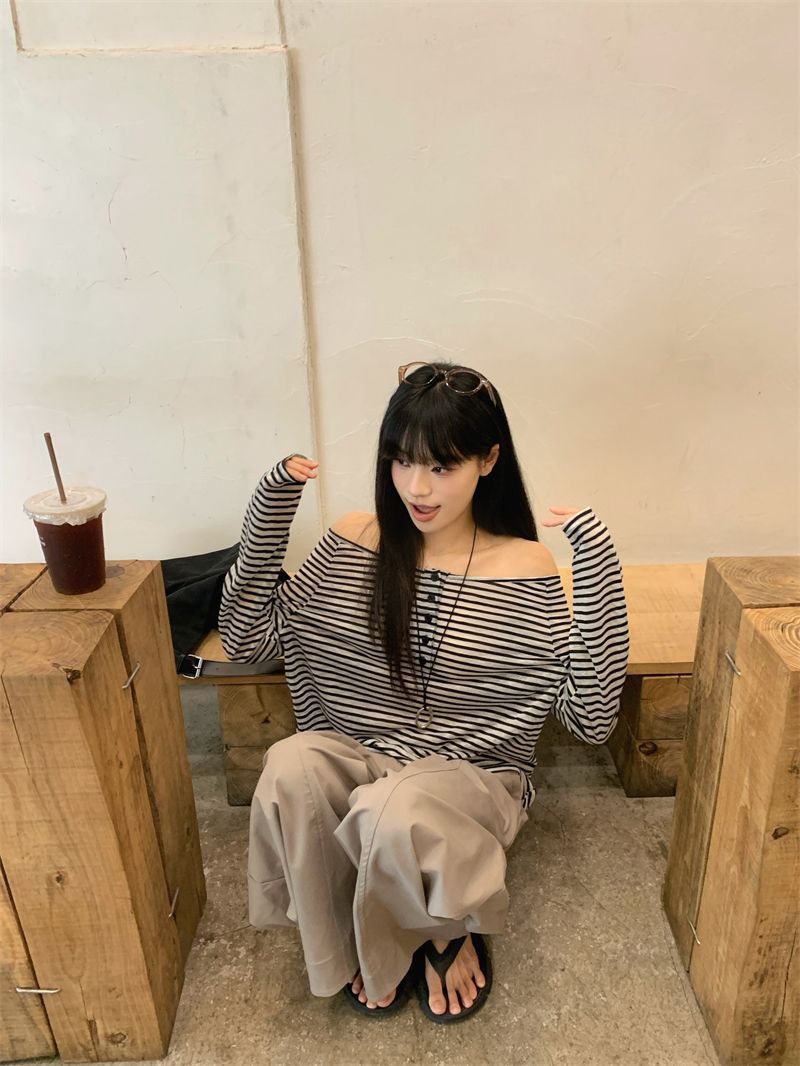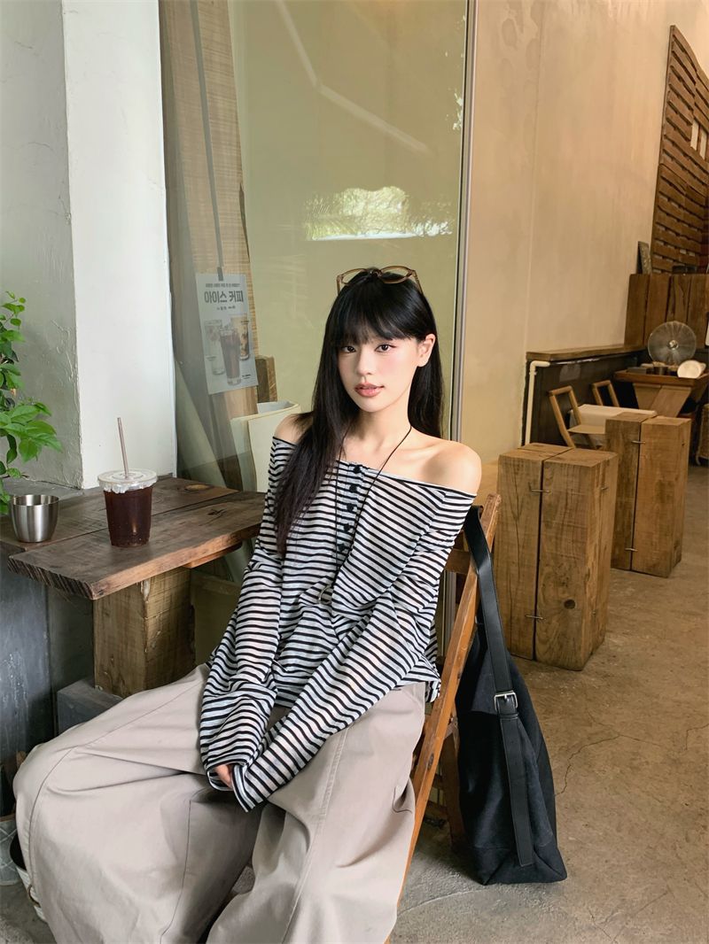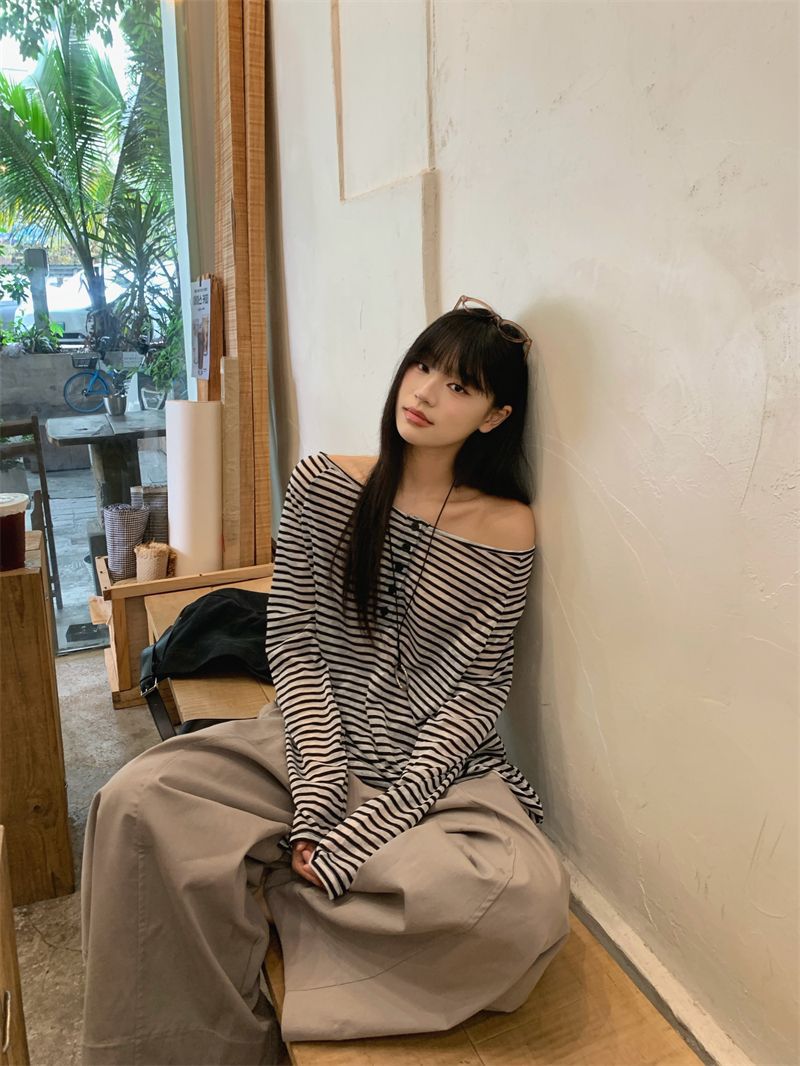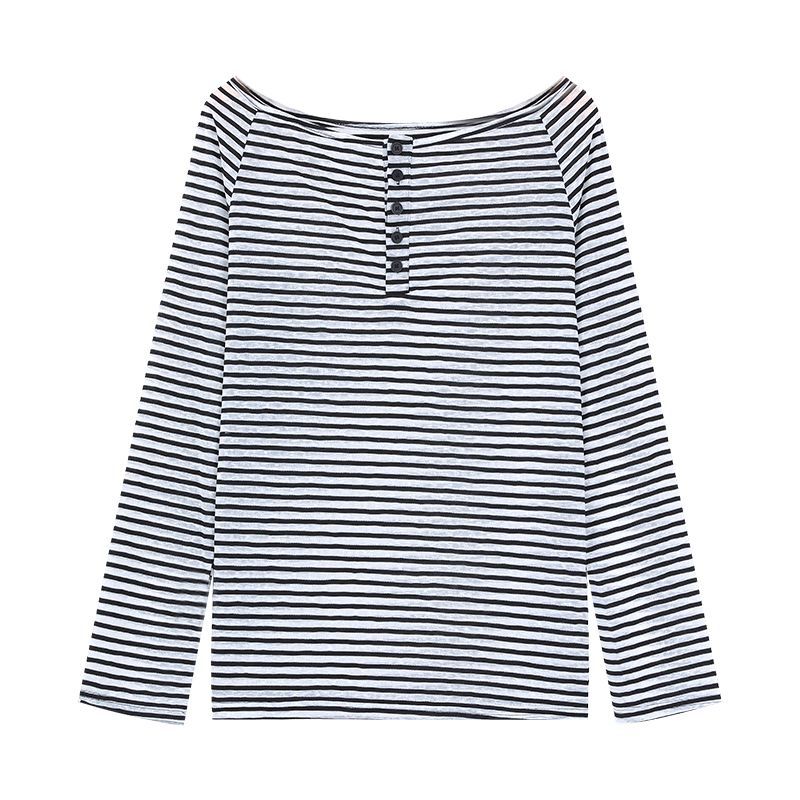 One-shoulder Thin Striped Slimming Base Shirt T-shirt For Women