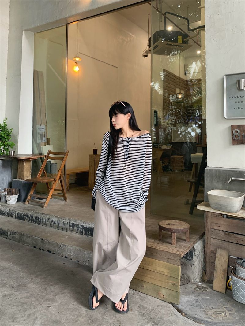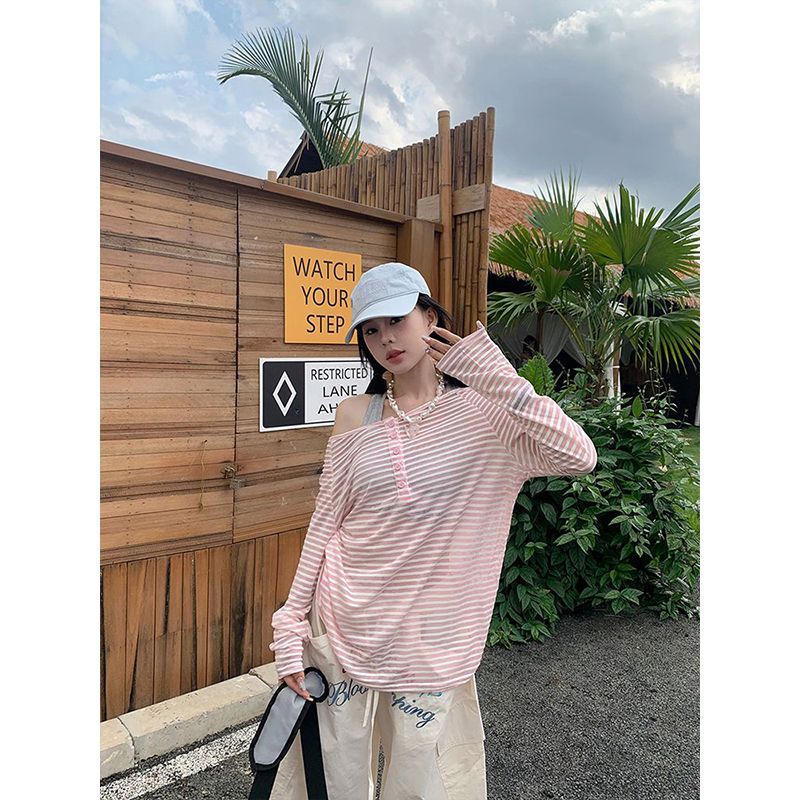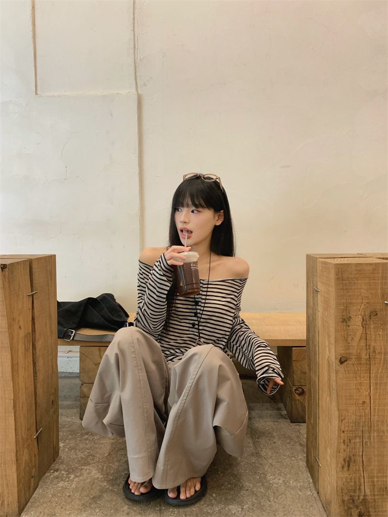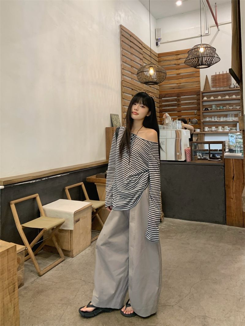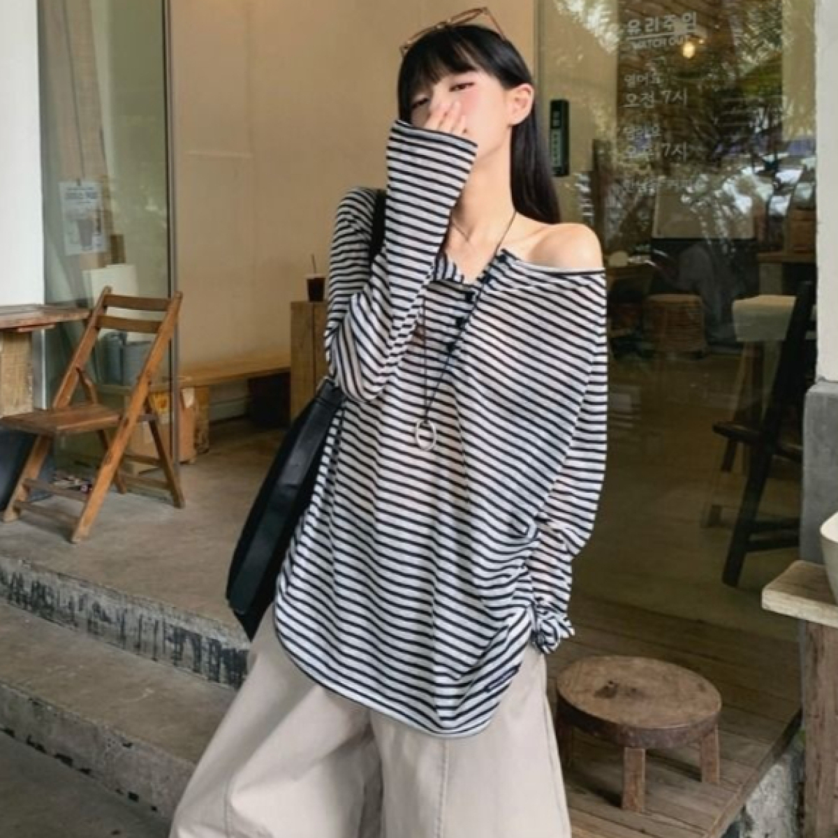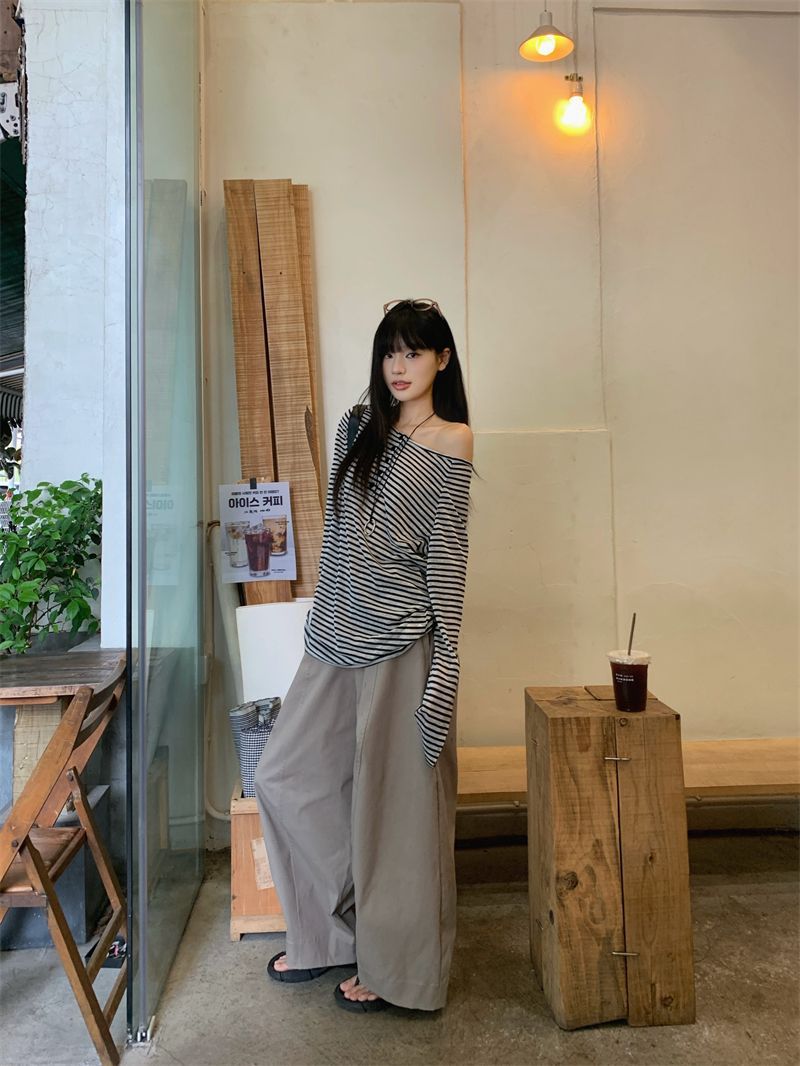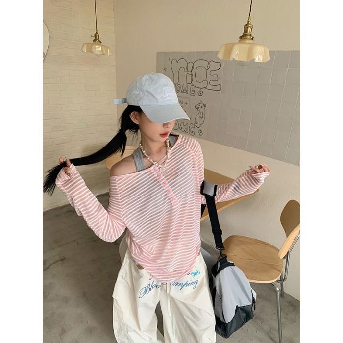 One-shoulder Thin Striped Slimming Base Shirt T-shirt For Women