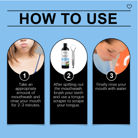 Our Coconut Mint Oil contains Cocos Nucifera(Coconut)Fruit Extract, Mentha Haplocalx Extract, Ascorbic Acid. It can quickly relieve oral discomfort and restore oral comfort. Strengthens tooth surface, reduces sensitivity issues, strengthens gum health, improves overall oral health, enhances tooth brightness, improves stain, protects vitamins, fights free radicals, and delays signs of aging. Its use method is very simple: take a proper amount of mouthwash for 2-3 minutes, spit out the mouthwash after brushing your teeth, scrape your tongue with a tongue scraper, and finally rinse your mouth with water. Double vitamin protection, fight free radicals, delay signs of aging, and quickly relieve oral discomfort.