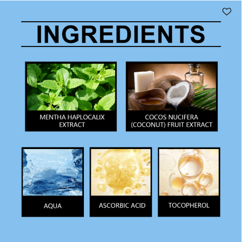 Composition | Cocos Nucifera(Coconut)Fruit Extract, Mentha Haplocalx Extract, Ascorbic Acid |