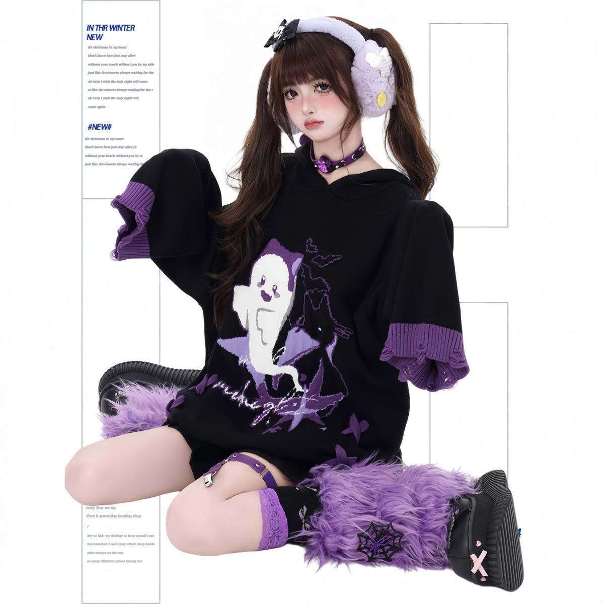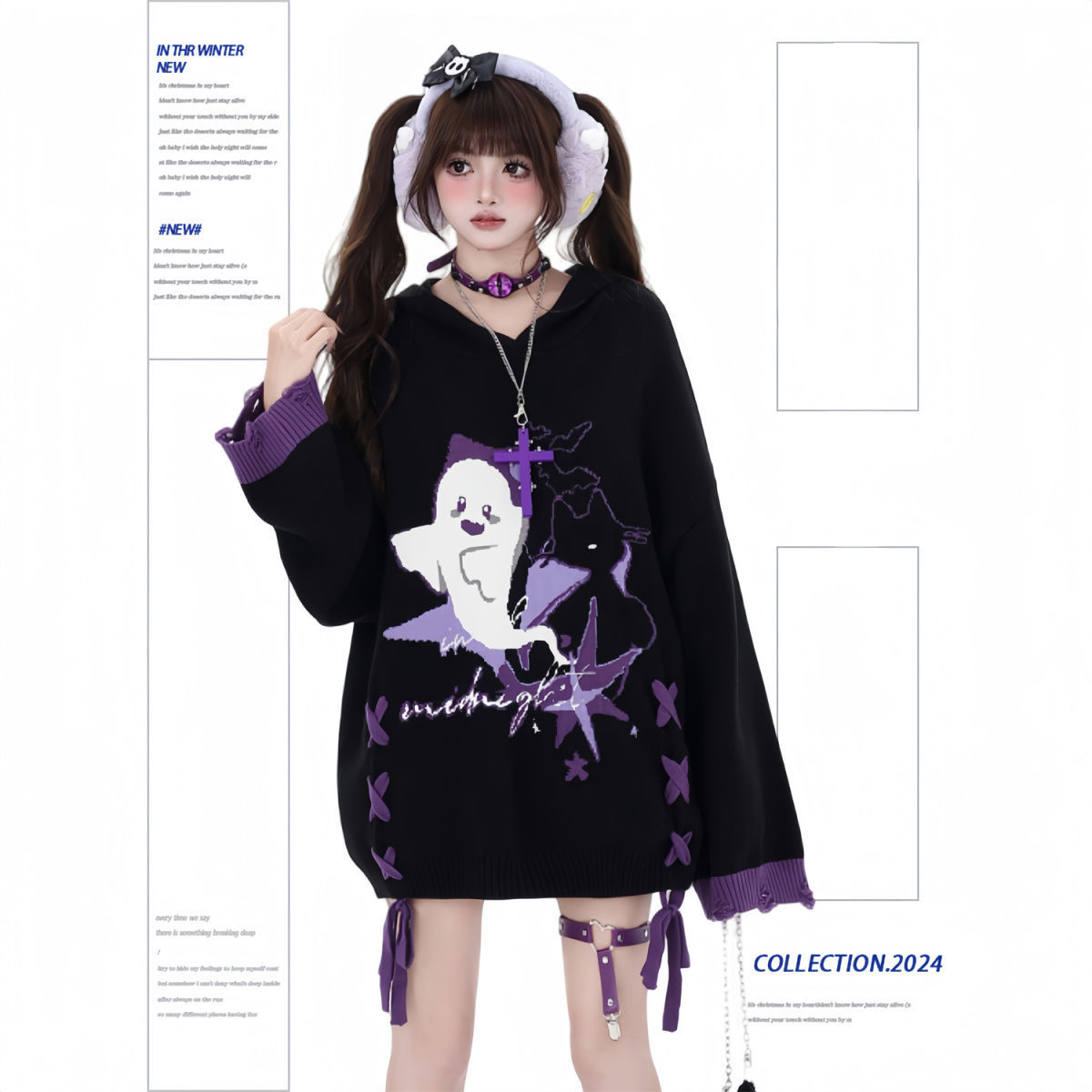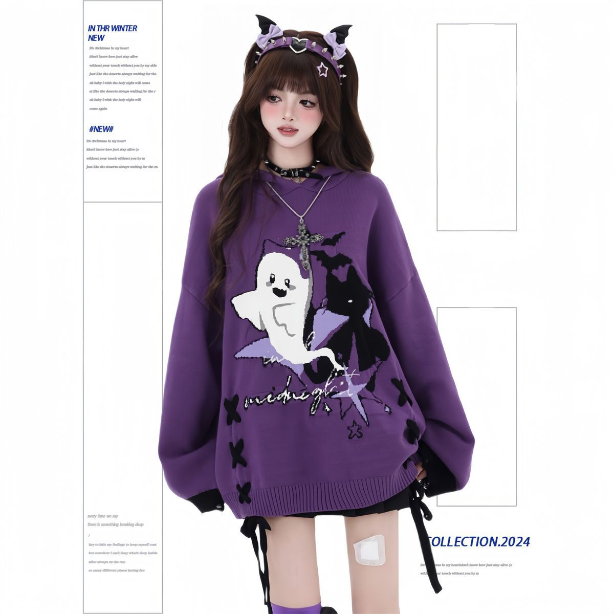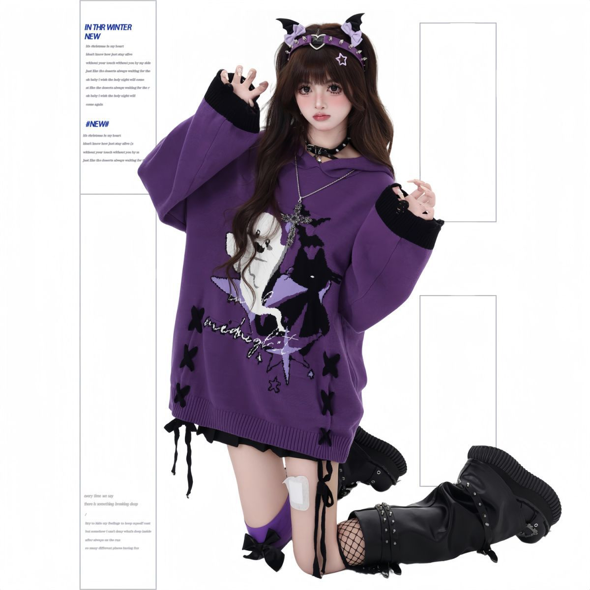 Original Black And Purple Contrast Color Lace-up Loose Sweater