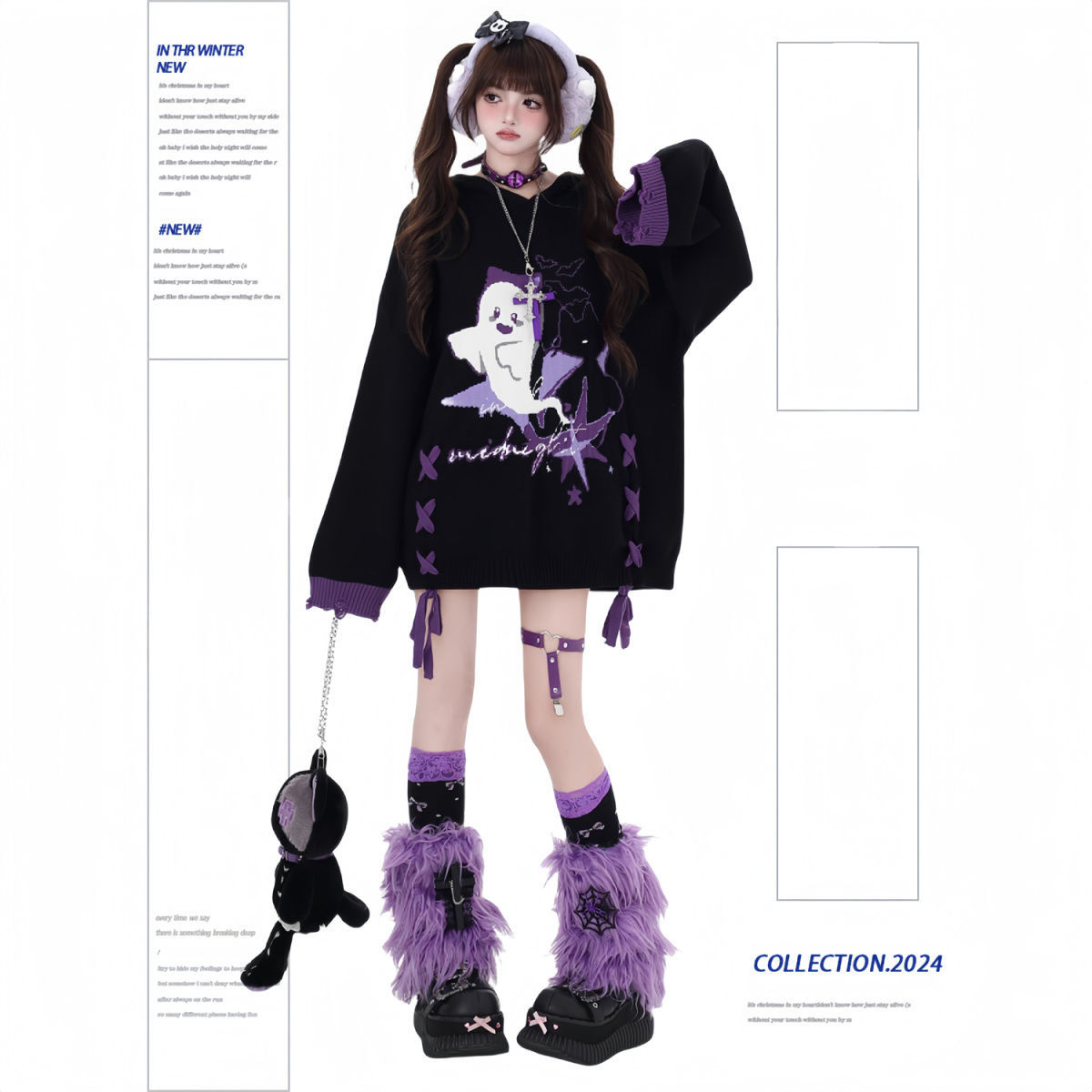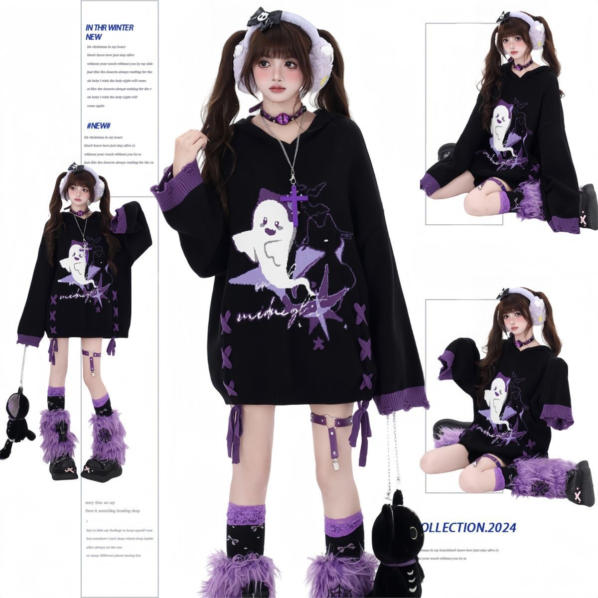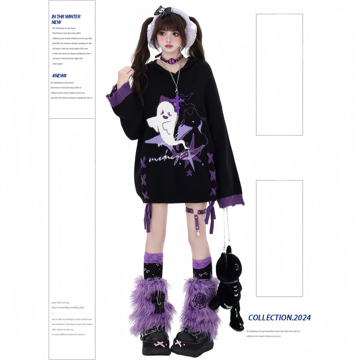 Original Black And Purple Contrast Color Lace-up Loose Sweater