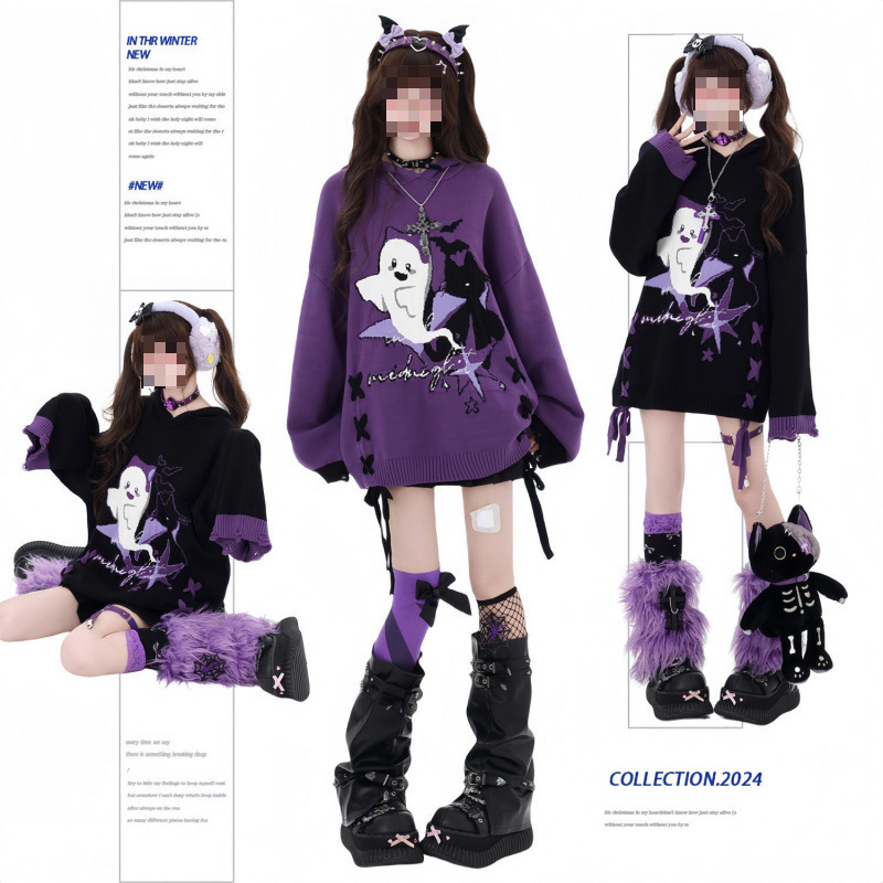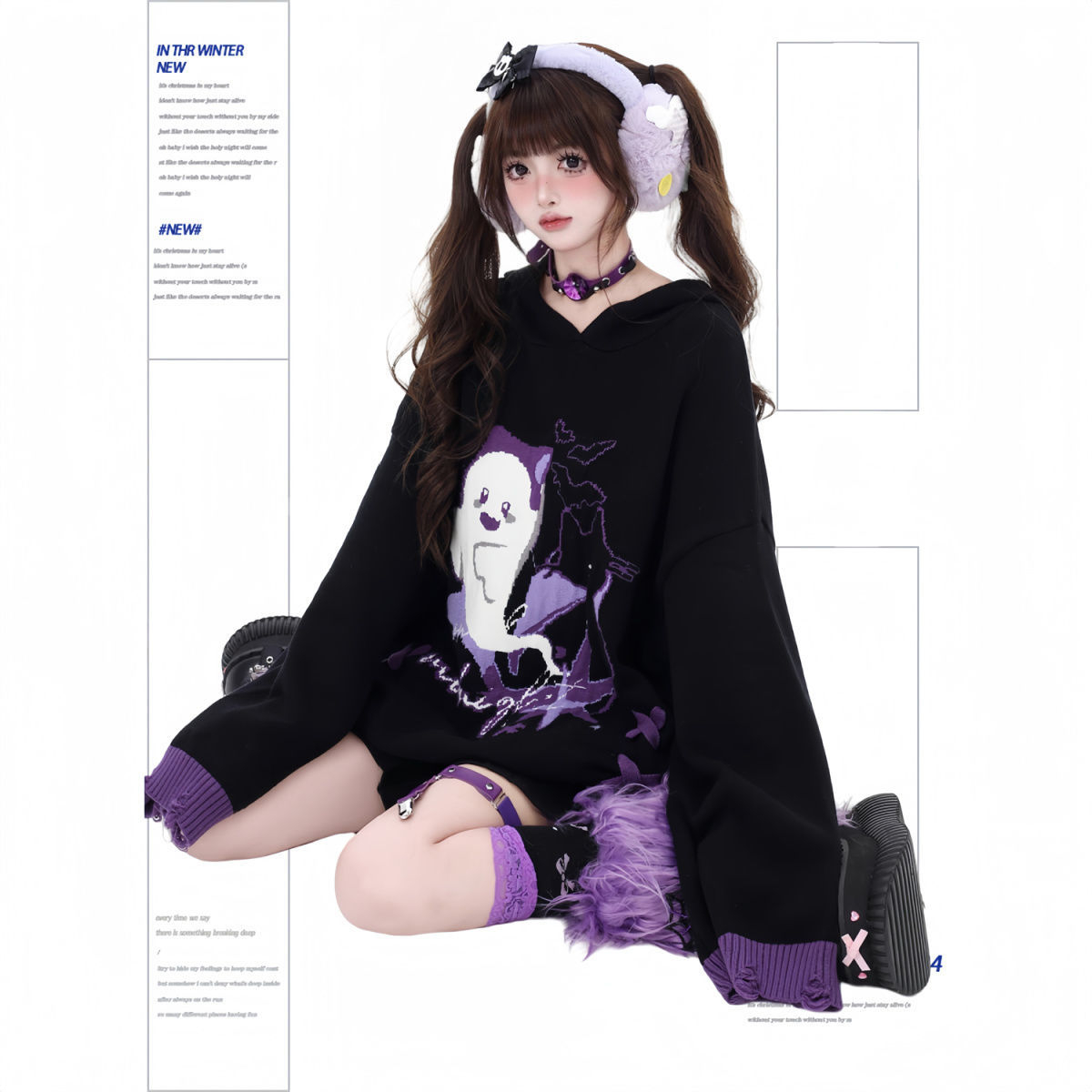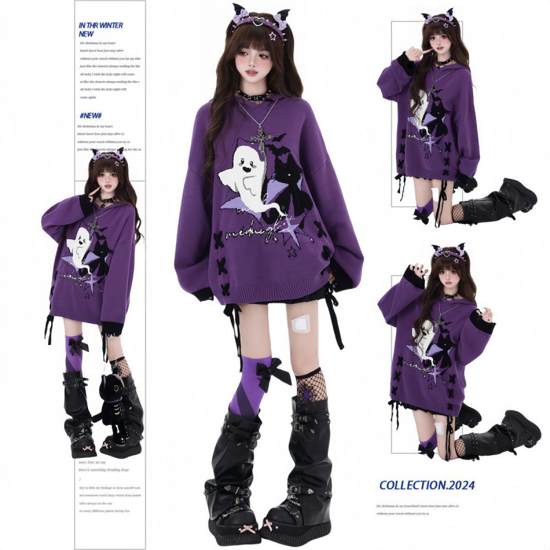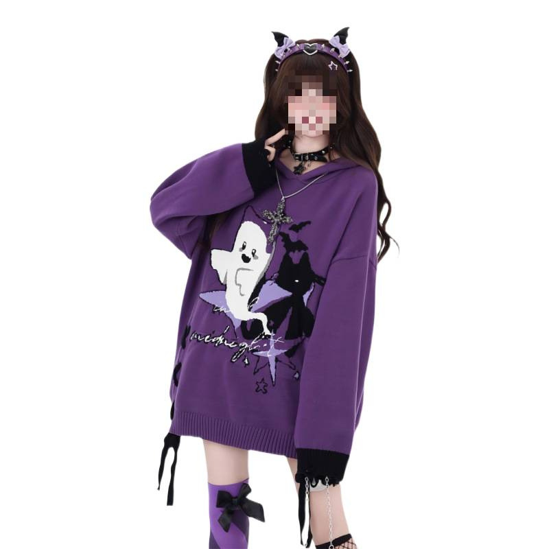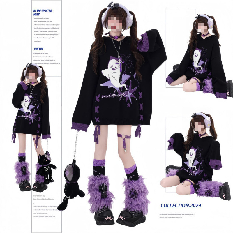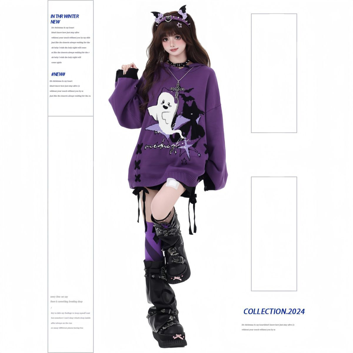 Original Black And Purple Contrast Color Lace-up Loose Sweater