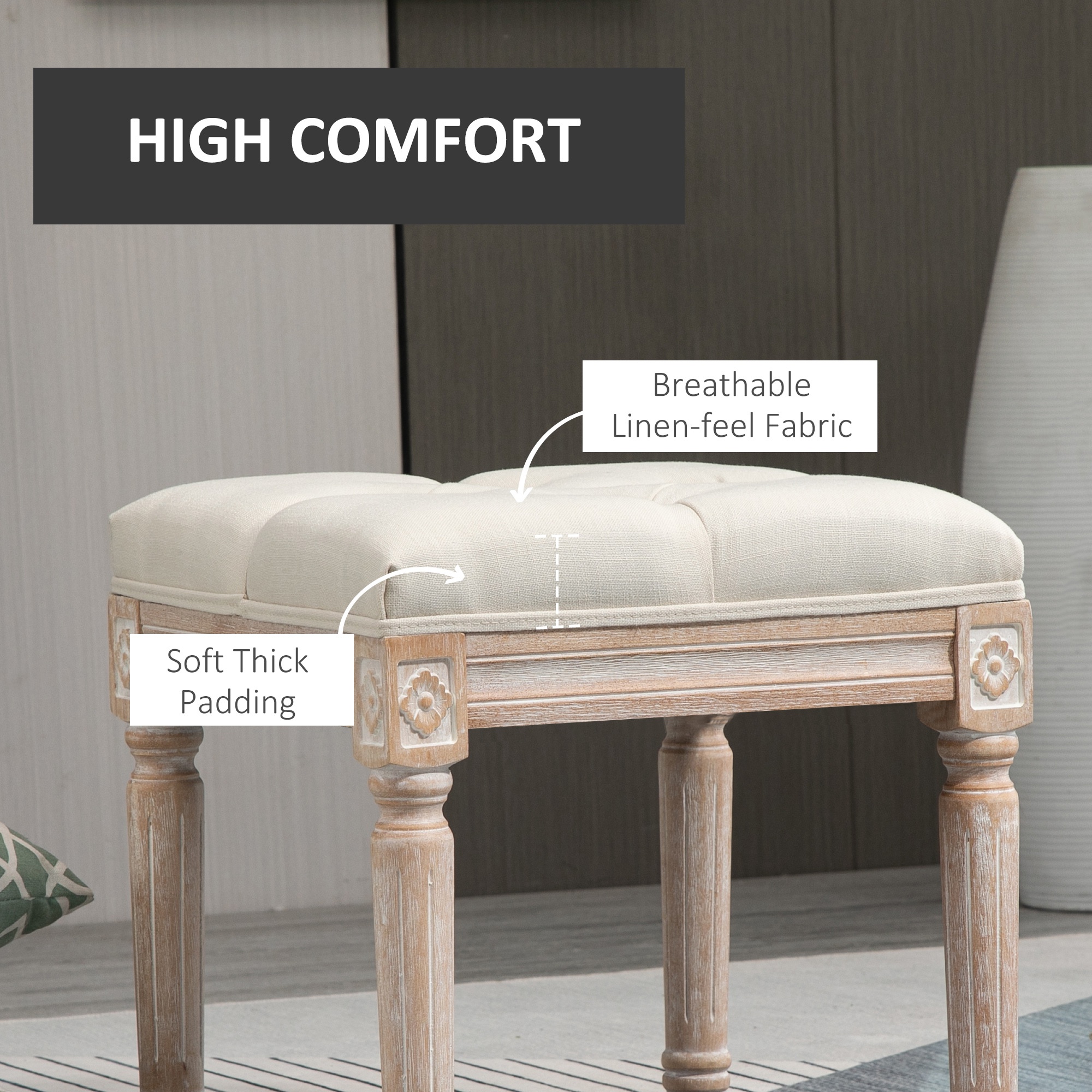 - VINTAGE DESIGN: Add a stylish accent piece to your living room, bedroom, and more. This ottoman stool has a tufted button top and cylindrical brushed wood legs with exquisite carved patterns for an elegant look.