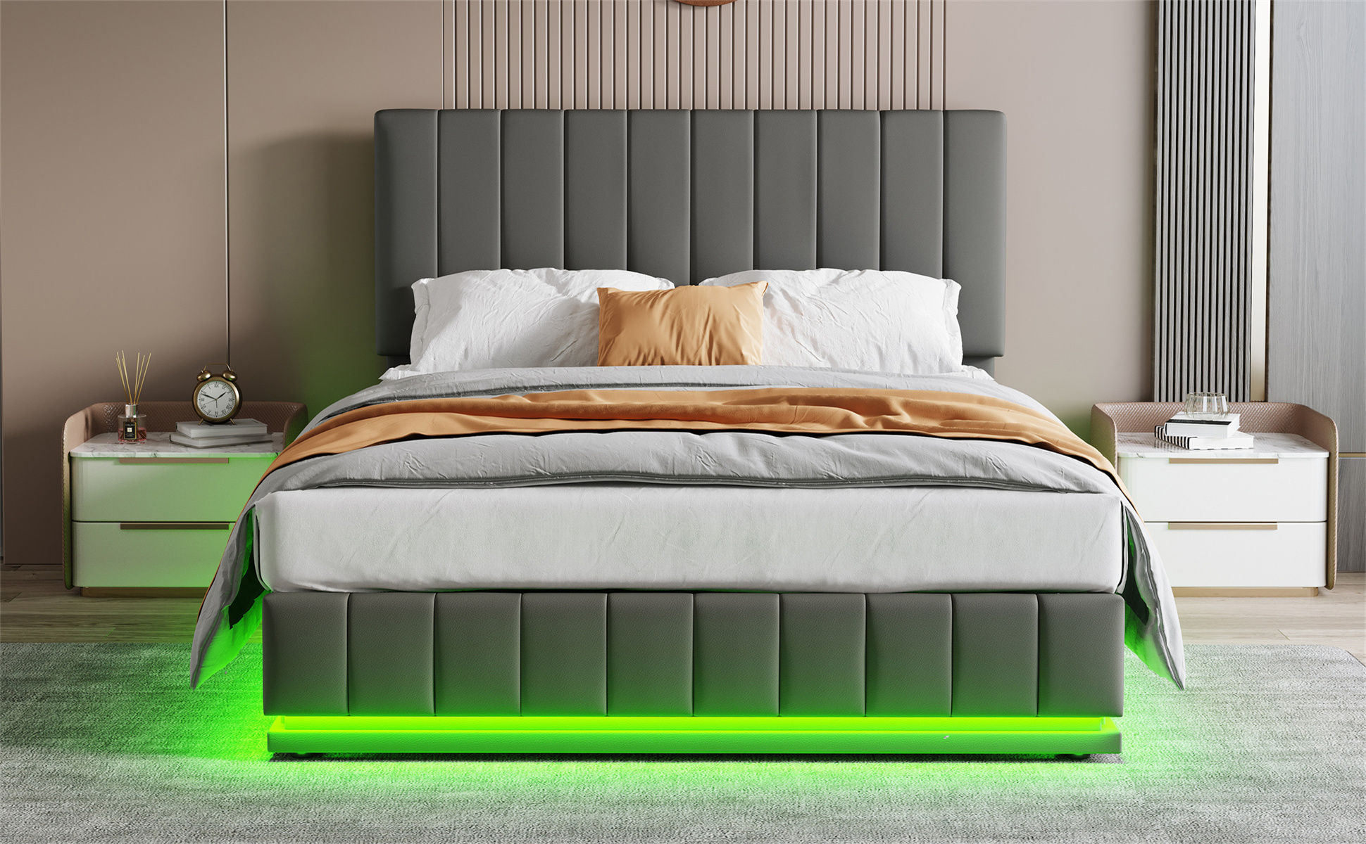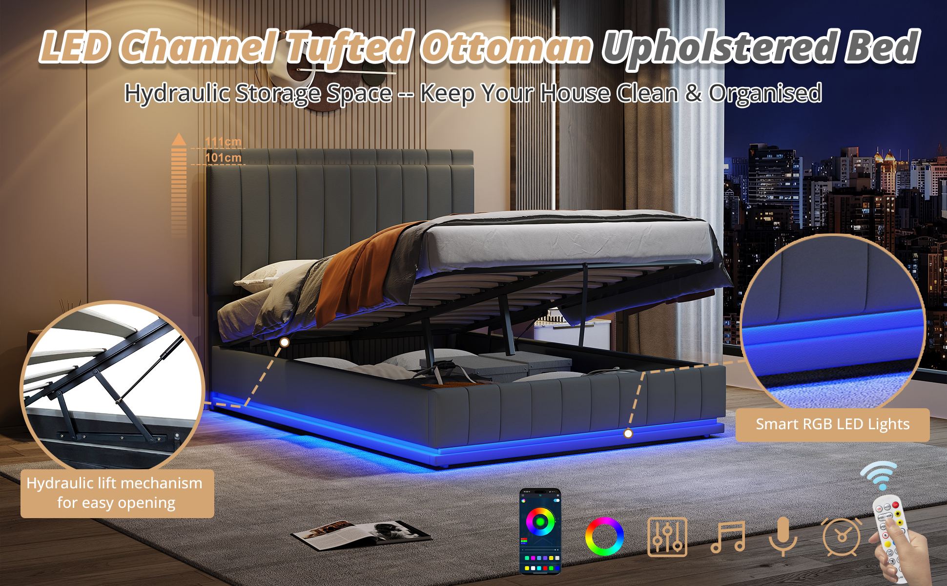 This ottoman upholstered bed is surrounded by a beautiful RGB LED lighting strip. Featuring a channel-tufted design and luxurious, soft-touch PU Leather, this adjustable headboard is an eye-catching finish, feeling just as premium as it looks. The premium hydraulic lift mechanism provides ample storage space under the bed. You can store blankets, pillows, bed linen or toys in the large storage box under the fold-up slatted frame. The bed is ideal if you only have limited space for closets in the room. Special Features: - Ample hydraulic storage space - Surrounding RGB LED lighting strip - Adjustable channel tufted headboard - Waterproof PU leather - Sturdy Metal-Wood Support - Appearance design suitable for various home styles