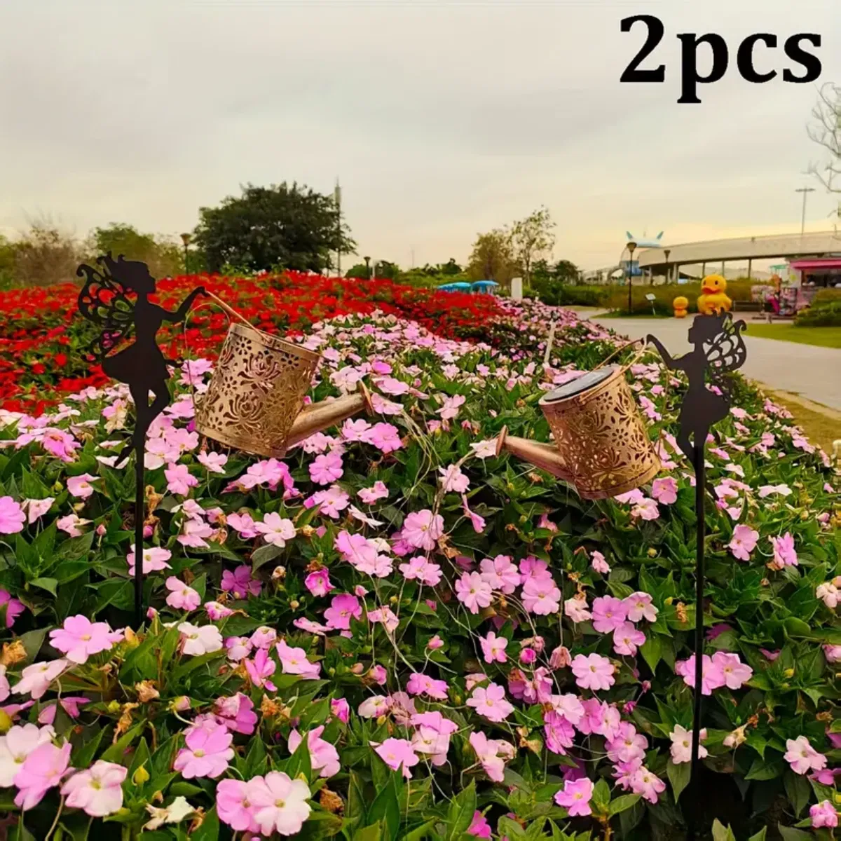 Ouddy Decor Fairy Garden Decor With Solar Watering Can, Metal Statues With Hanging Lanterns Waterfall Lights Silhouette Waterproof For Lawn Pathway Decorations Gardening Gifts For Mother's Day