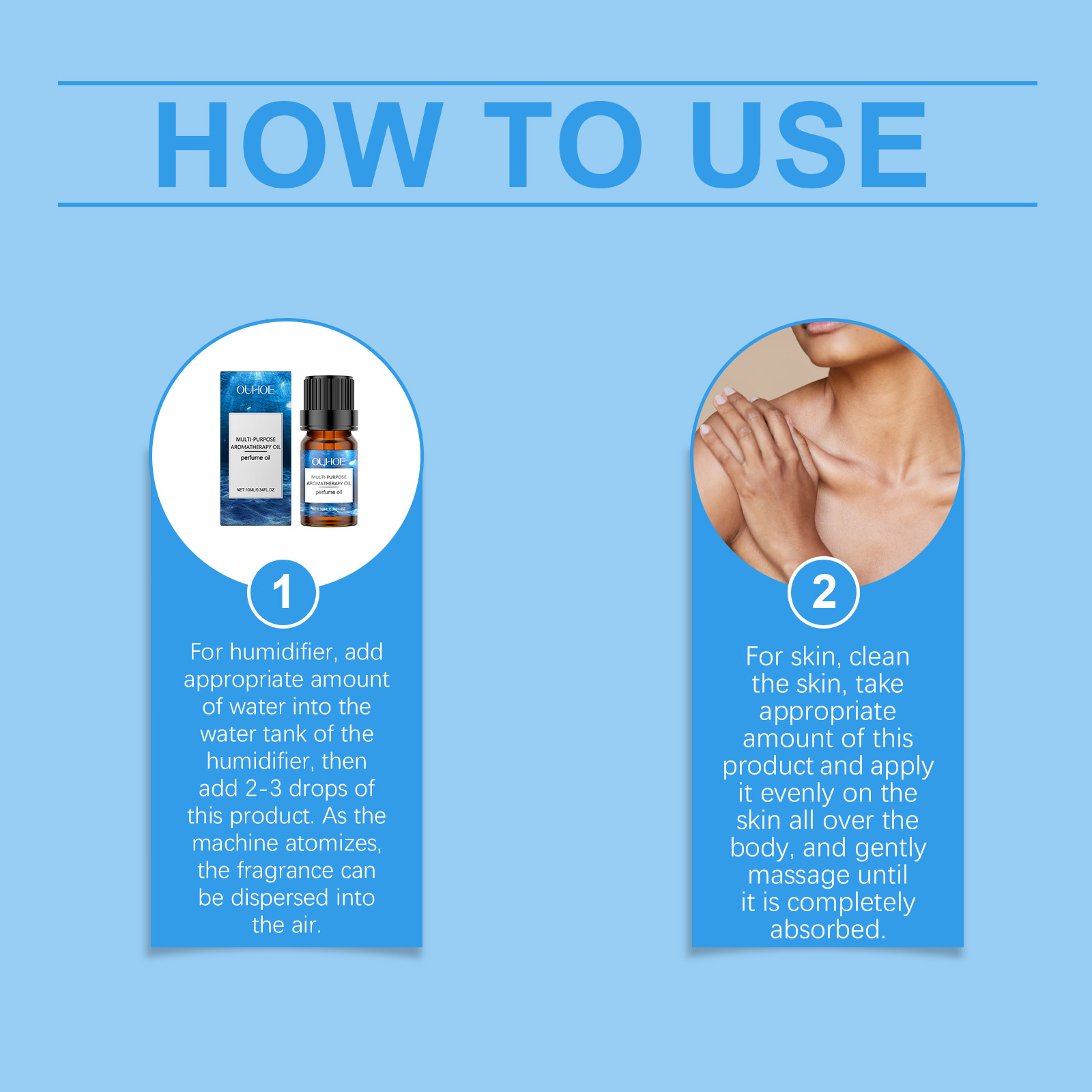 Our aromatherapy soothing oil contains glycerin, sea salt, vitamin E(tocopherol). It can help relieve daily fatigue and bring a fresh and comfortable aroma. Its use method is very simple: 1. For the humidifier, add the right amount of water in the humidifier tank, and then add 2-3 drops of this product, with the atomization of the machine, the fragrance can be dispersed into the air. 2. Skin: After cleansing, apply appropriate amount of the product evenly on the whole skin, gently massage until completely absorbed. Effectively moisturizes skin, locks in moisture and keeps skin soft and moist.