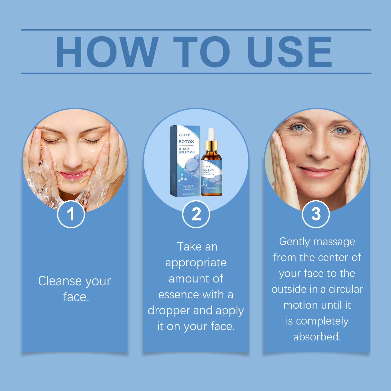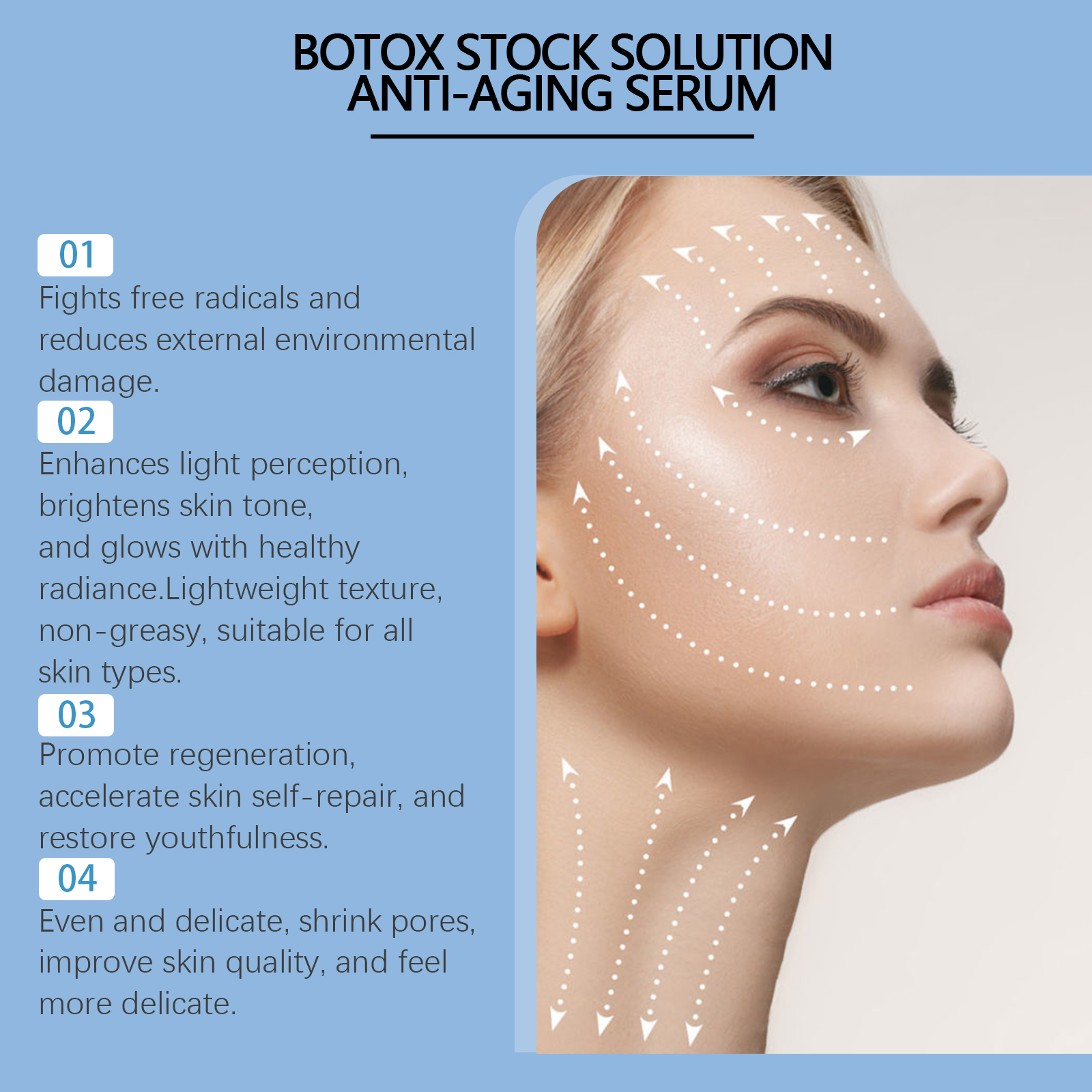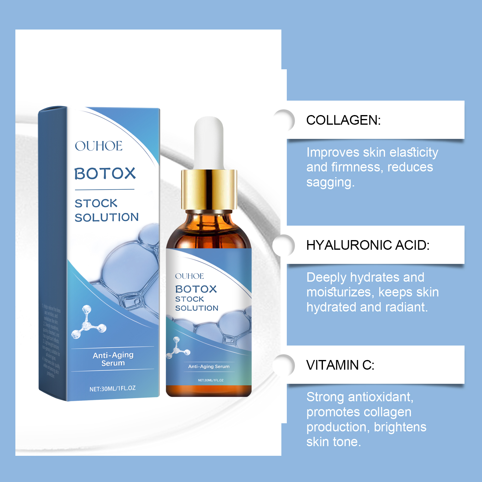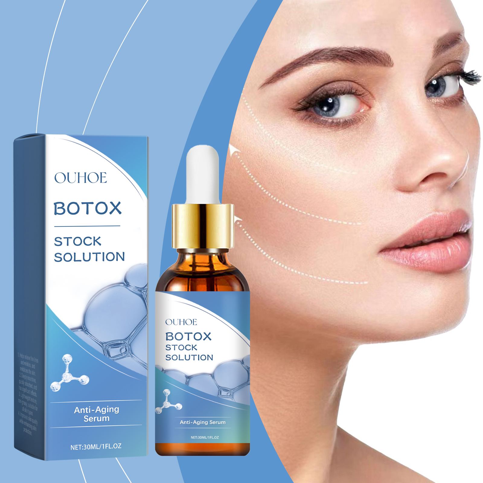 Our anti-fine line facial essence contains collagen, hyaluronic acid and vitamin C. It can significantly reduce fine lines and wrinkles and restore smooth skin. Add collagen to enhance skin elasticity and reshape facial contours. Its usage method is very simple: 1. Wash your face. 2. Take an appropriate amount of the essence and apply it evenly to your face with a dropper. 3. Gently massage in a circular motion from the center of the face until fully absorbed. Deeply hydrate, provide long-lasting moisture, and lock in plump and radiant skin.