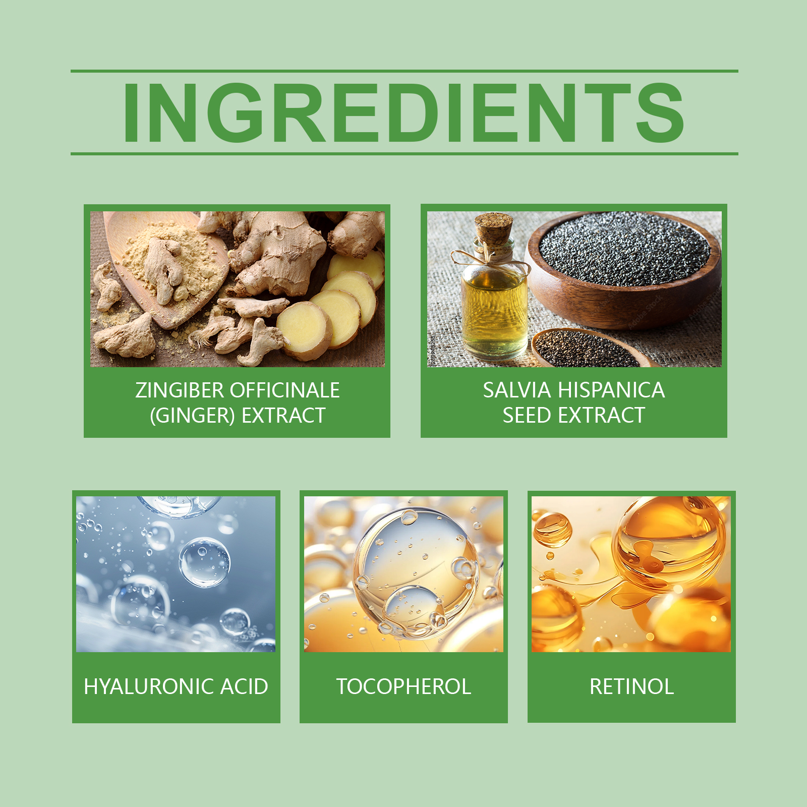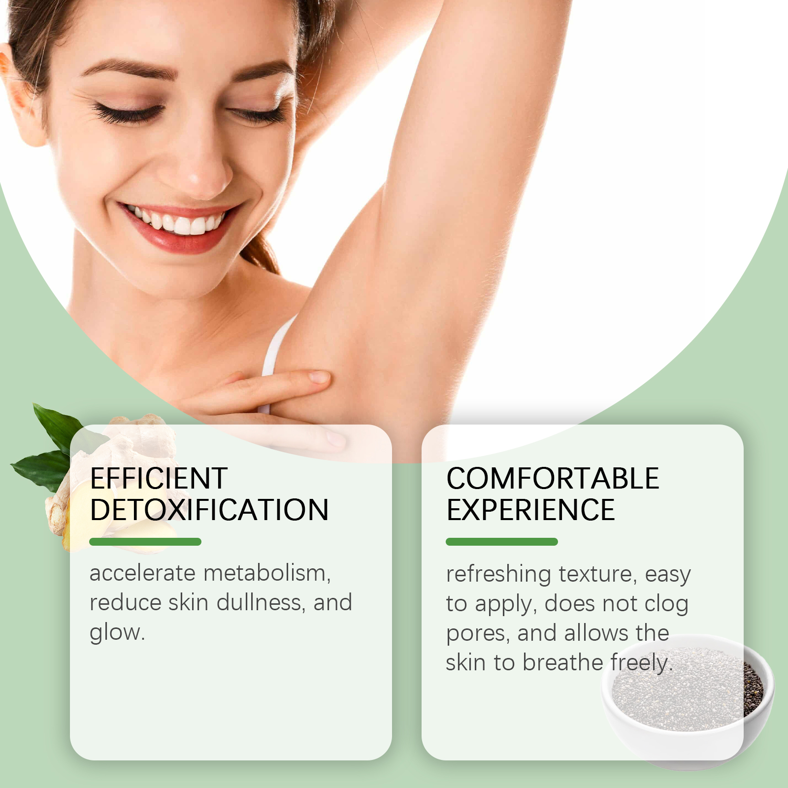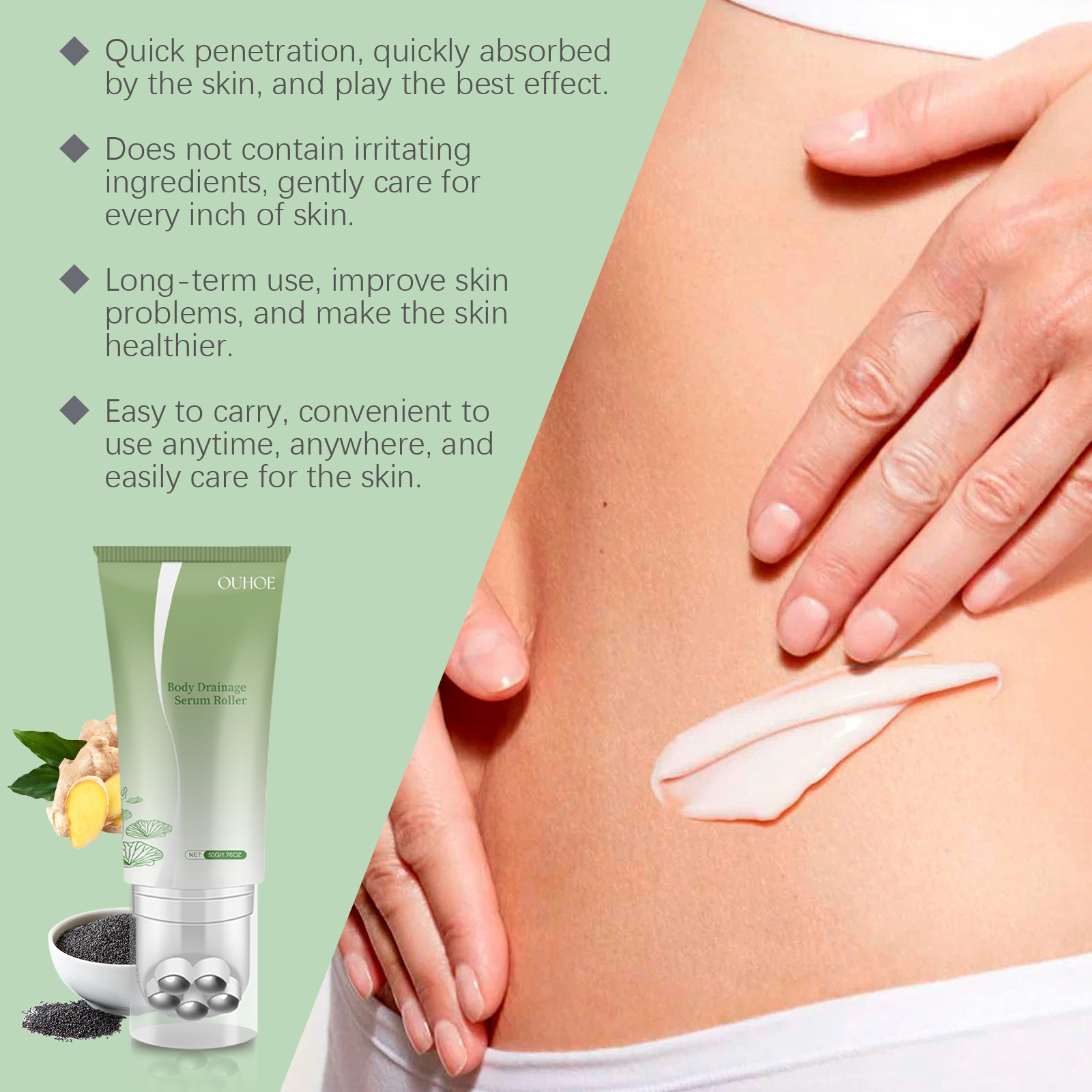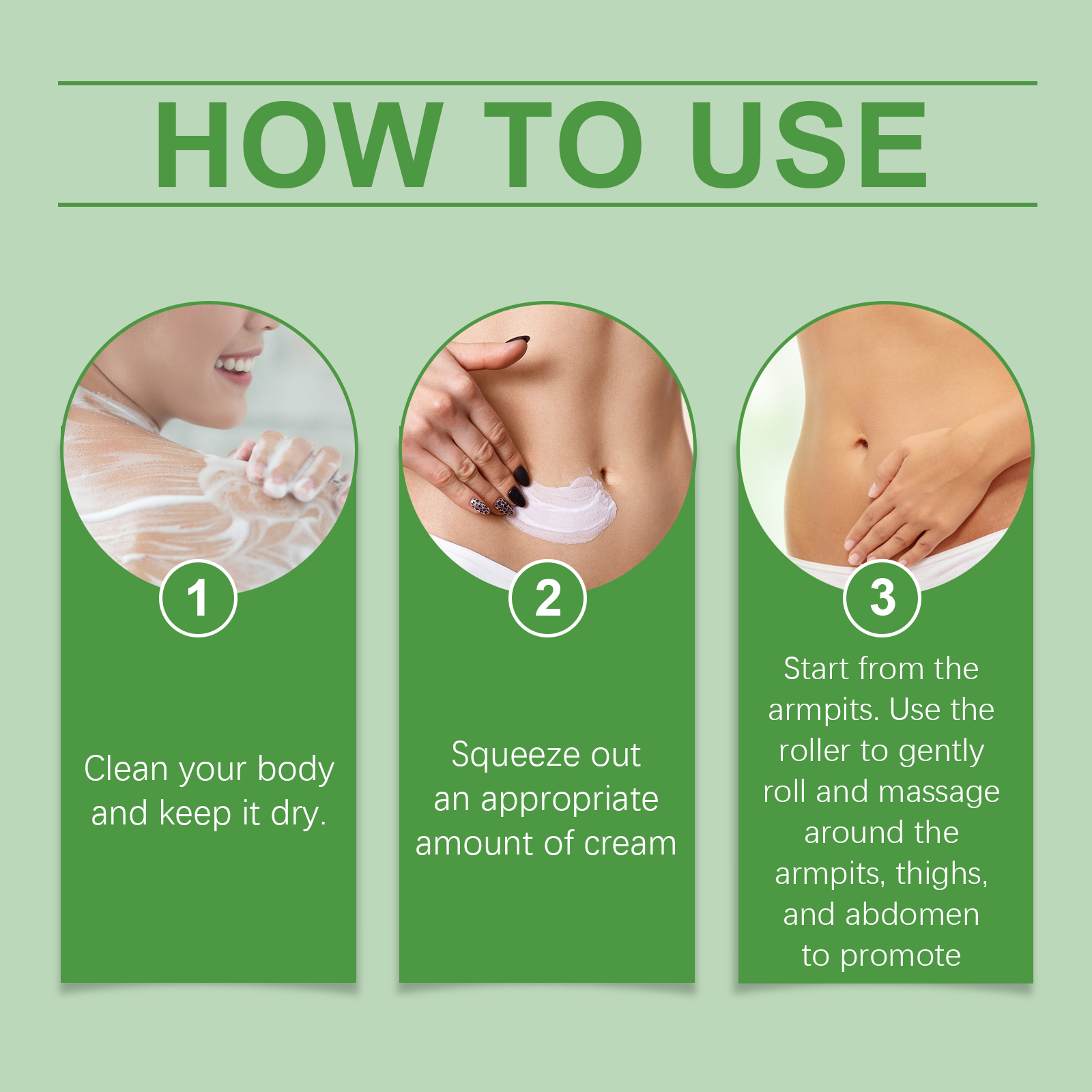 Our body cream contains ginger extract, chia seed extract, hyaluronic acid. It prevents free radical damage; Deep moisturizing, lock female moisture, make skin moist and shiny; Promote blood circulation, speed up metabolism, and help lymphatic detoxification. The way to use it is very simple: 1. Clean the body and keep dry. 2. Squeeze the appropriate amount of cream; 3. Start with your armpits. Use a roller to gently roll and massage around your armpits, thighs, and abdomen to promote. Body creams speed up metabolism, reduce dullness, and glow. Refreshing texture, easy to use, does not clog pores and lets skin breathe freely.