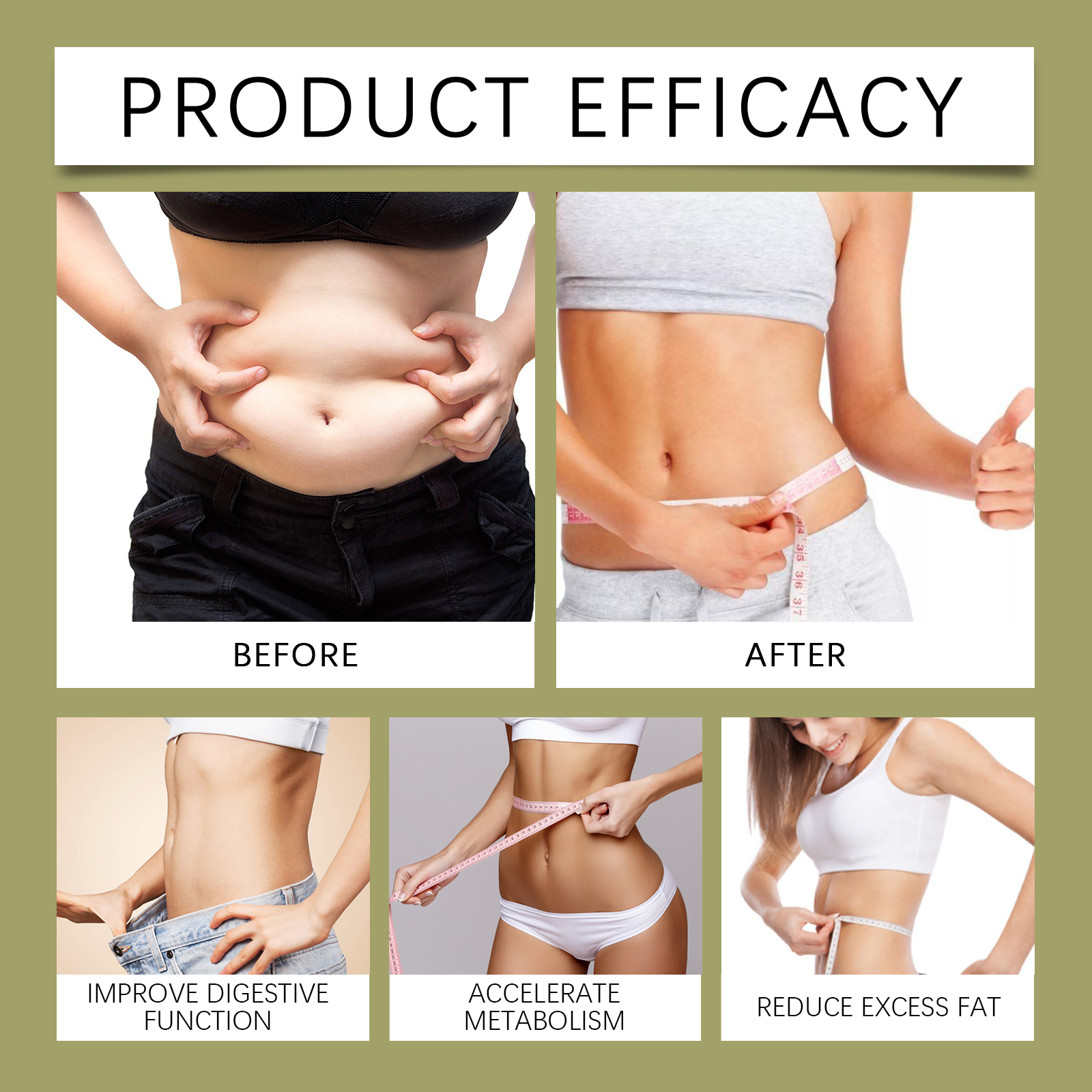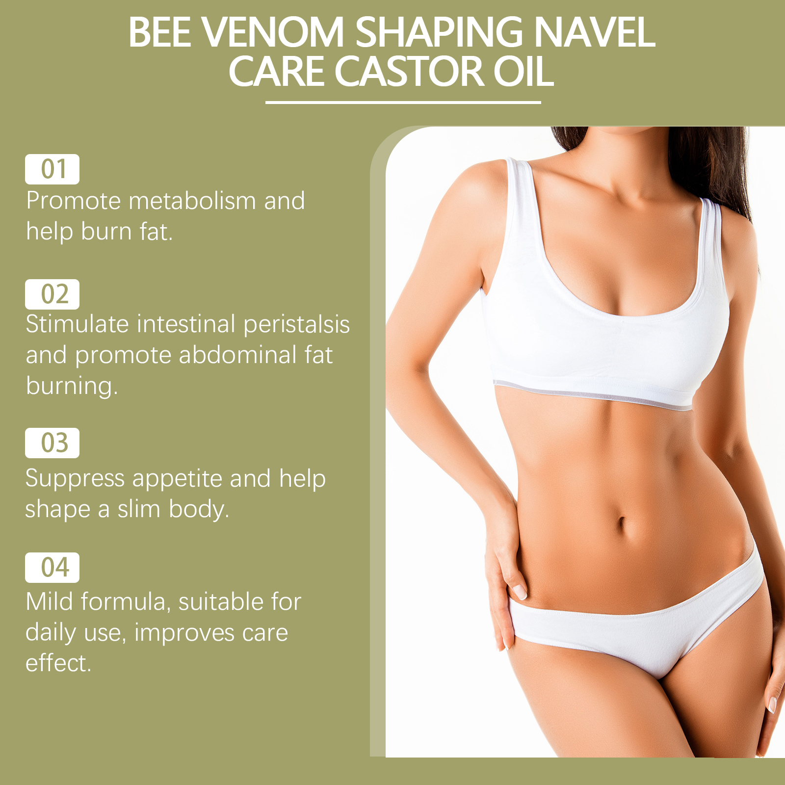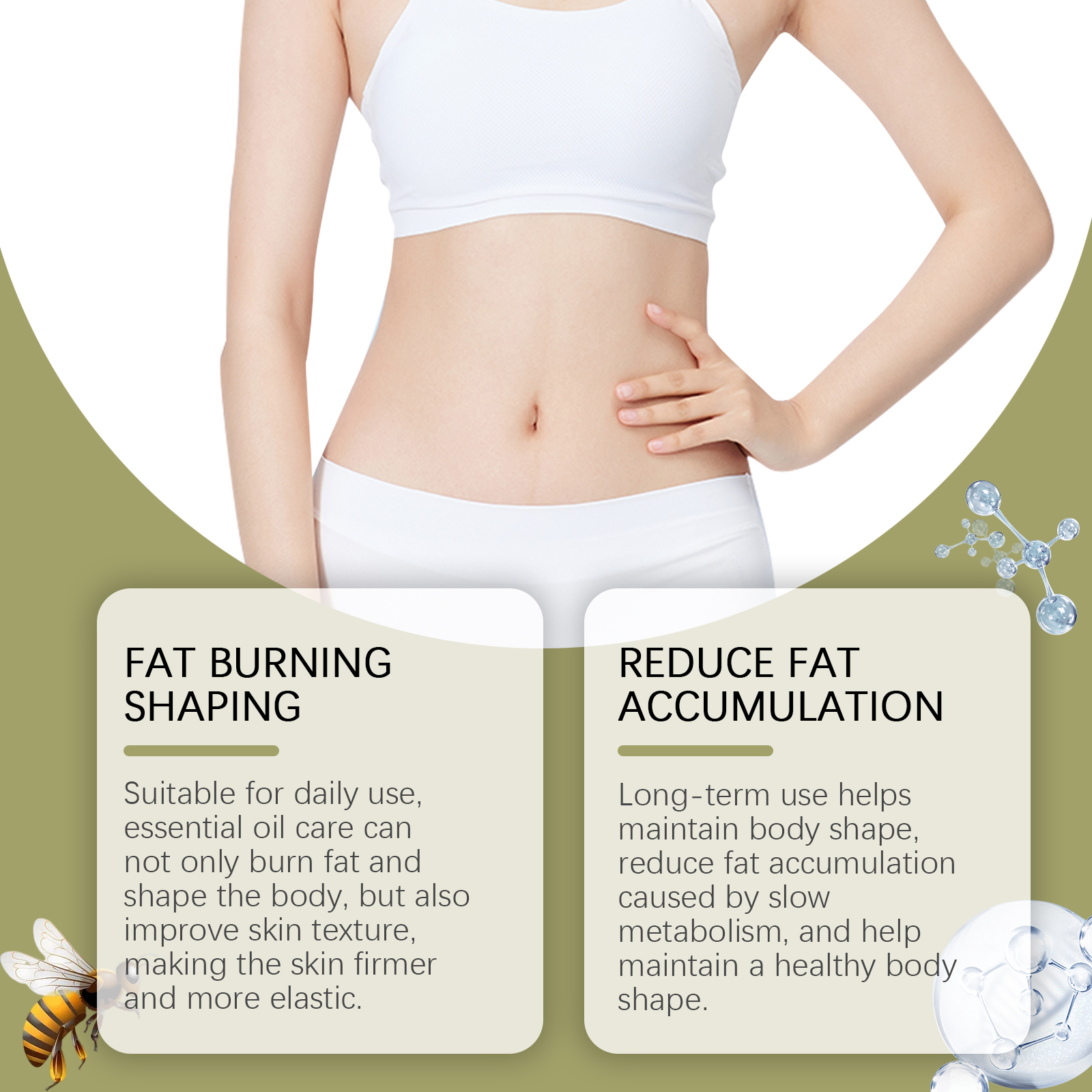 Our body massage oil contains lemon extract, vitamin E (tocopherol). It speeds up metabolism and increases the body's ability to burn fat. The way to use it is simple: clean the skin on the abdomen and keep the skin dry. Apply appropriate amount of this product to the skin around the umbilical cord. Gently massage until absorbed. And it can stimulate the body's metabolism, improve body vitality, make the body shape effect more obvious, and help restore the tight body shape.