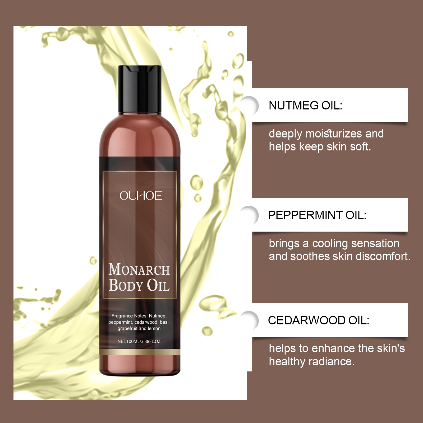 Our body moisturizing oil contains grapefruit extract, lemon extract. It can significantly improve dry skin and restore skin softness and elasticity. Its application method is very simple: clean the skin, keep the skin dry, apply an appropriate amount of this product on the body skin, gently massage until absorbed. And can effectively prevent the damage of the external environment to the skin, keep the skin soft and smooth.