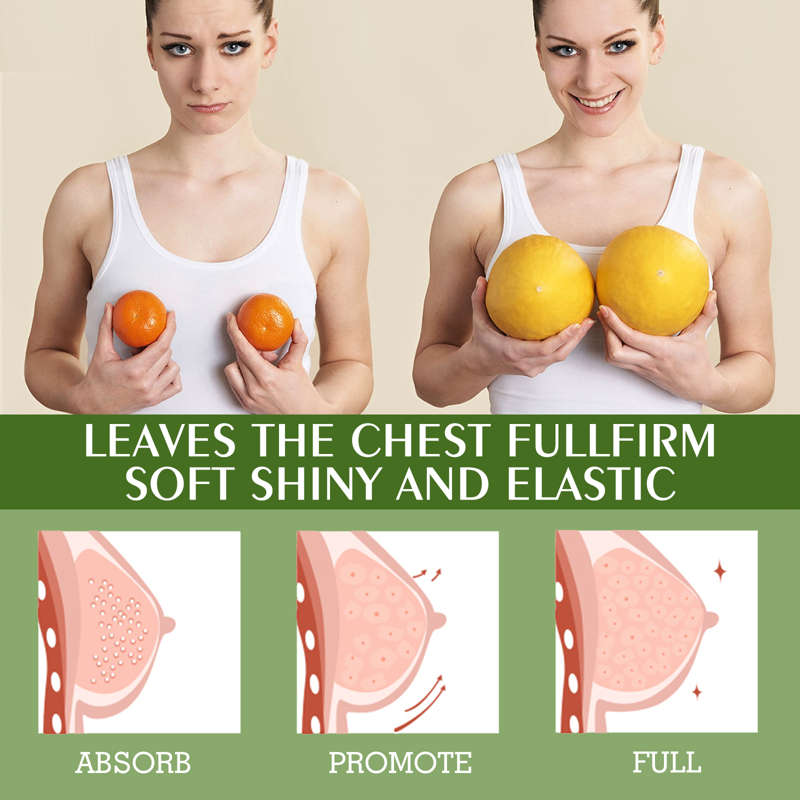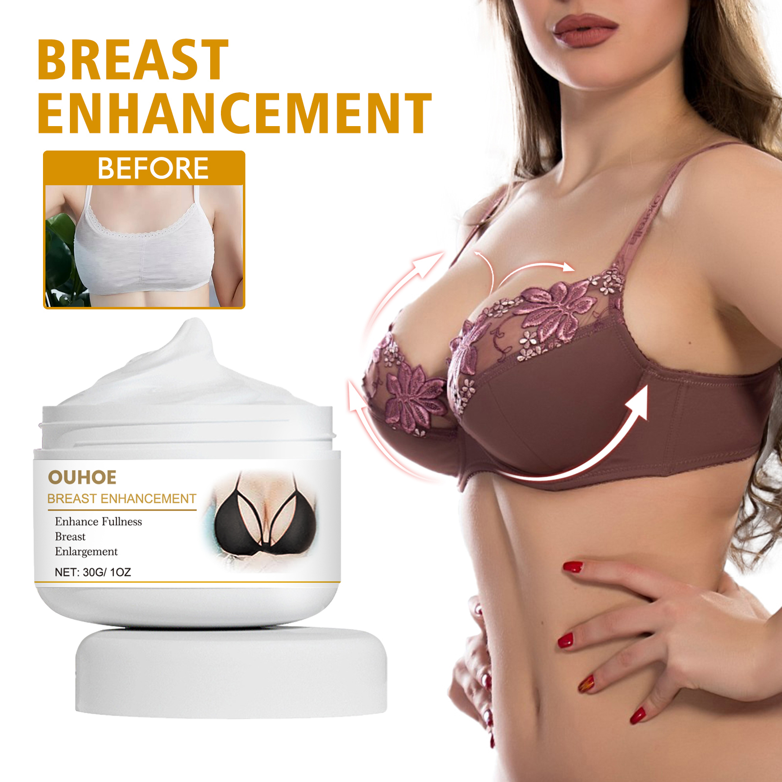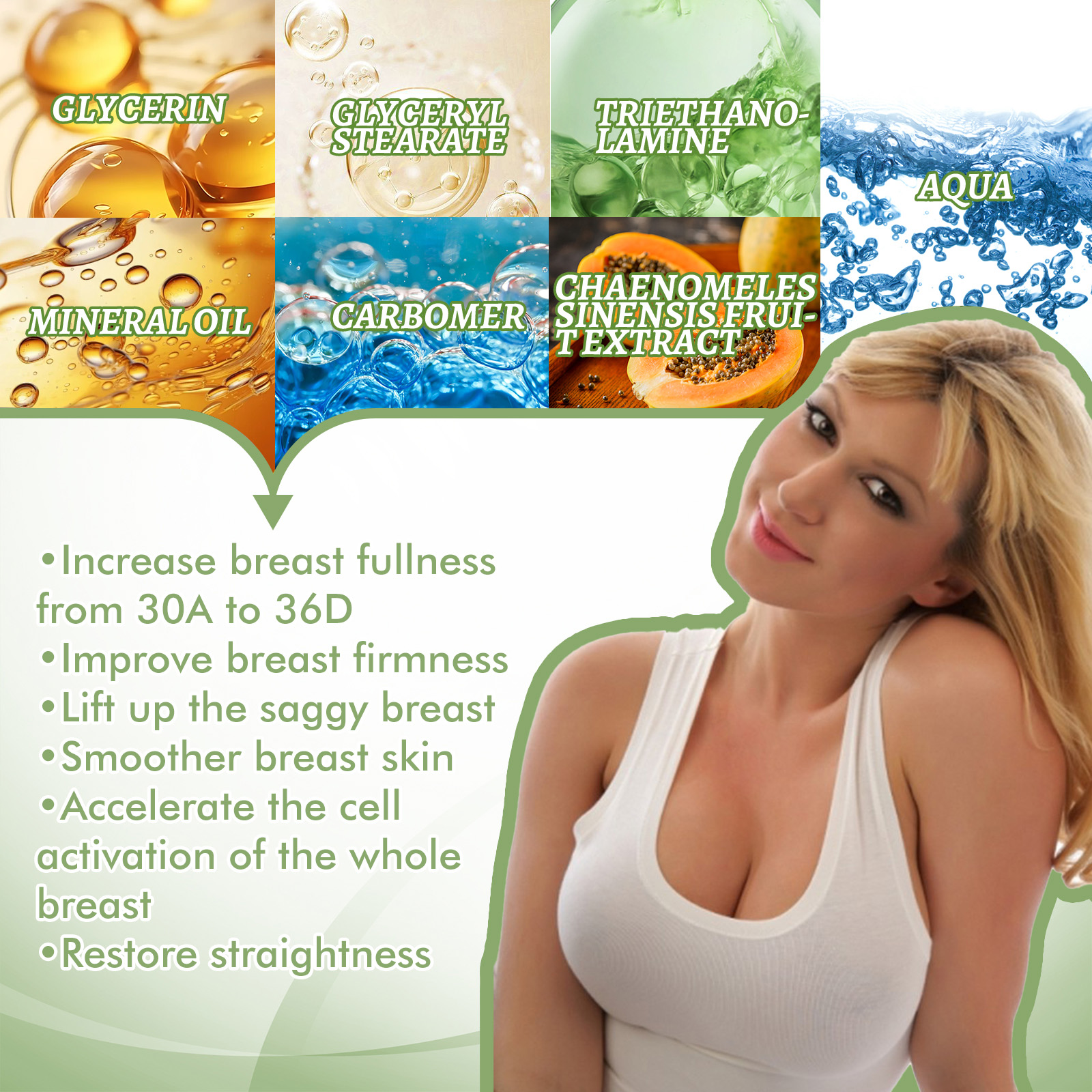 Our beauty and firming cream contains kudzu root and vitamin E. It can nourish the skin on the chest, enhance the chest's absorption of ingredients, and make it plump and round. Its usage method is very simple: After cleansing the skin, take an appropriate amount of this product and gently pat it around the breasts. Then, use the pads of your fingers to massage the breasts from bottom to top. Gently stimulate the breasts by pressing and lifting. And it can make the breasts plump. After using breast augmentation cream, the breasts become firm, full and flawless.