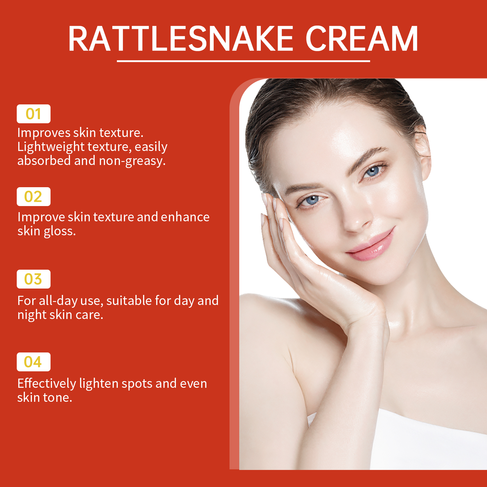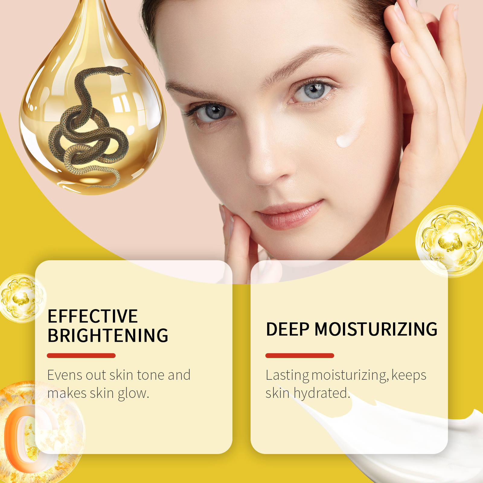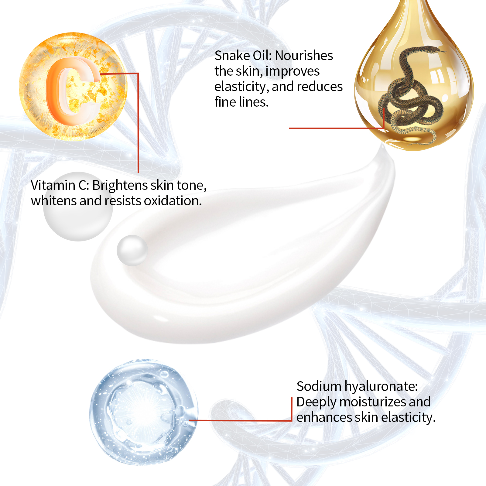 Our brightening cream contains snake oil and ascorbic acid (vitamin C). It can even out the complexion and make the skin glow. Long-lasting moisturizing to keep skin hydrated. Its application method is very simple: clean your face and keep dry, evenly apply the appropriate amount of this product on the face and gently massage until absorbed. And can fight free radicals, delay skin aging.