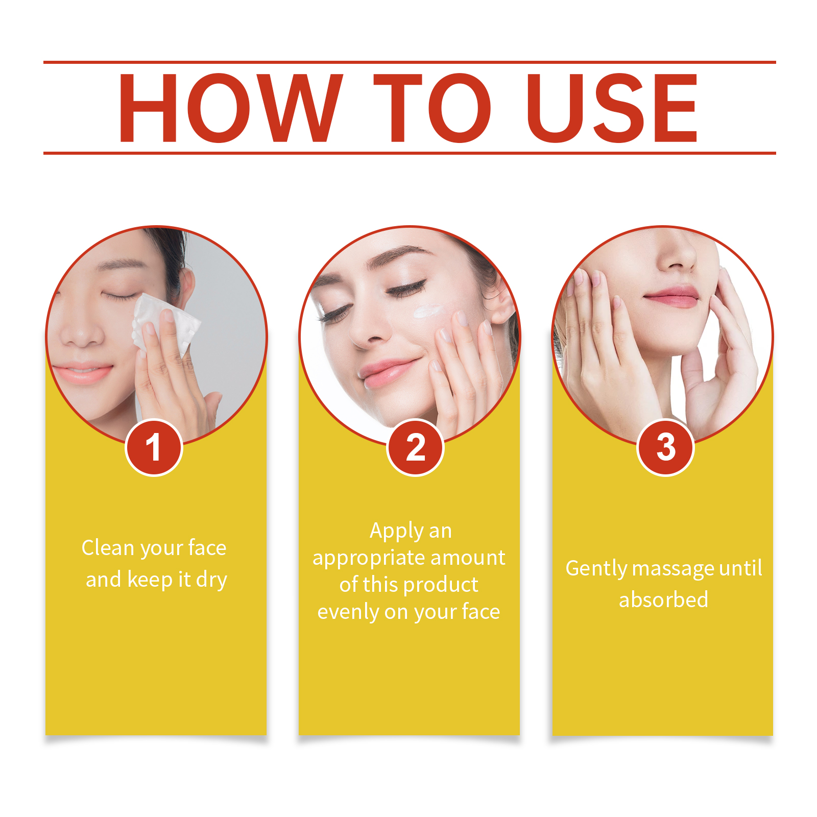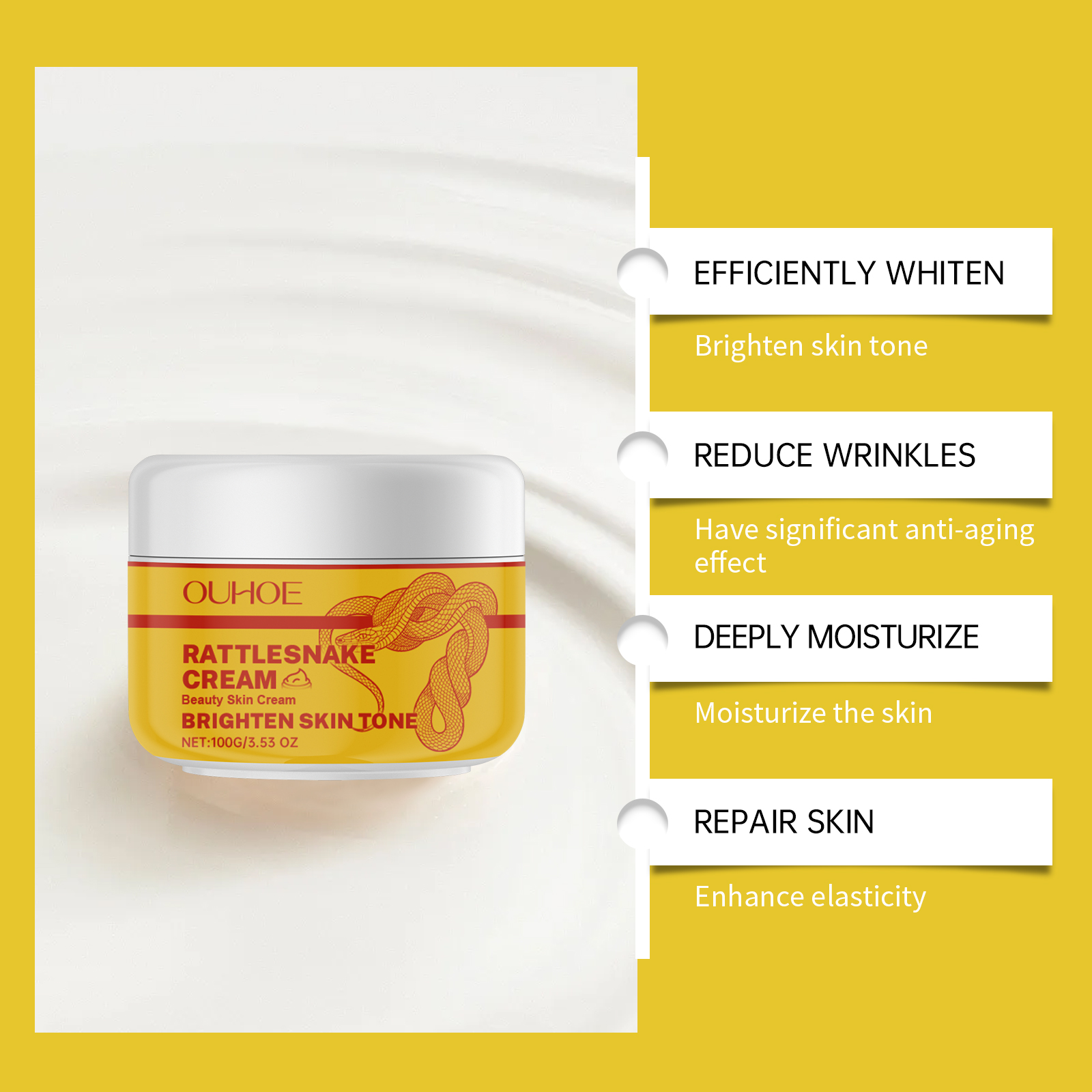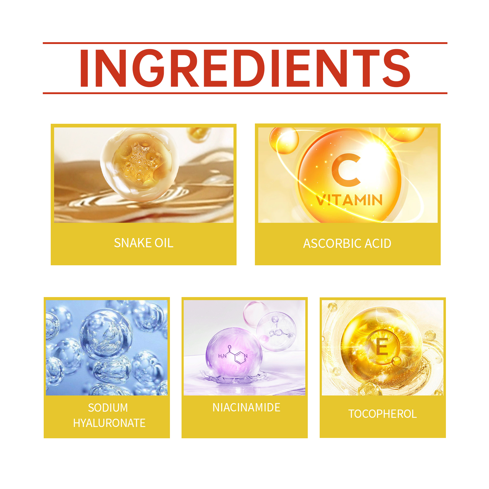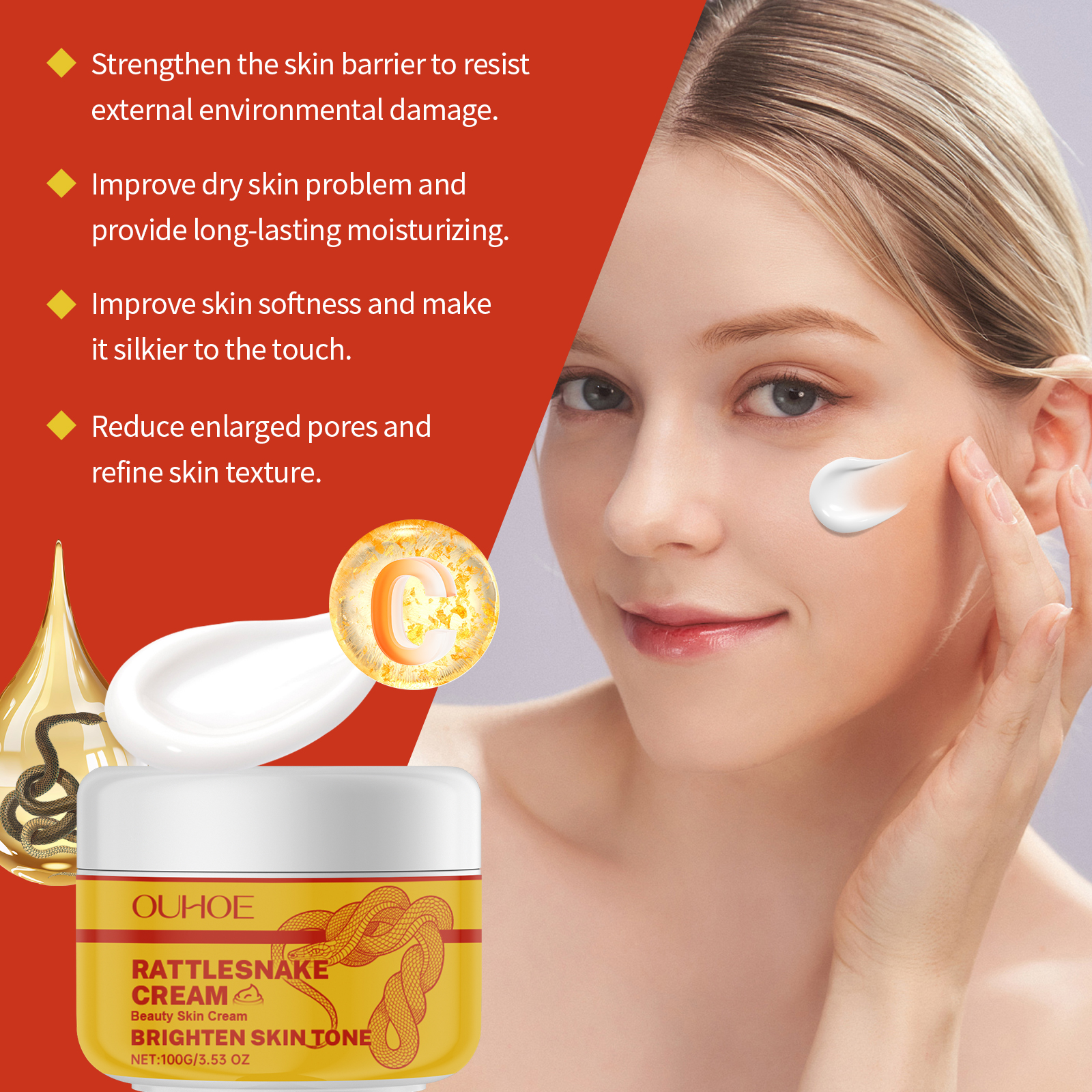 Our brightening cream contains snake oil and ascorbic acid (vitamin C). It can even out the complexion and make the skin glow. Long-lasting moisturizing to keep skin hydrated. Its application method is very simple: clean your face and keep dry, evenly apply the appropriate amount of this product on the face and gently massage until absorbed. And can fight free radicals, delay skin aging.