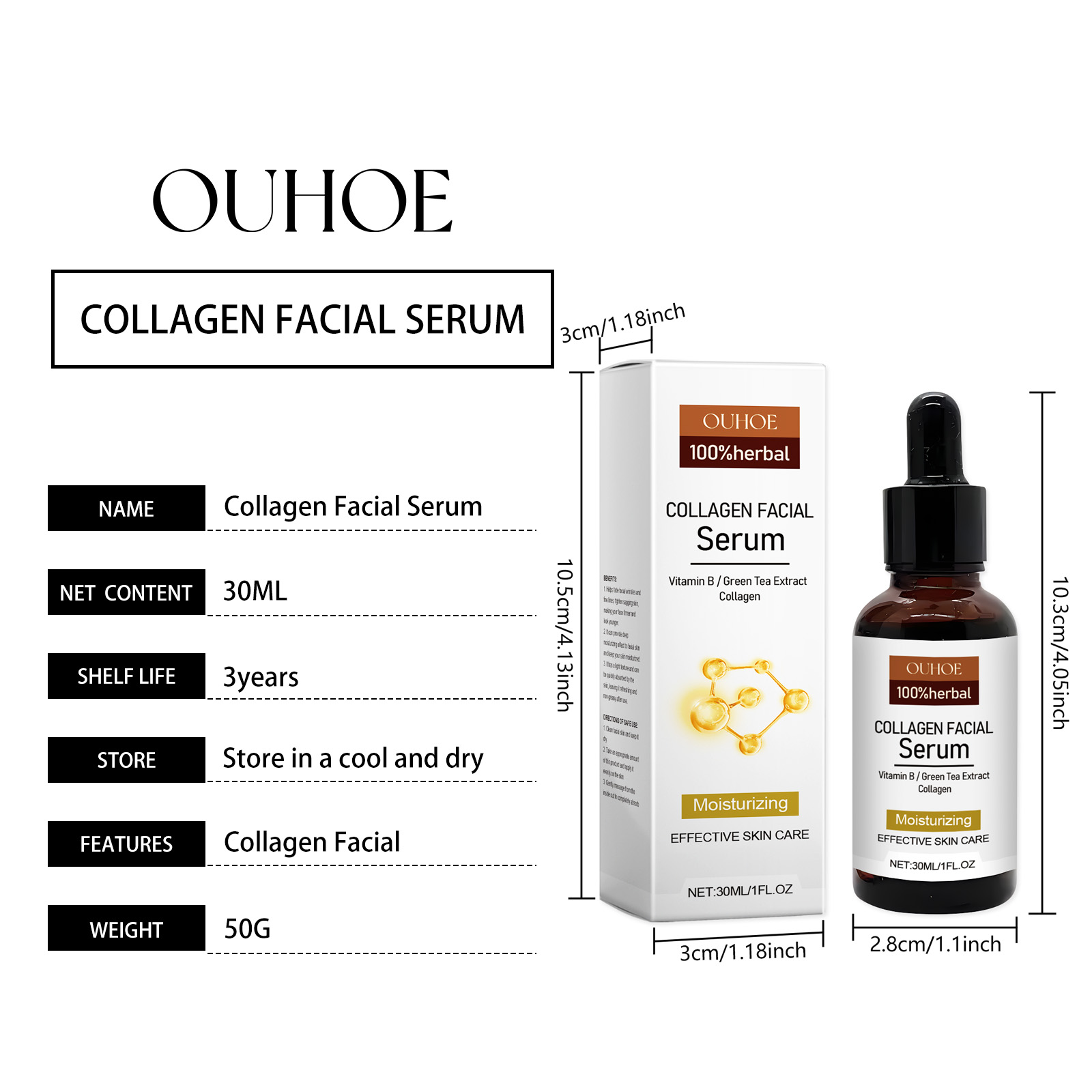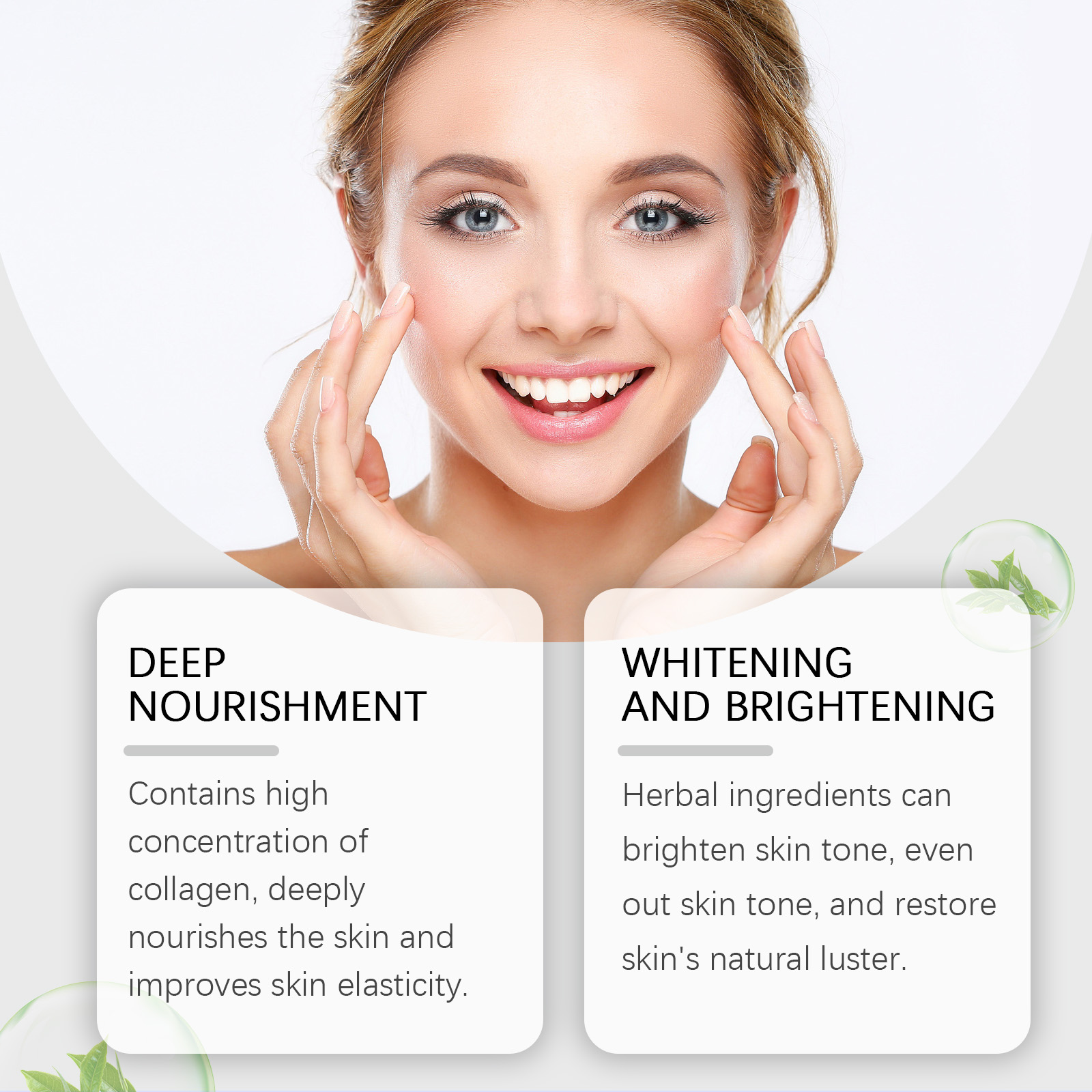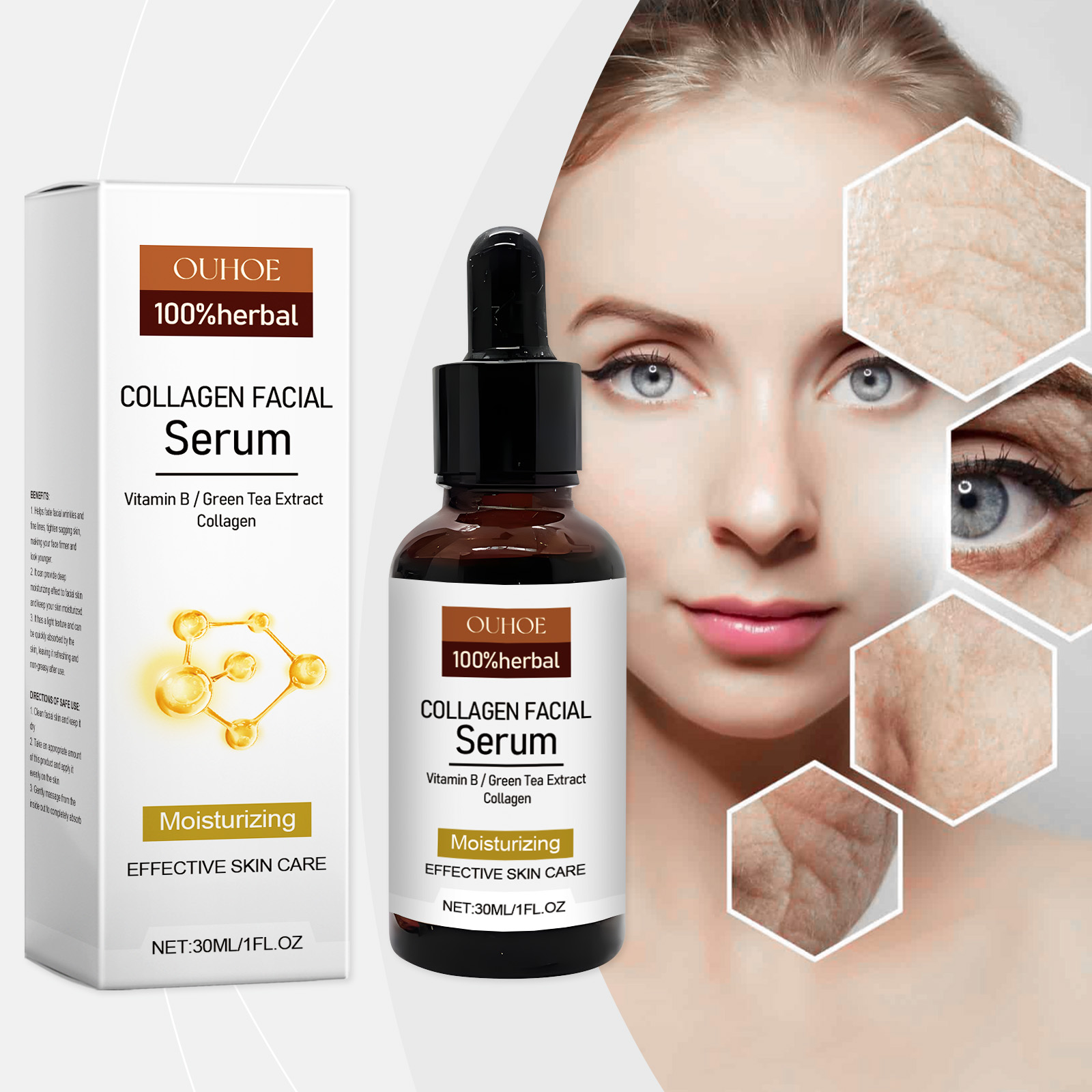 Our Collagen brightening serum contains green tea extract, hydrolyzed collagen, and hyaluronic acid. It contains a high concentration of collagen, which deeply moisturizes the skin and enhances skin elasticity. Herbal ingredients brighten, even and restore skin's natural glow. Its application method is very simple: 1. First thoroughly clean and dry the facial skin; 2. Apply appropriate amount of the product evenly on the face; 3. Gently massage until completely absorbed. Collagen brightening serum effectively fights wrinkles, reduces fine lines and wrinkles, and keeps you looking younger and younger. Improves skin firmness and reduces fine lines and wrinkles.