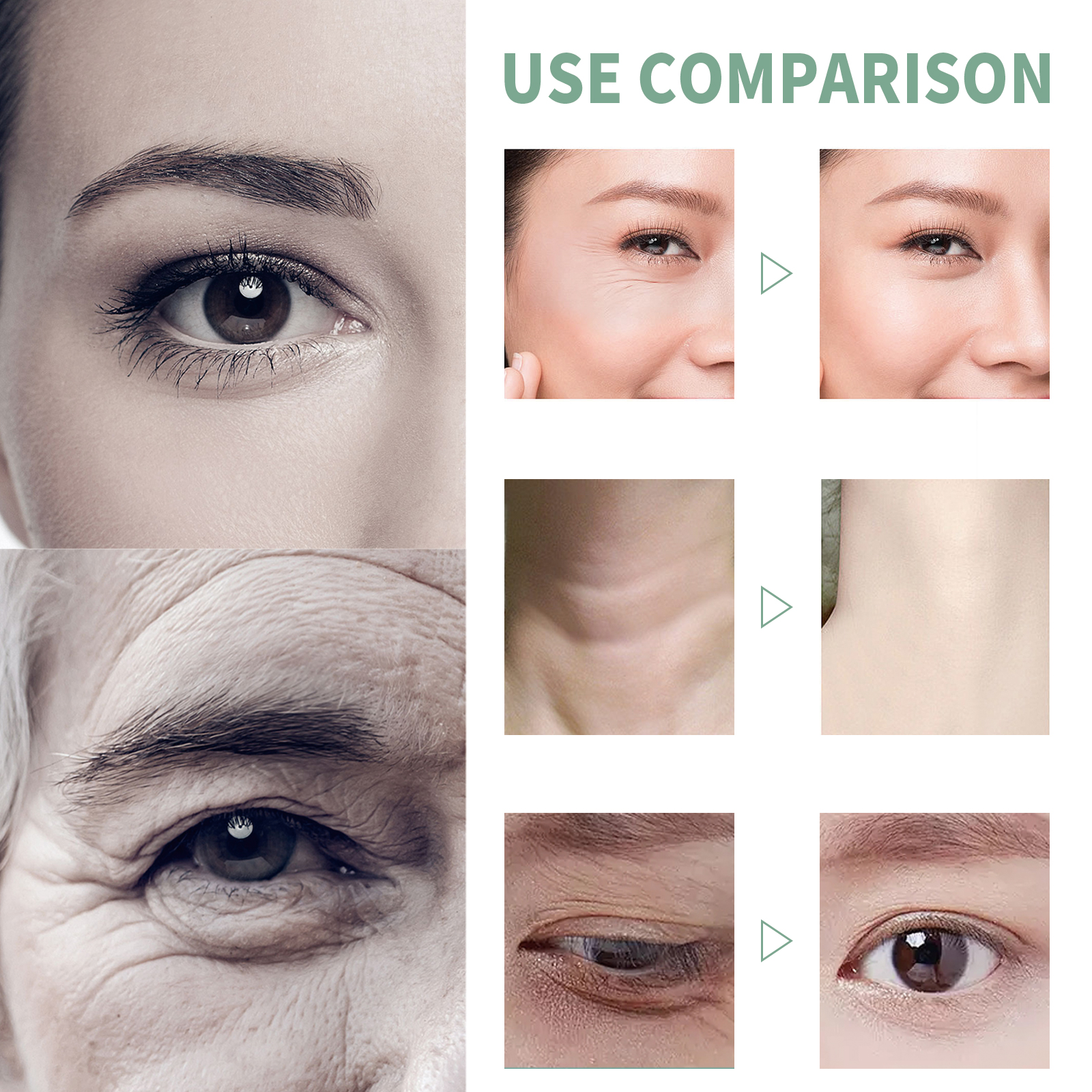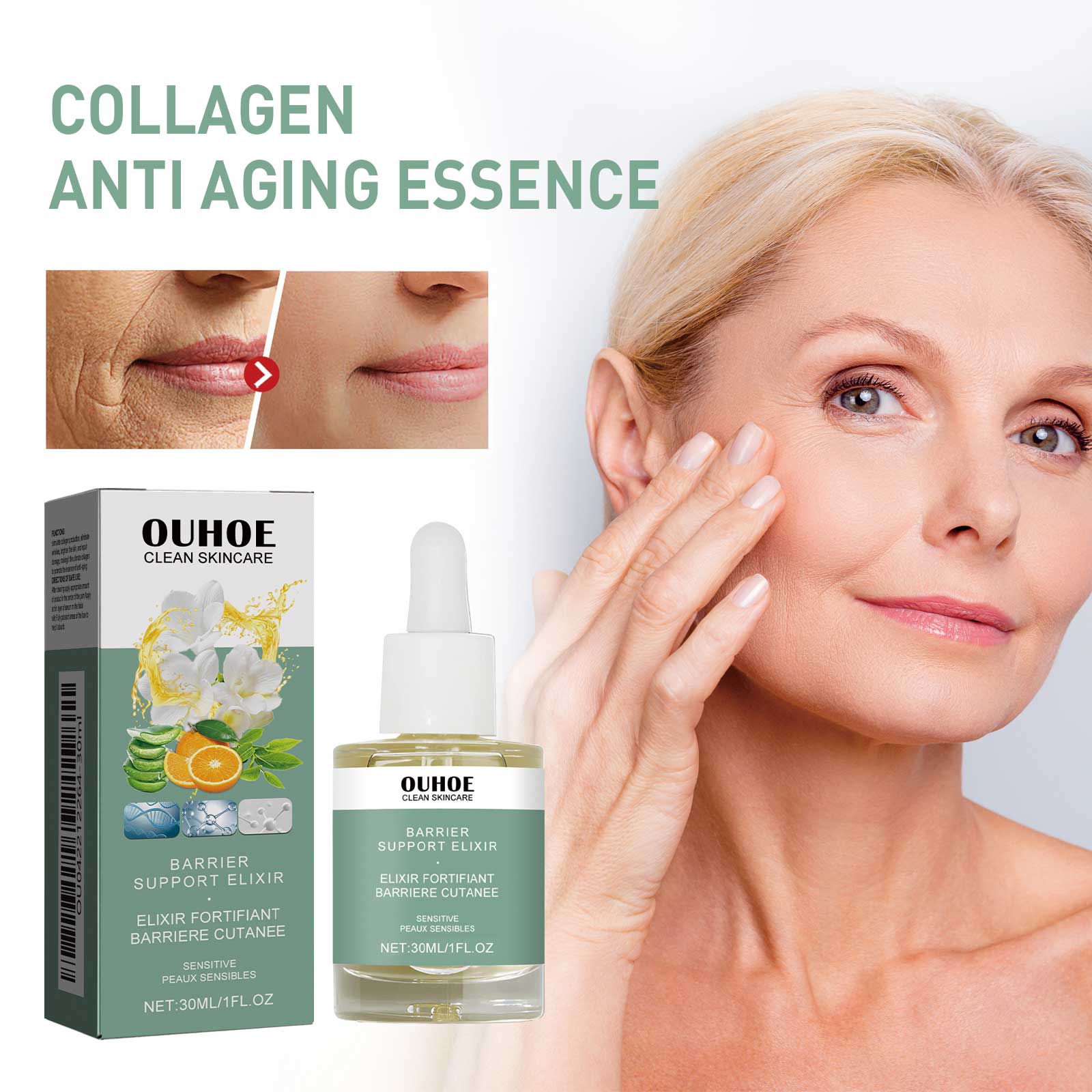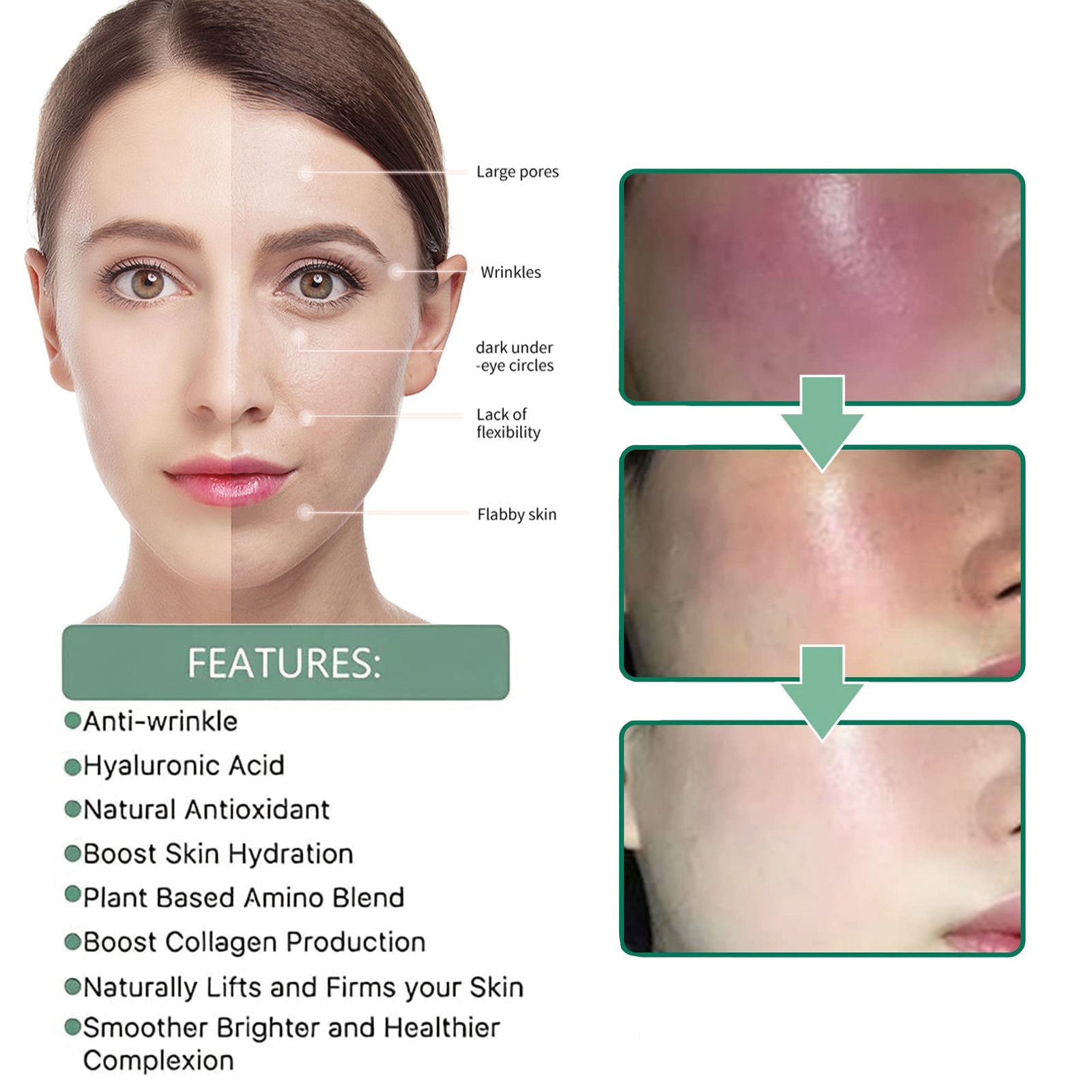 Our collagen anti-aging serum includes hyaluronic acid, vitamin C, and green tea extract. It can promote the regeneration of skin cells, leaving dull skin with a youthful glow and a new look. Increase the flexibility of the skin, stop sagging, reduce the appearance of fine lines, laugh lines, wrinkles, and restore skin elasticity. Its use is simple: First, clean facial skin, wipe off water stains, then apply 3-5 drops of essence evenly on facial skin, massage from inside to outside with fingertips, assist absorption, can be used together with face cream, assist repair, use once in the morning and evening, after use, help smooth skin wrinkles, support skin elasticity, improve skin firmness, reduce eye bags and wrinkles, moisturize skin, Replenish and lock skin moisture, reduce dark spots, and make skin more white.