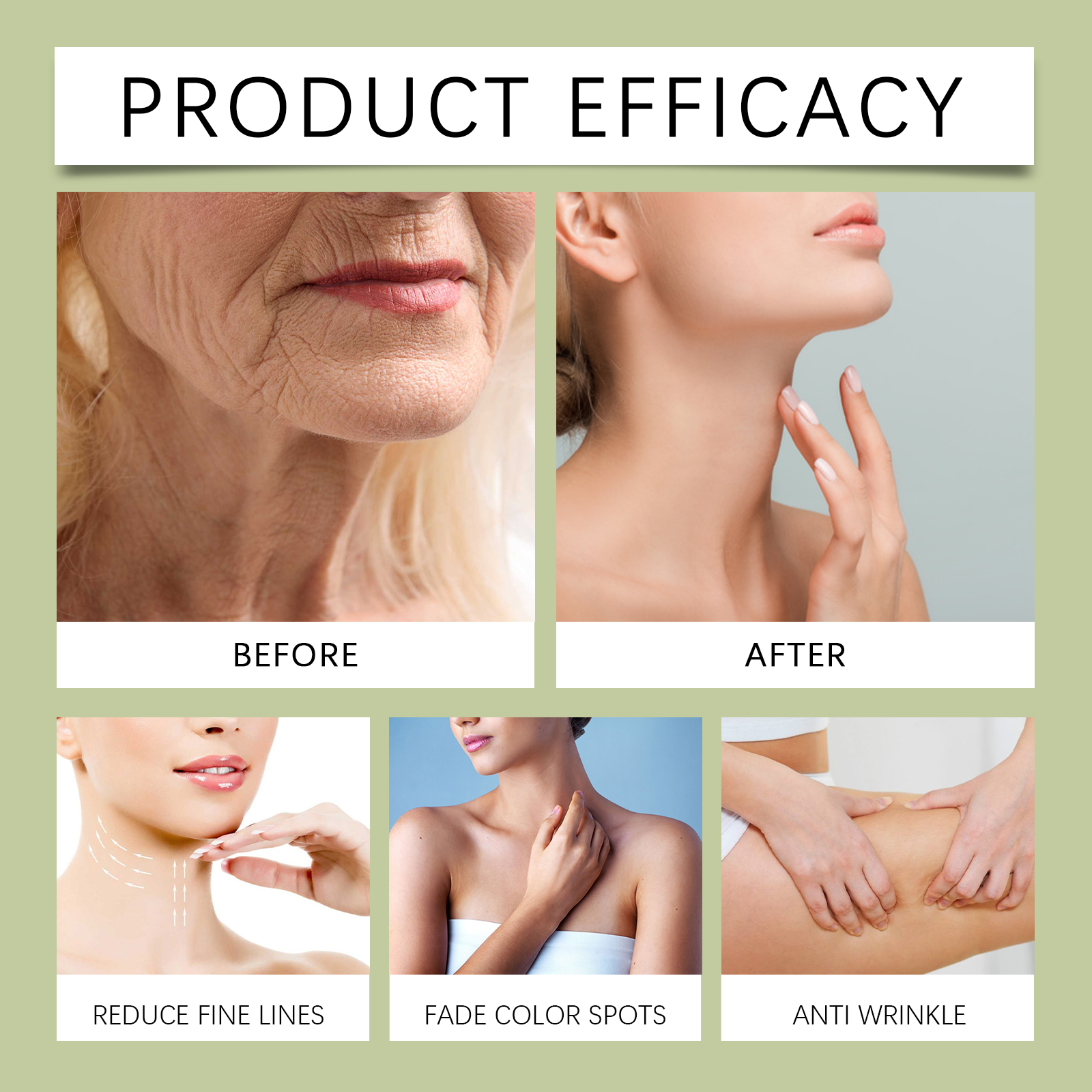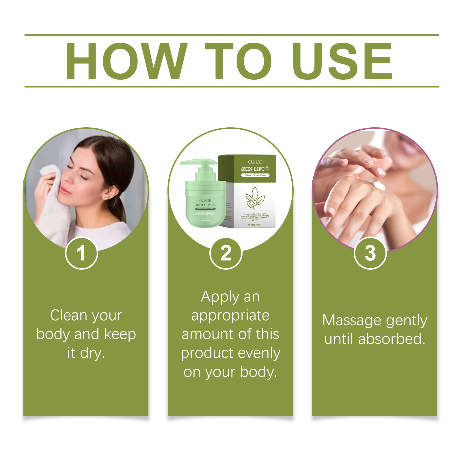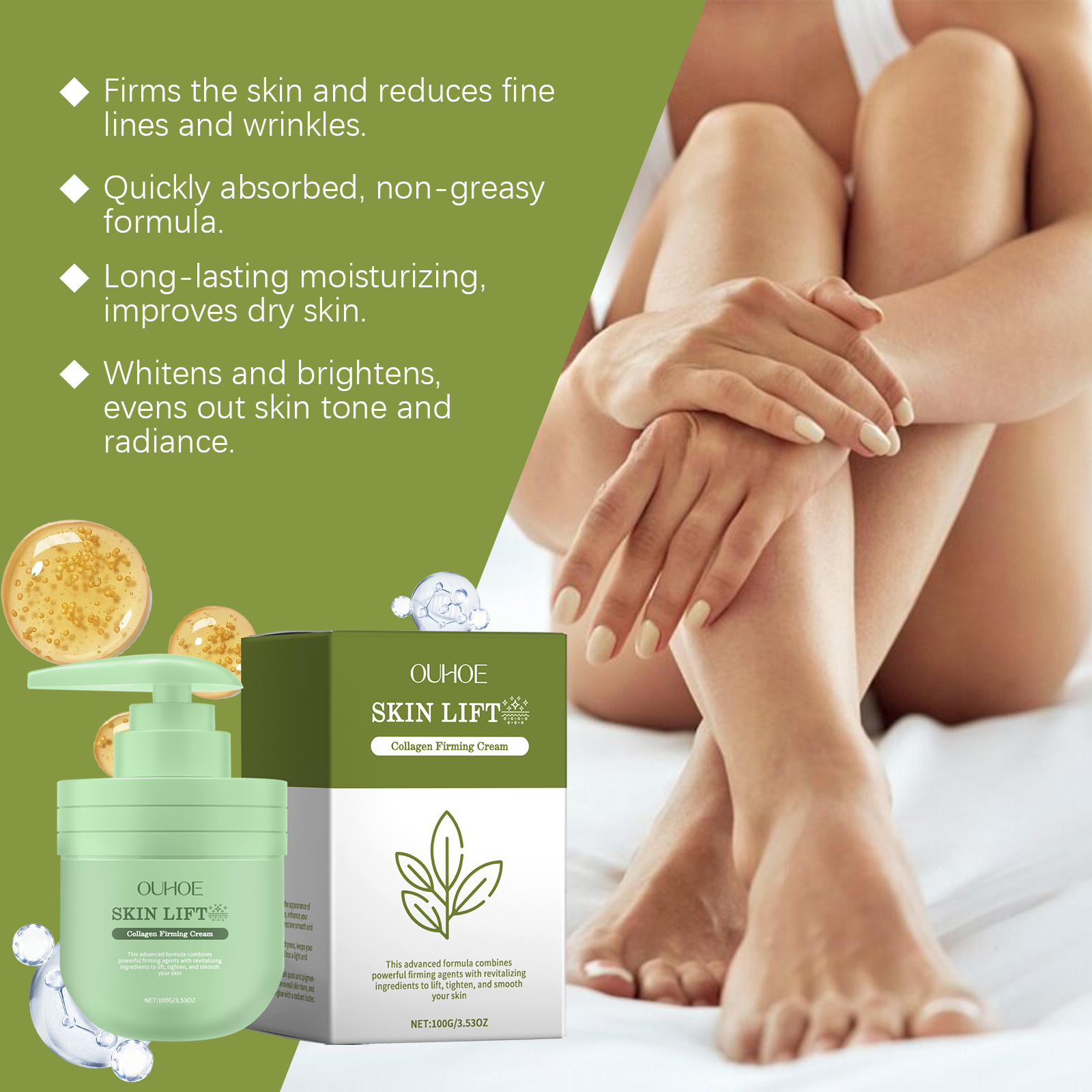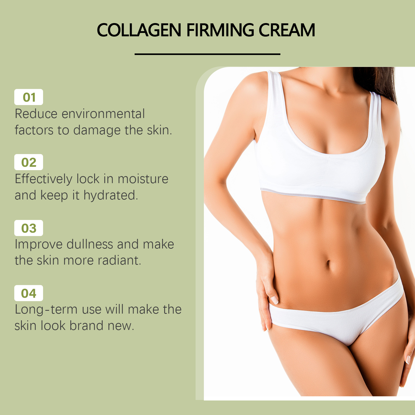 Our collagen firming cream contains glycerin, collagen, and hyaluronic acid. It can effectively improve skin elasticity and reduce the appearance of fine lines and wrinkles. Improves dullness and leaves skin glowing. The way to use it is very simple: 1. Clean the body and keep dry. 2. Apply proper amount of the product to the whole body. 3. Gently massage until absorbed. Significantly improved dark spots, more even and brighter skin tone.