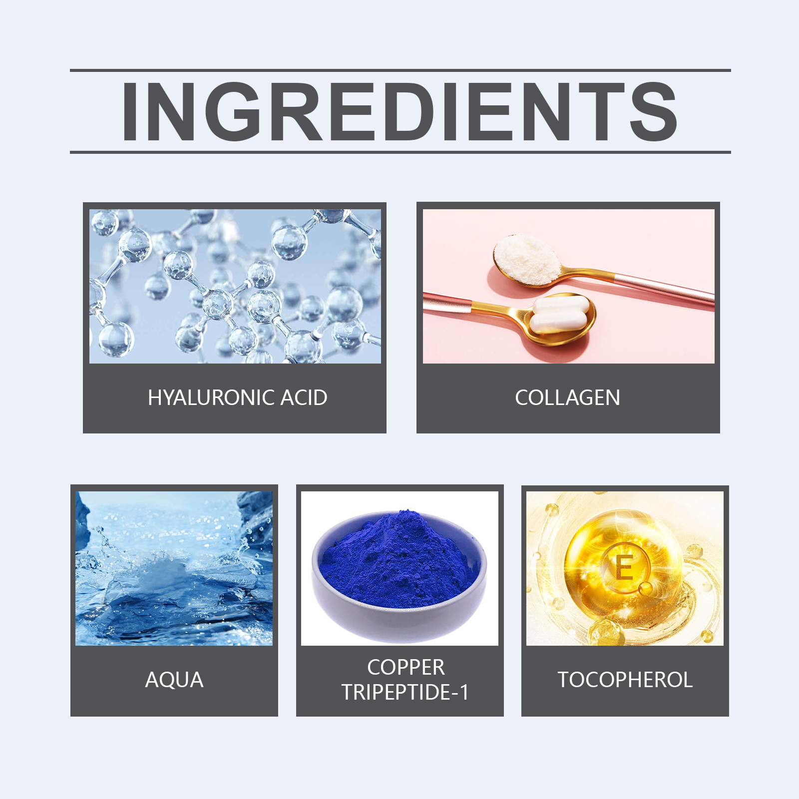Our Copper Peptide Repair serum contains tripeptide-1 copper, hyaluronic acid, collagen. It locks in moisture and keeps you hydrated. Enhance skin elasticity, make skin firm and smooth. Its use is very simple: 1. After cleaning and toning; 2. Apply proper amount of serum evenly on the face; 3. Massage in a circular motion until absorbed. Effectively repair damaged skin, strengthen protection.