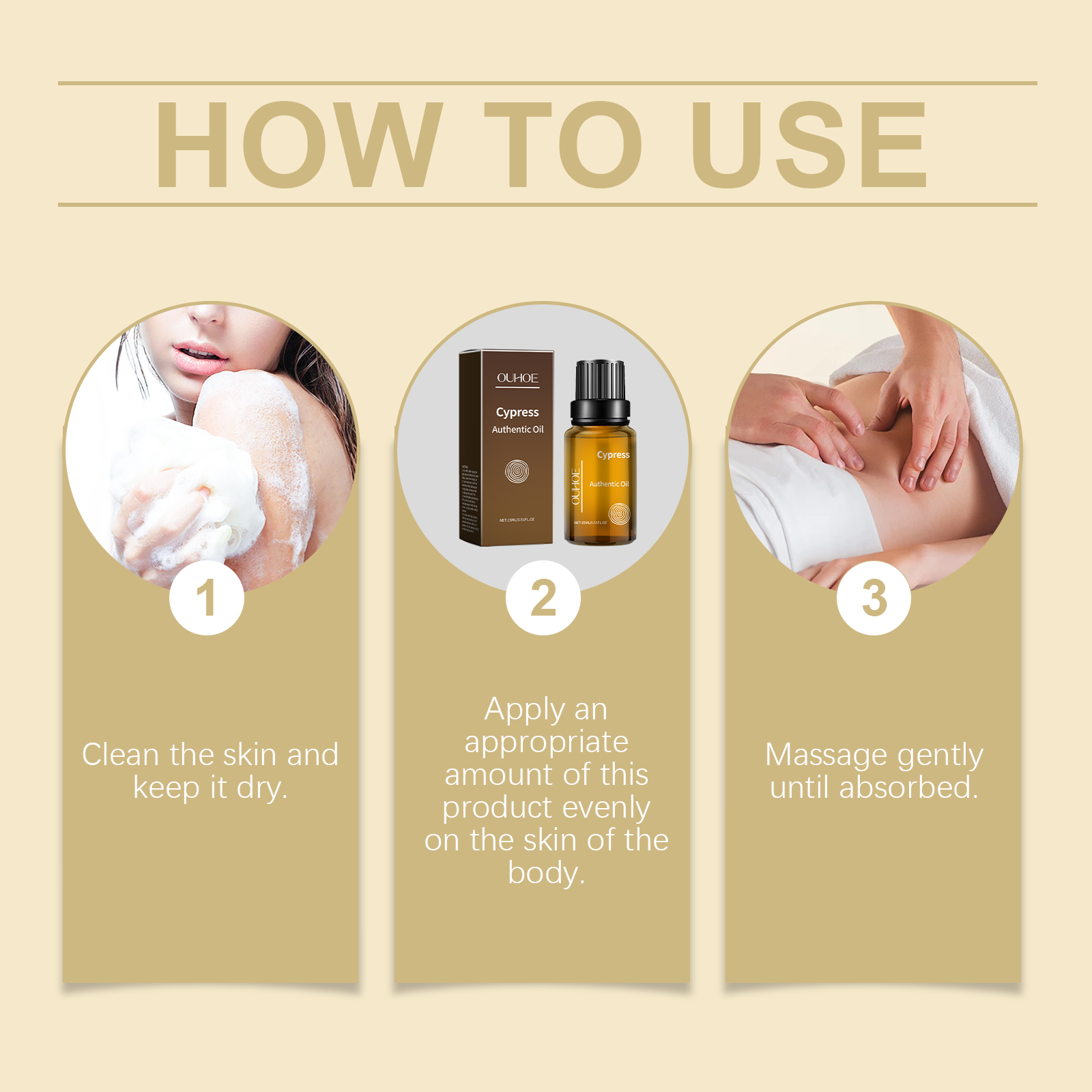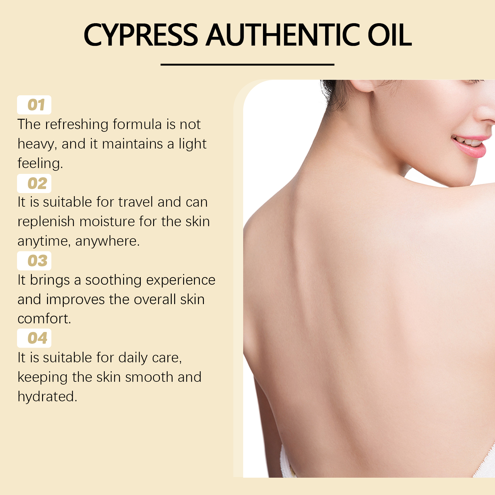 Our cypress essential oil contains peppermint extract, vitamin E (tocopherol). It can give off a fresh scent, bring people a feeling of vitality and relaxation. Its use is simple: clean skin, keep skin dry; Apply appropriate amount of the product evenly on the skin of the body; Gently massage until absorbed. And can gently soothe the skin, suitable for whole body use, and keep comfortable.