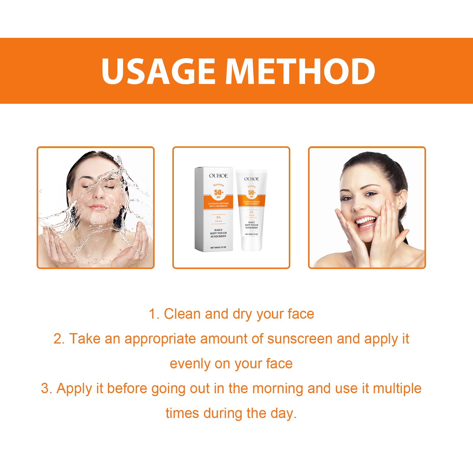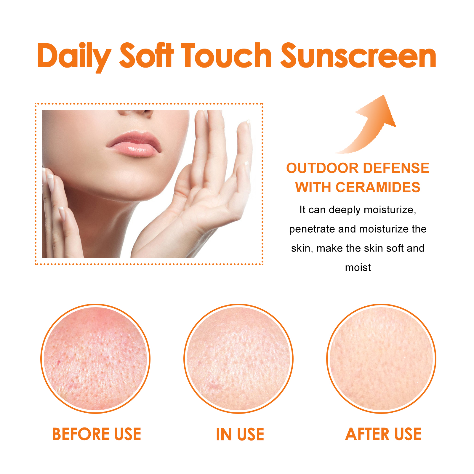 Our Daily Soft Touch Sunscreen contains Titanium Dioxide, Ceramide 1, Panthenol. It can effectively fight against ultraviolet rays, reduce skin redness, dryness, sunburn problems, comprehensive protection of the skin, rich in ceramides, can deeply moisturize, penetrate and moisturize the skin, make the skin soft and moist, restore elasticity and luster. The way to use it is simple: dry your face, take a proper amount of sunscreen, evenly apply it to your face, apply it in the morning before going out, and use it several times during the day. Prevents stains and wrinkles, leaving skin looking younger and firmer.