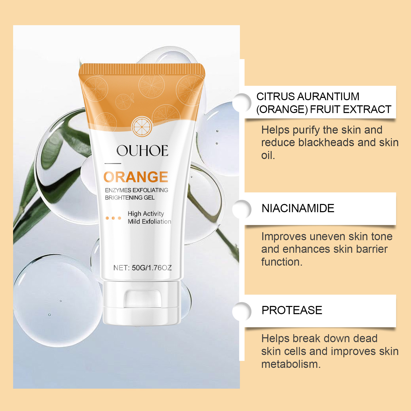 Our Enzymes Exfoliating Brightening Gel contains Citrus Aurantium Dulcis(Orange) Fruit Extract, Niacinamide, Ascorbic Acid. It can help purify the skin, reduce blackheads and skin oils, improve skin smoothness, promote skin metabolism, and improve skin tone. Its use method is very simple: keep the face and hands dry, apply appropriate amount of this product evenly on the face gently massage, and finally wash with warm water. It can improve uneven skin tone, enhance skin barrier function, help decompose dead skin cells, and improve skin metabolism.