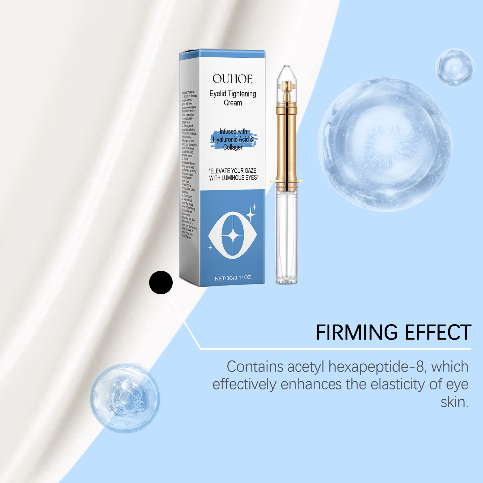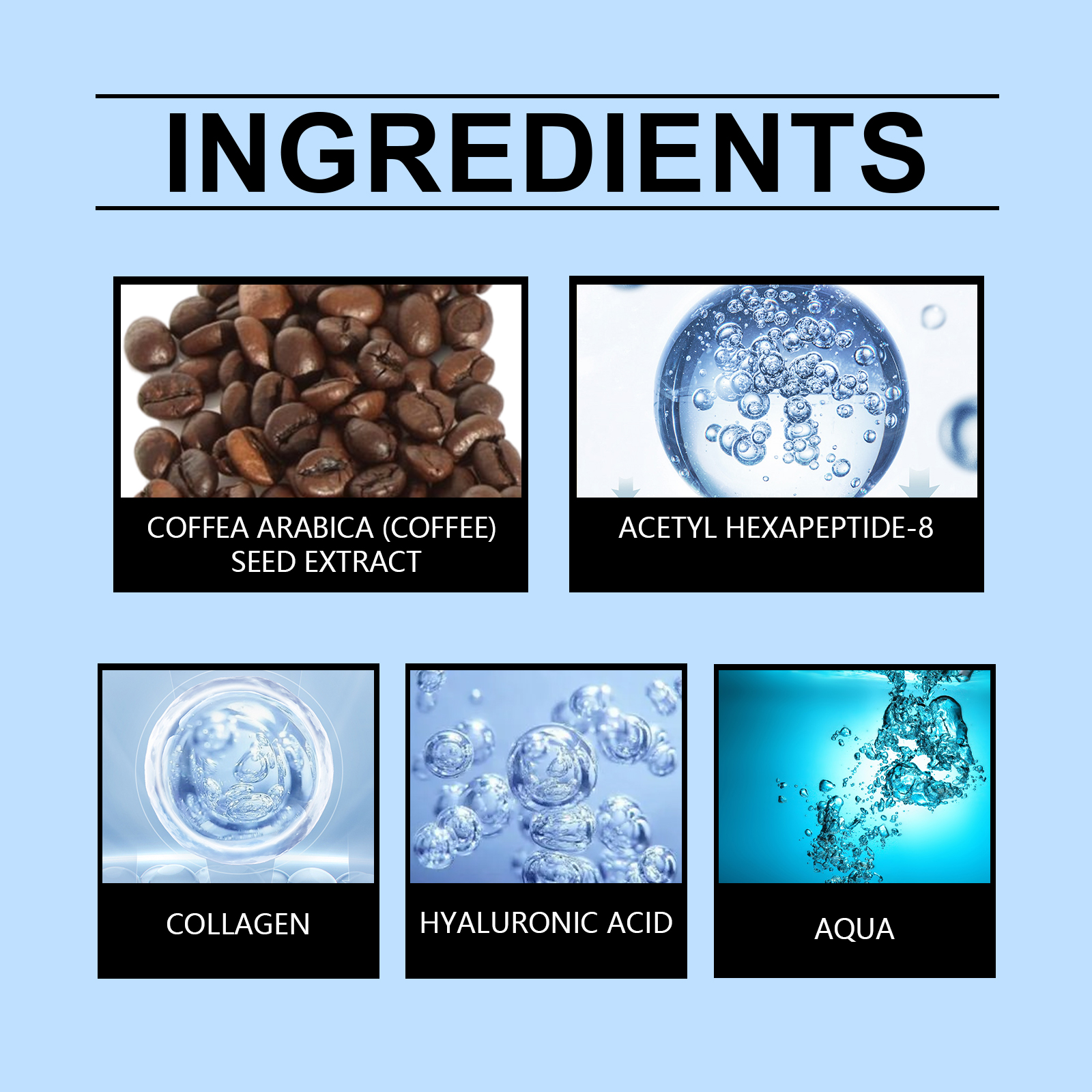 Our eye firming cream contains acetyl hexapeptide-8, coffee extract. It supports the skin structure and reduces fine lines. Its use method is very simple: after cleansing and toning, press the lever below to dispense an appropriate amount of eye firming cream. Apply it to the eyelids and gently massage with your fingers until fully absorbed. It also deeply moisturizes and locks in moisture.