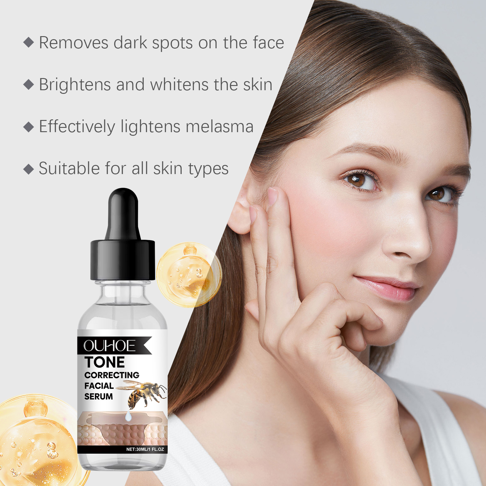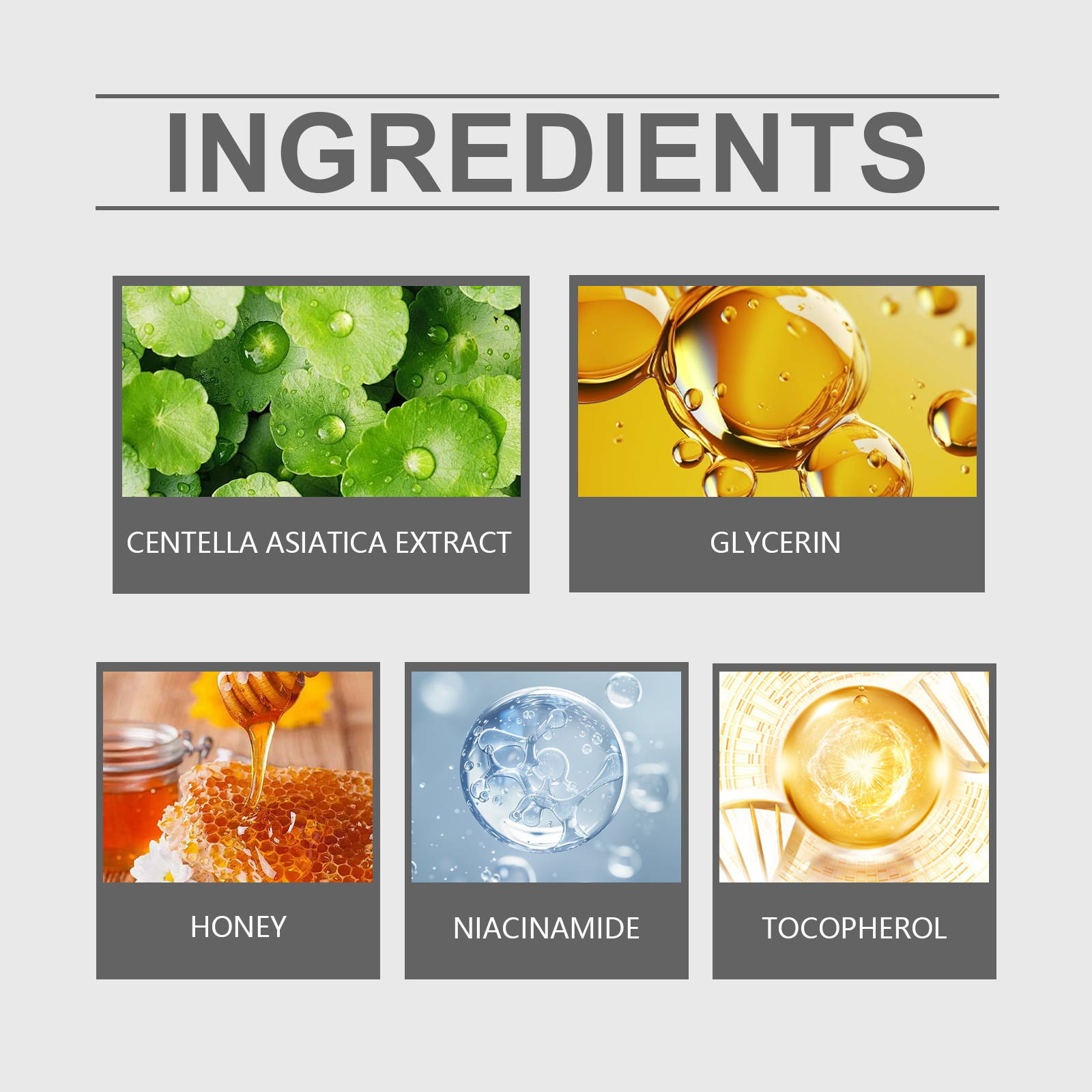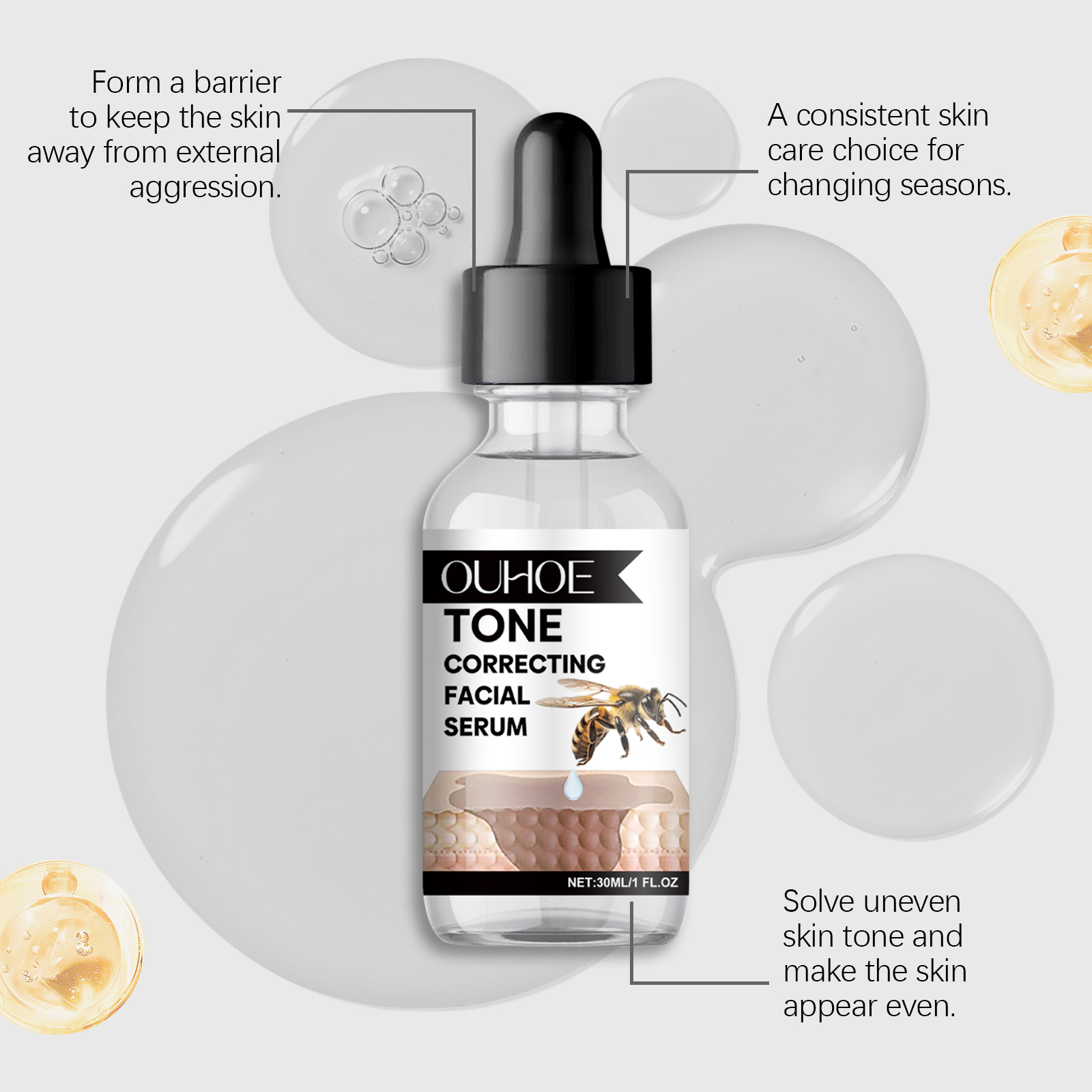 Our facial serum contains centella asiatica extract, glycerin, honey. It can lock in water, tighten skin, plump. And the luster is immediately visible. The way to use it is simple: 1. Clean the skin. 2. Apply appropriate amount of the product evenly on the face; 3. Massage gently in circular motions to promote absorption. Fade away the traces of age. The skin is delicate and smooth. Suitable for all skin types. Gentle care every day.