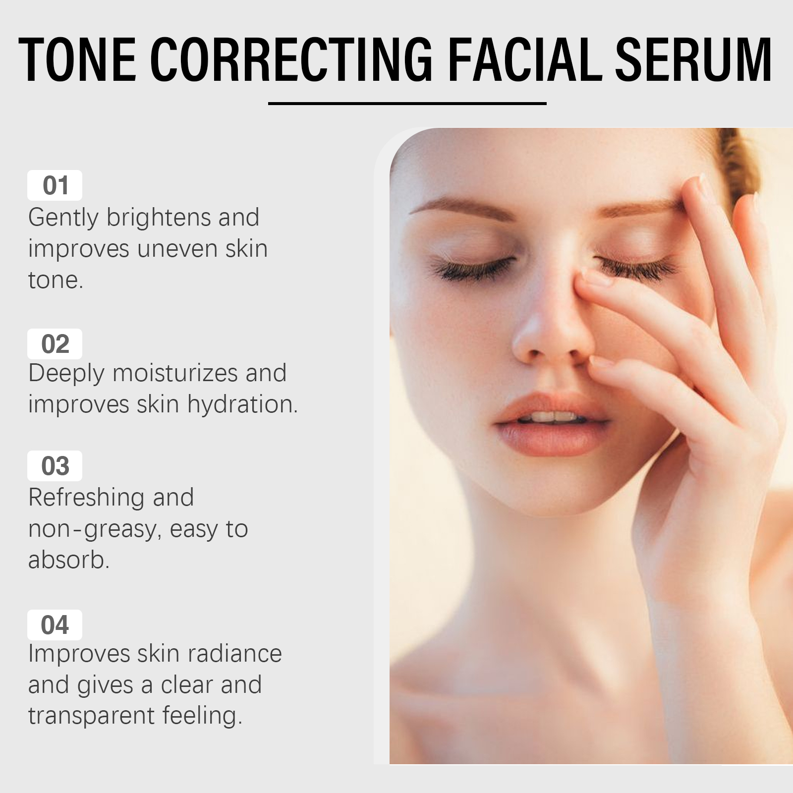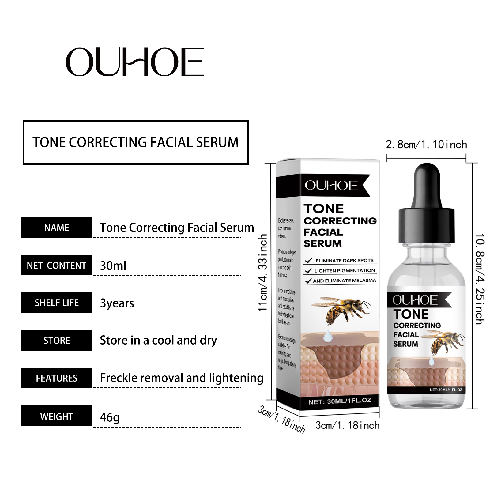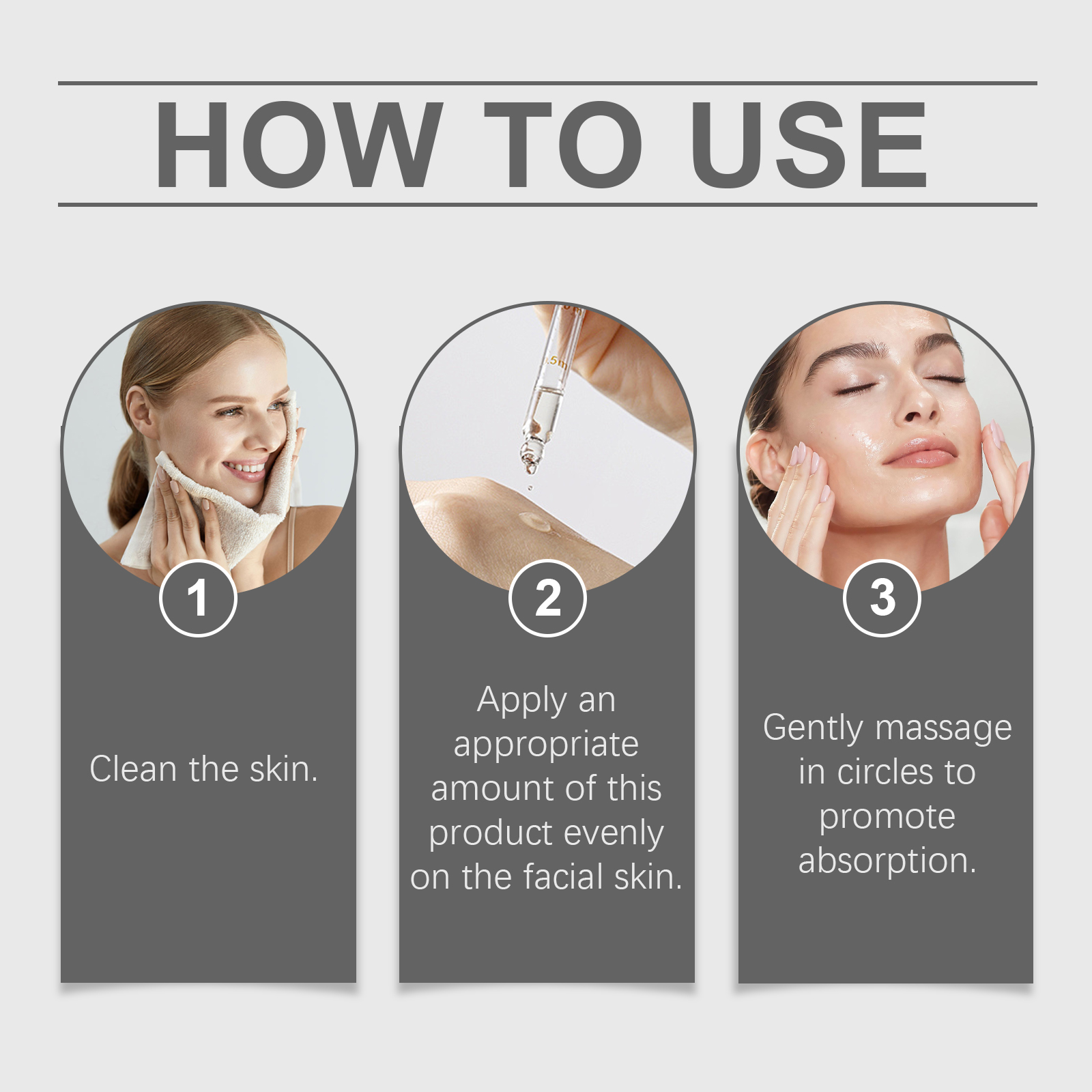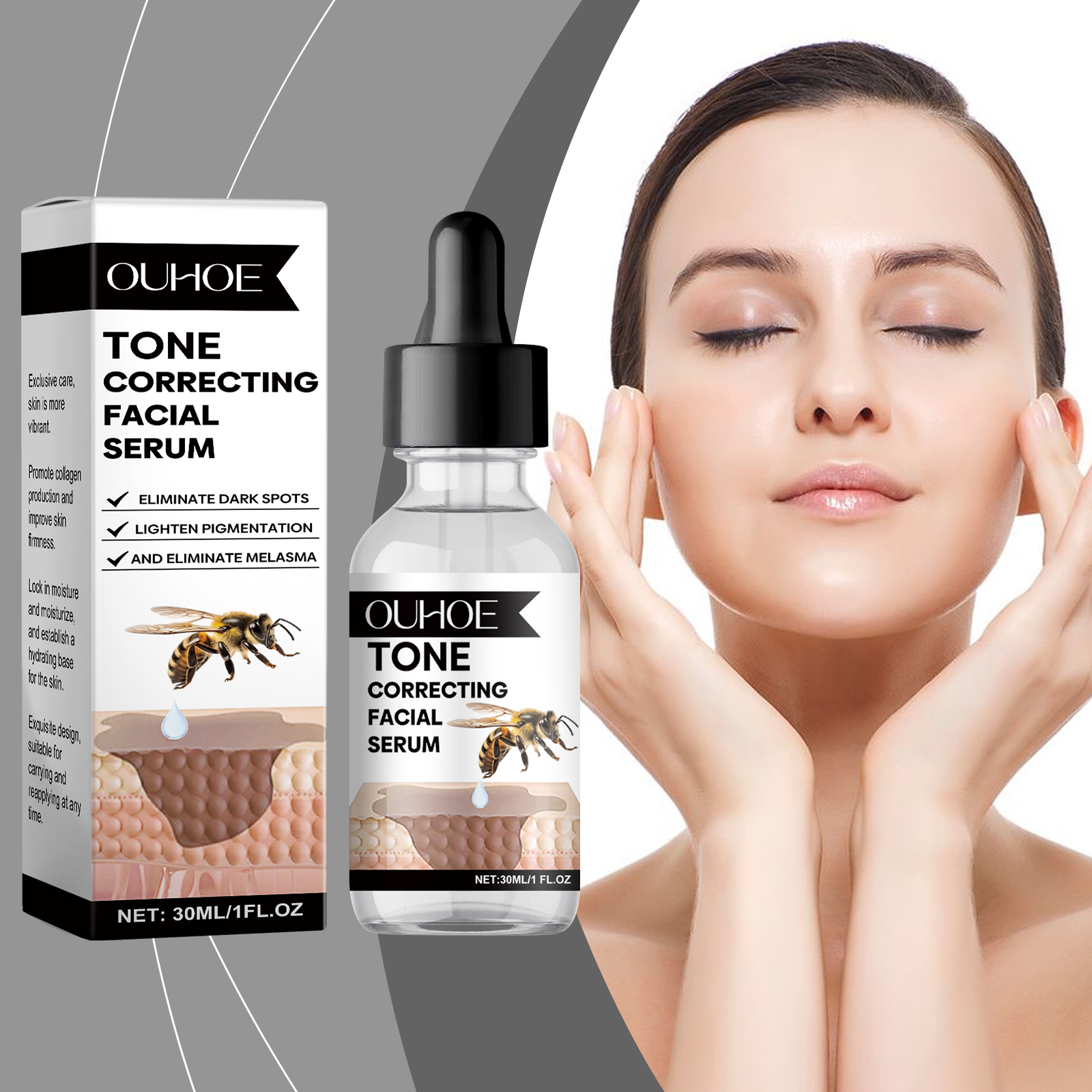 Our facial serum contains centella asiatica extract, glycerin, honey. It can lock in water, tighten skin, plump. And the luster is immediately visible. The way to use it is simple: 1. Clean the skin. 2. Apply appropriate amount of the product evenly on the face; 3. Massage gently in circular motions to promote absorption. Fade away the traces of age. The skin is delicate and smooth. Suitable for all skin types. Gentle care every day.