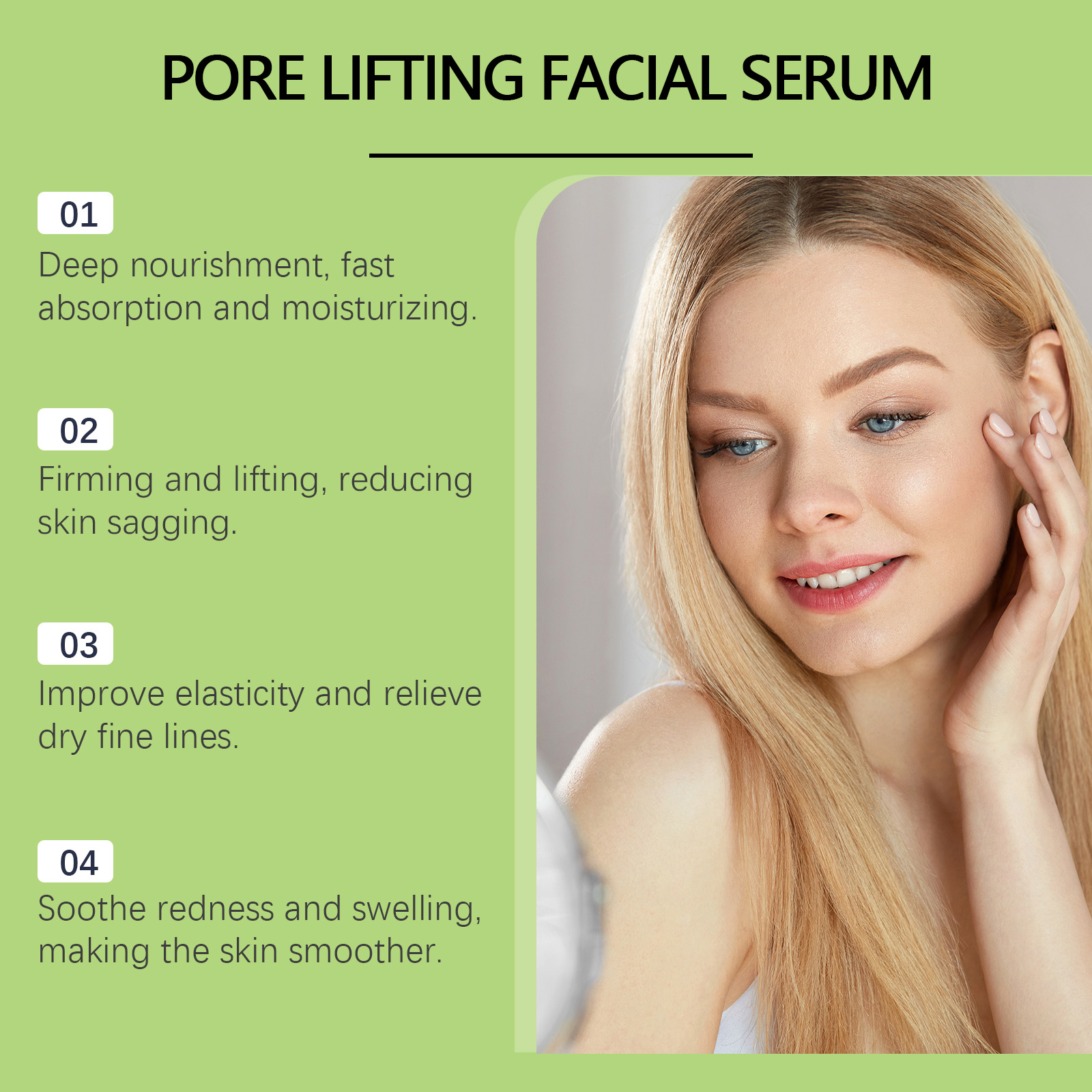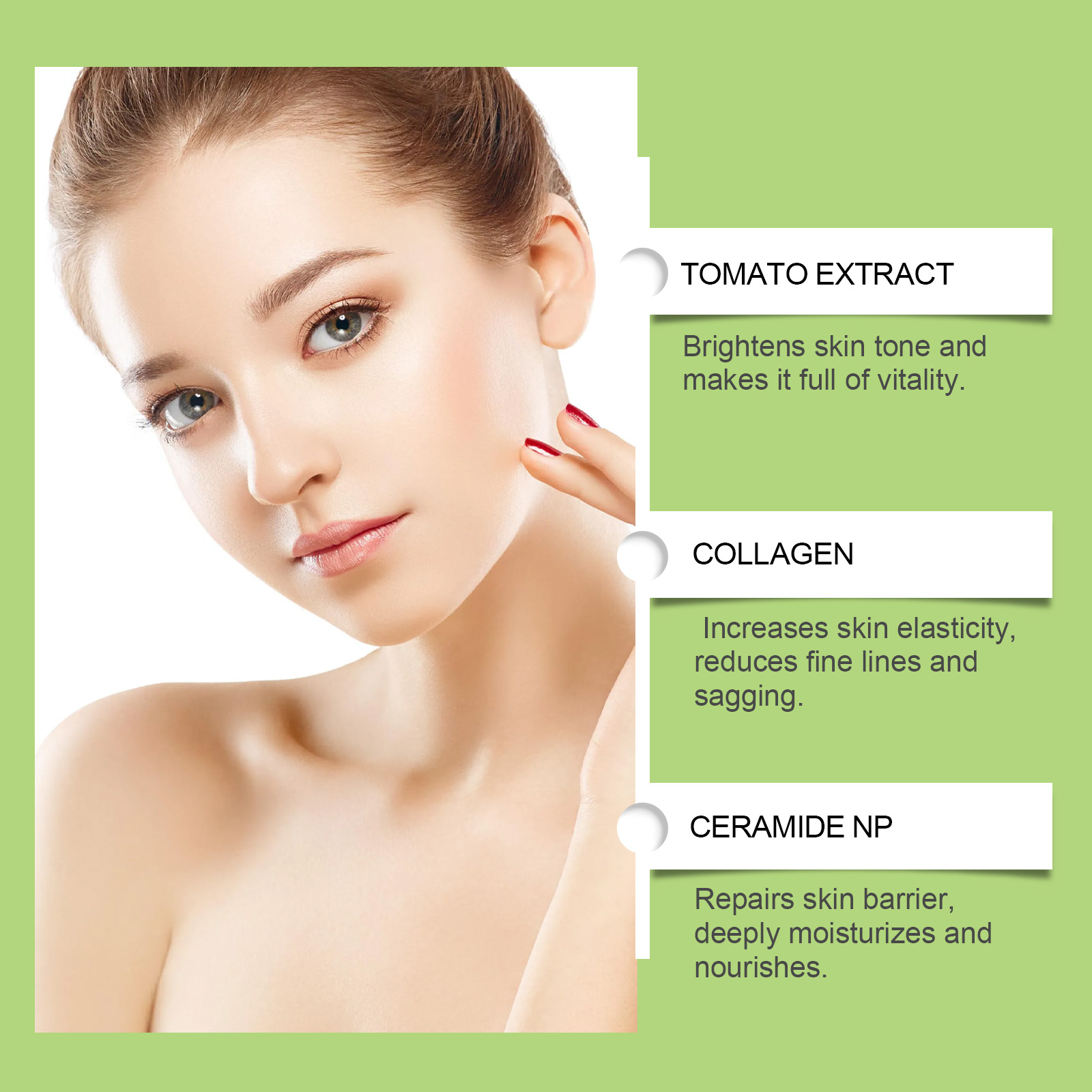 Our facial firming essence contains glycerin and tomato extract. It can relieve dryness and keep skin moist. Enhance skin elasticity, reduce slack and show firming effect. Its use method is simple: clean facial skin and keep it dry. Evenly apply proper amount of this product to facial skin. Gently massage until absorbed. And after use, the skin becomes more shiny and rejuvenates.