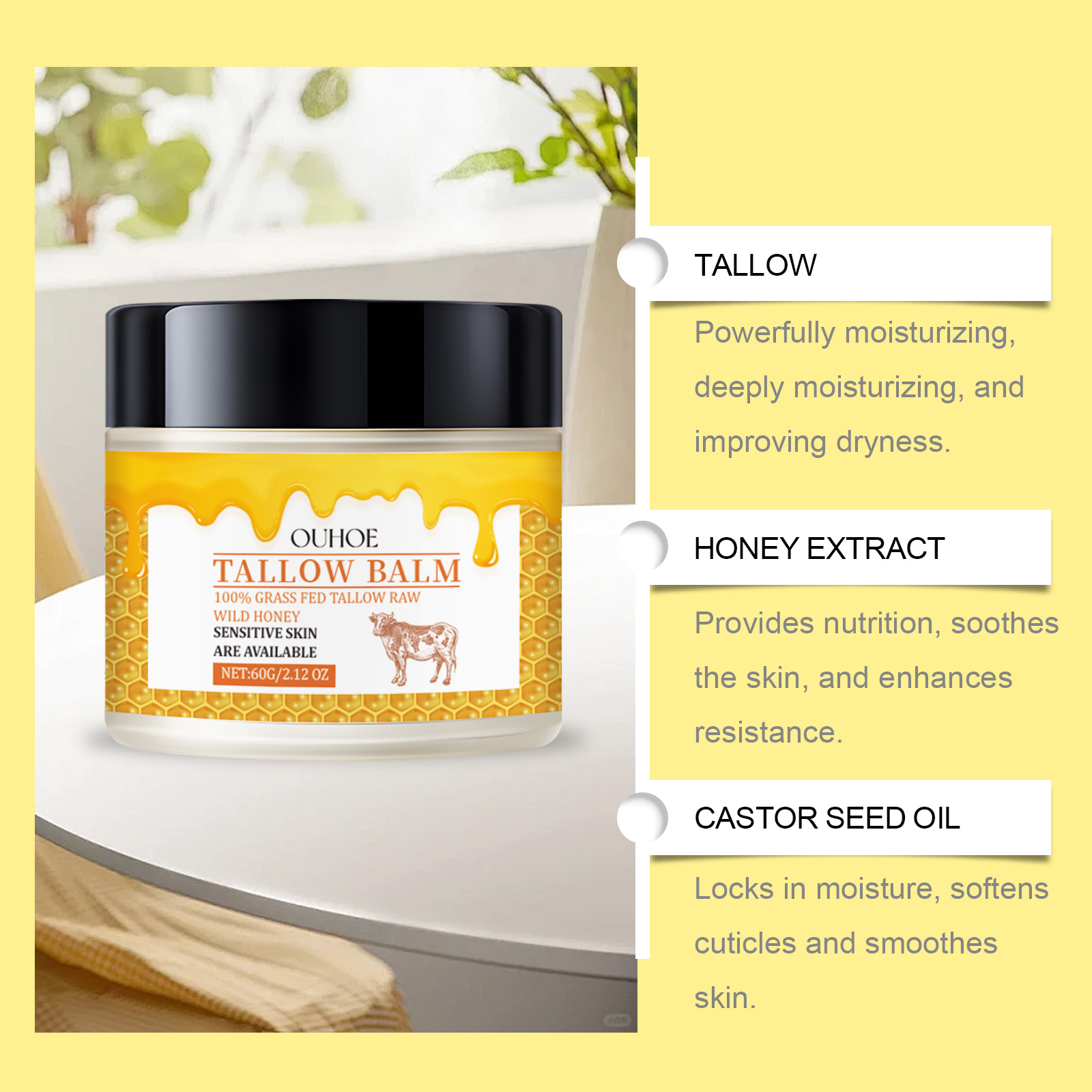 Our Facial Body tallow balm contains tallow, honey extract, castor oil. It moisturizes the skin and reduces dryness and chapping. Long-lasting moisturizing, 24/7 skin care. Its use is simple: 1. Clean and dry face and body skin; 2. Apply appropriate amount of the product evenly on the face and body; 3. Gently massage until absorbed. Applies to face and body. Long-lasting moisturizing, creating hydrating skin, penetrating into the bottom layer of skin, improving skin moisture.