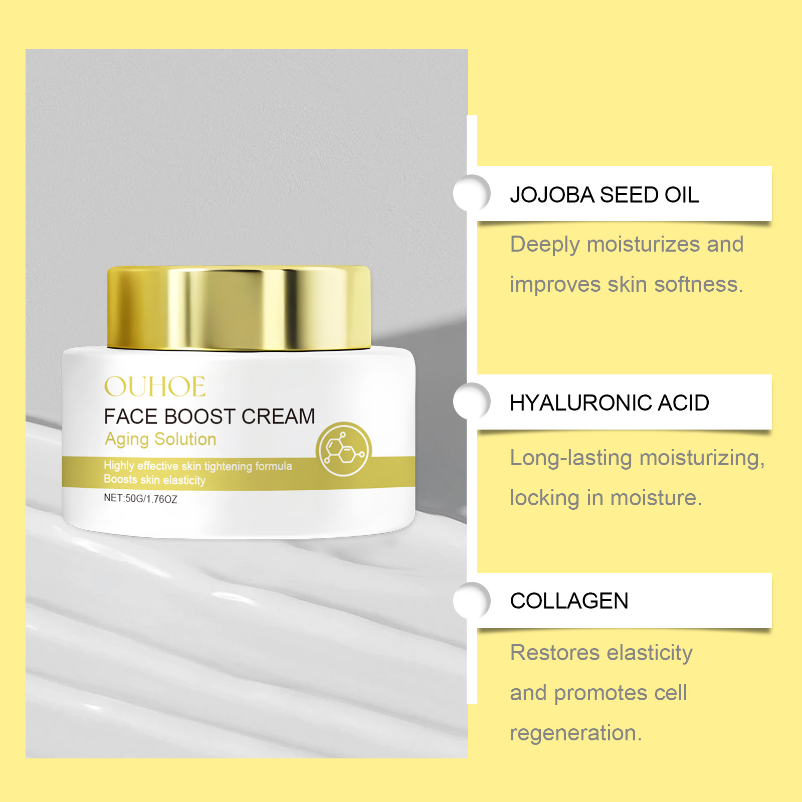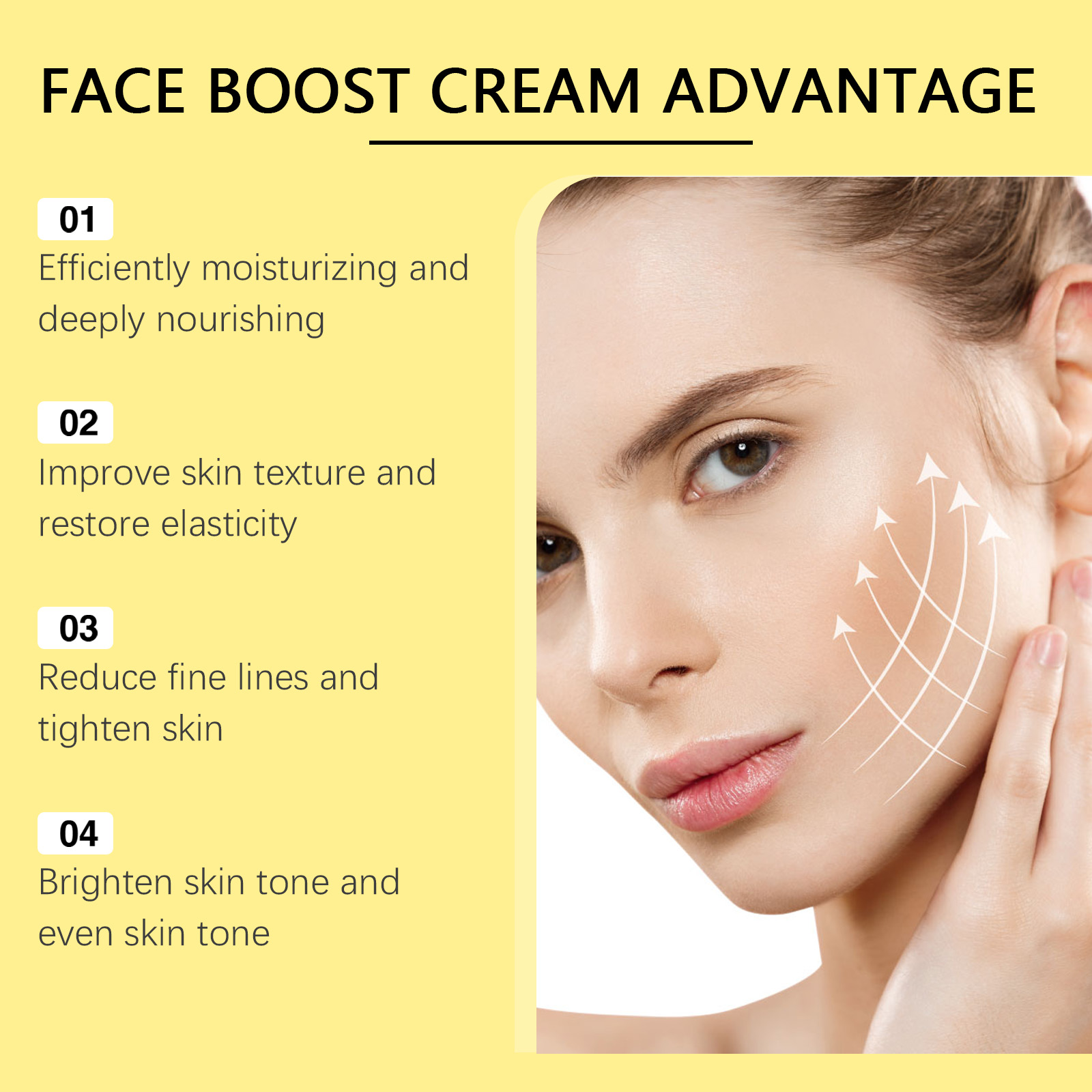 Our facial care cream is carefully formulated with jojoba seed oil, hyaluronic acid and collagen. Designed specifically for deep moisturizing and improving skin softness. The usage method is extremely convenient: 1. Clean the facial skin and keep it dry. Take a small amount of the face cream and apply it evenly to your face and neck. 3. Gently massage upwards to promote absorption. And it can promote cell regeneration and restore skin elasticity. Enhance skin elasticity, reduce sagging, make the skin firm and elastic, and rejuvenate youthful vitality.