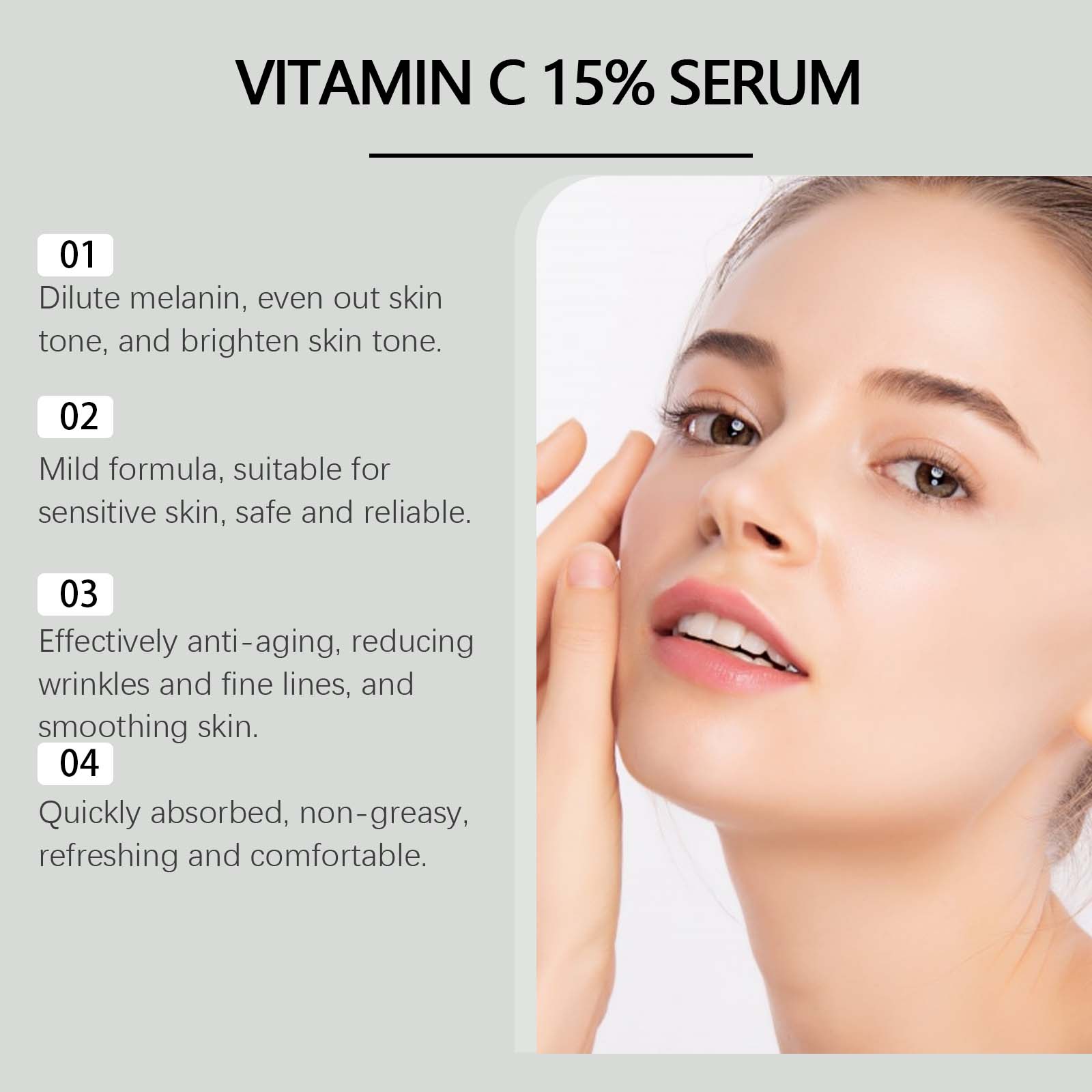 Our facial serum contains collagen, ascorbic acid (vitamin C). It can effectively reduce melanin, even skin tone, and restore skin luster. Its application method is very simple: clean your facial skin, keep the skin dry, apply appropriate amount of this product evenly on the facial skin, gently massage in circles to promote absorption. And can not stimulate, suitable for sensitive skin, safe and reliable.