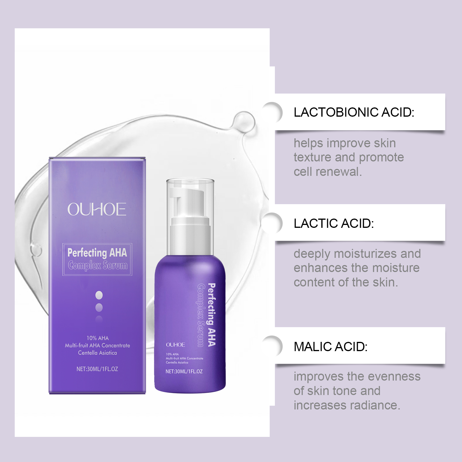 Our facial serum contains Asiaticum extract, glycerin. It can reduce the appearance of fine lines and restore smooth and youthful skin. Its use is simple: clean facial skin, keep skin dry; Apply appropriate amount of the product evenly on the face; Gently massage until absorbed. It can lock in moisture for a long time, improve dry skin, make skin moist and soft, and glow healthy.