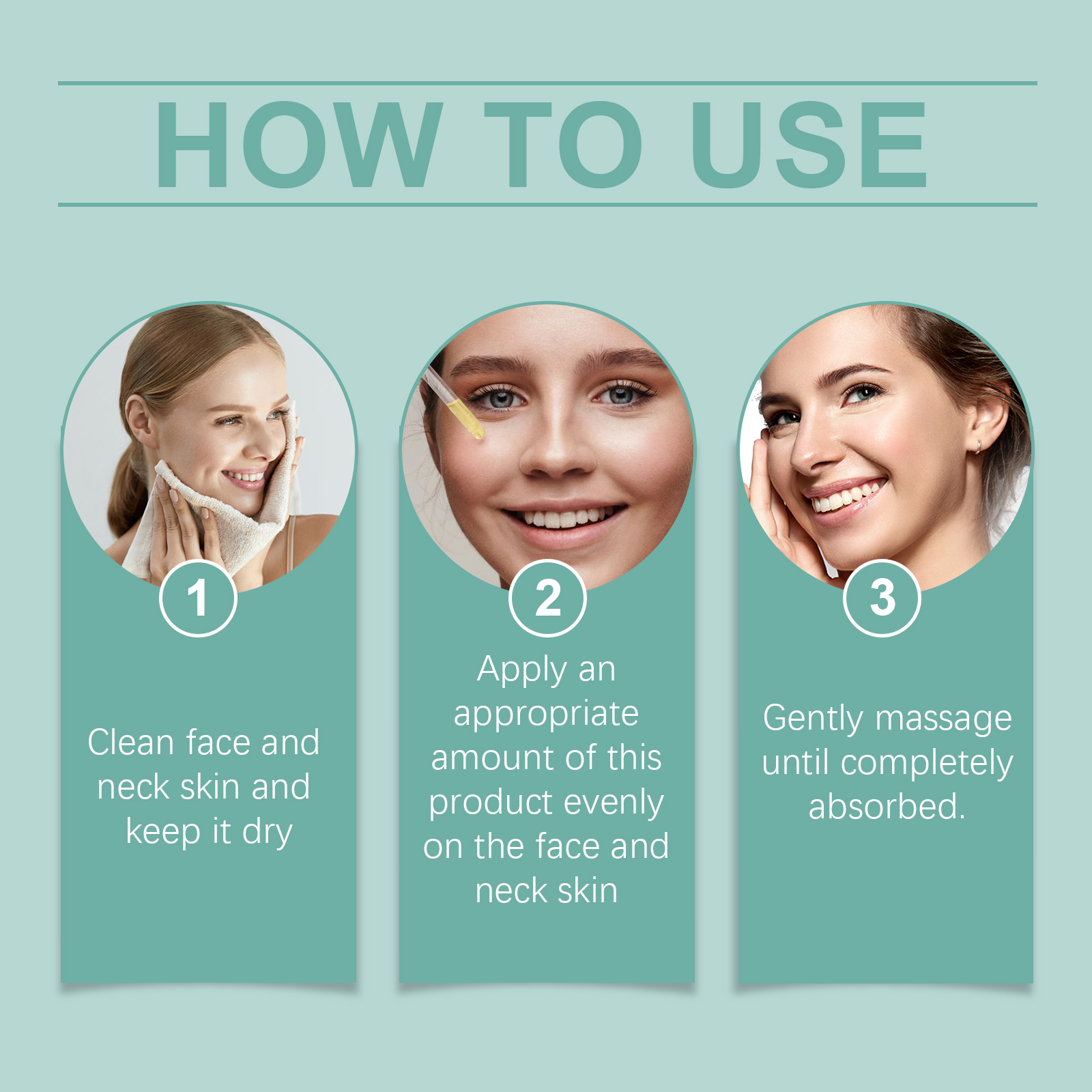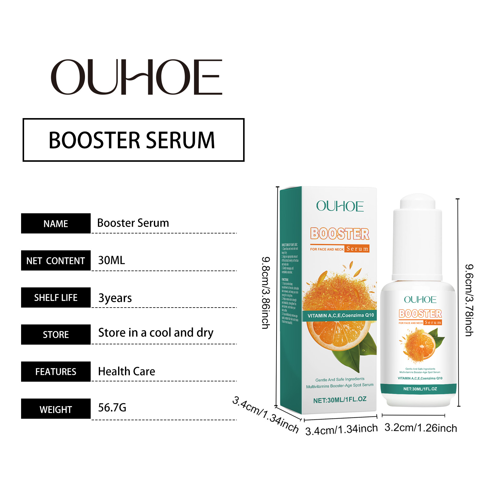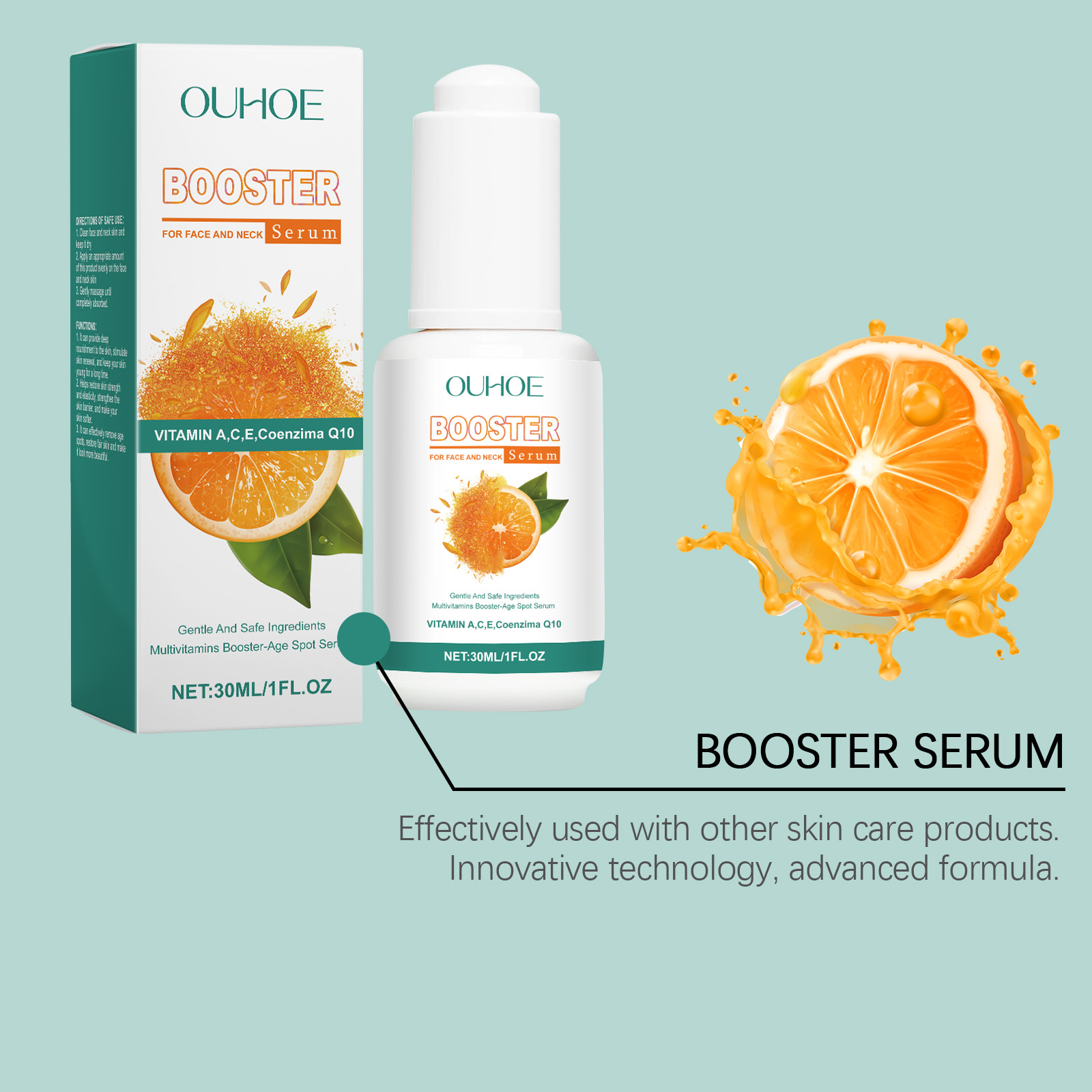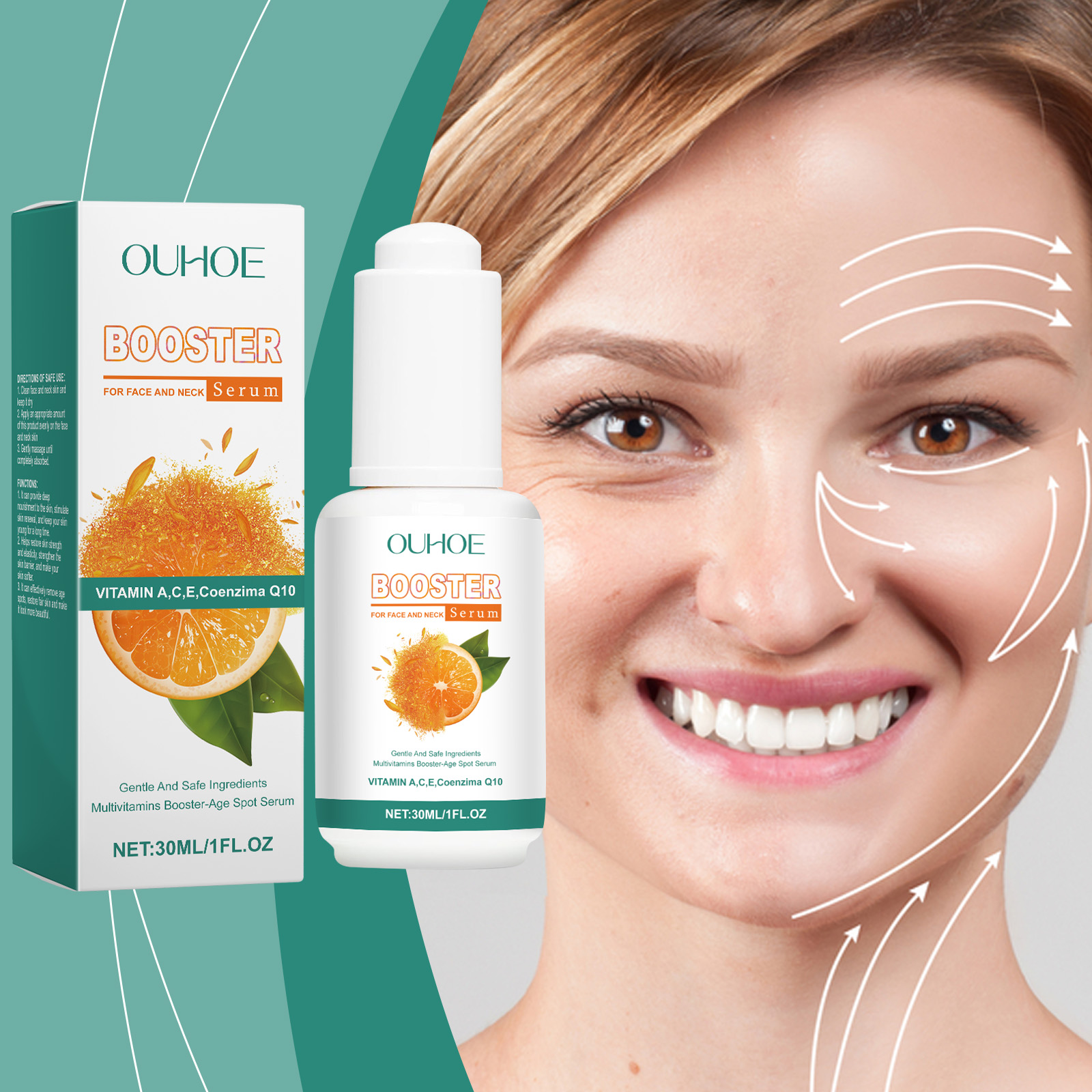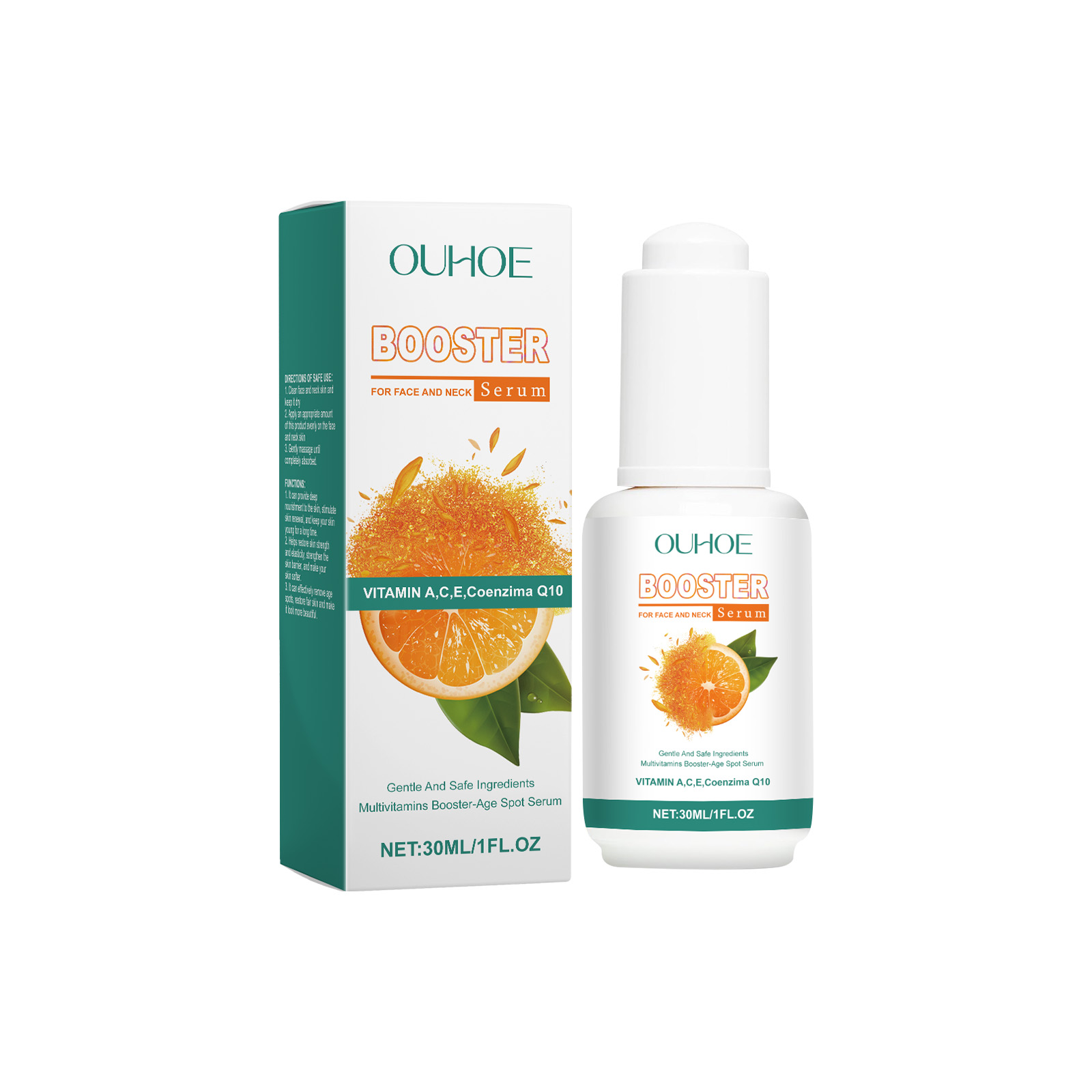 Our facial essence contains coenzyme Q10 and orange extract. It can provide necessary nutrients and improve skin quality. Its application method is very simple: Cleanse the skin on your face and neck, keep the skin dry, take an appropriate amount of this product, apply it evenly to the skin on your face and neck, and gently massage until it is fully absorbed. It does not leave any oil and the skin will immediately regain its vitality.