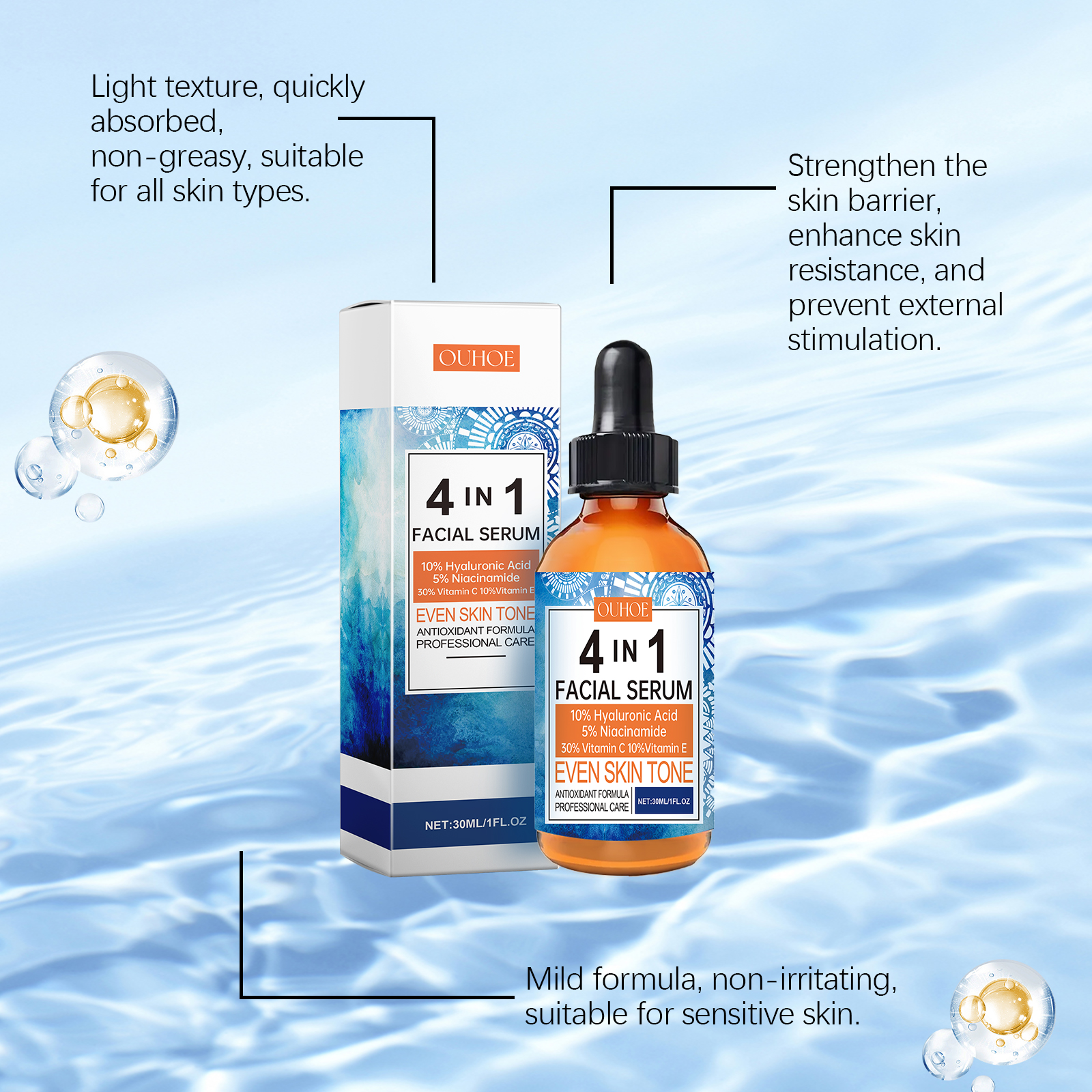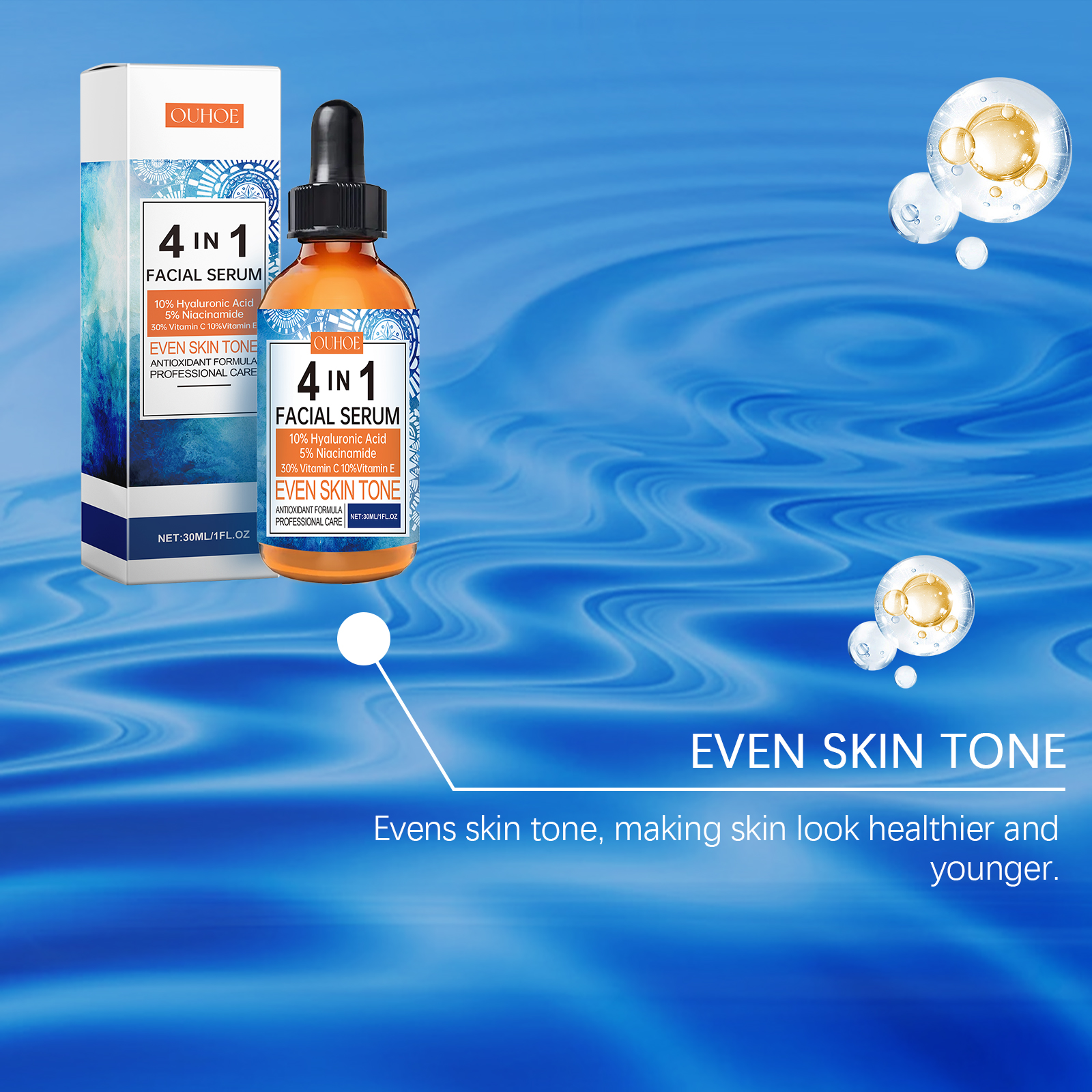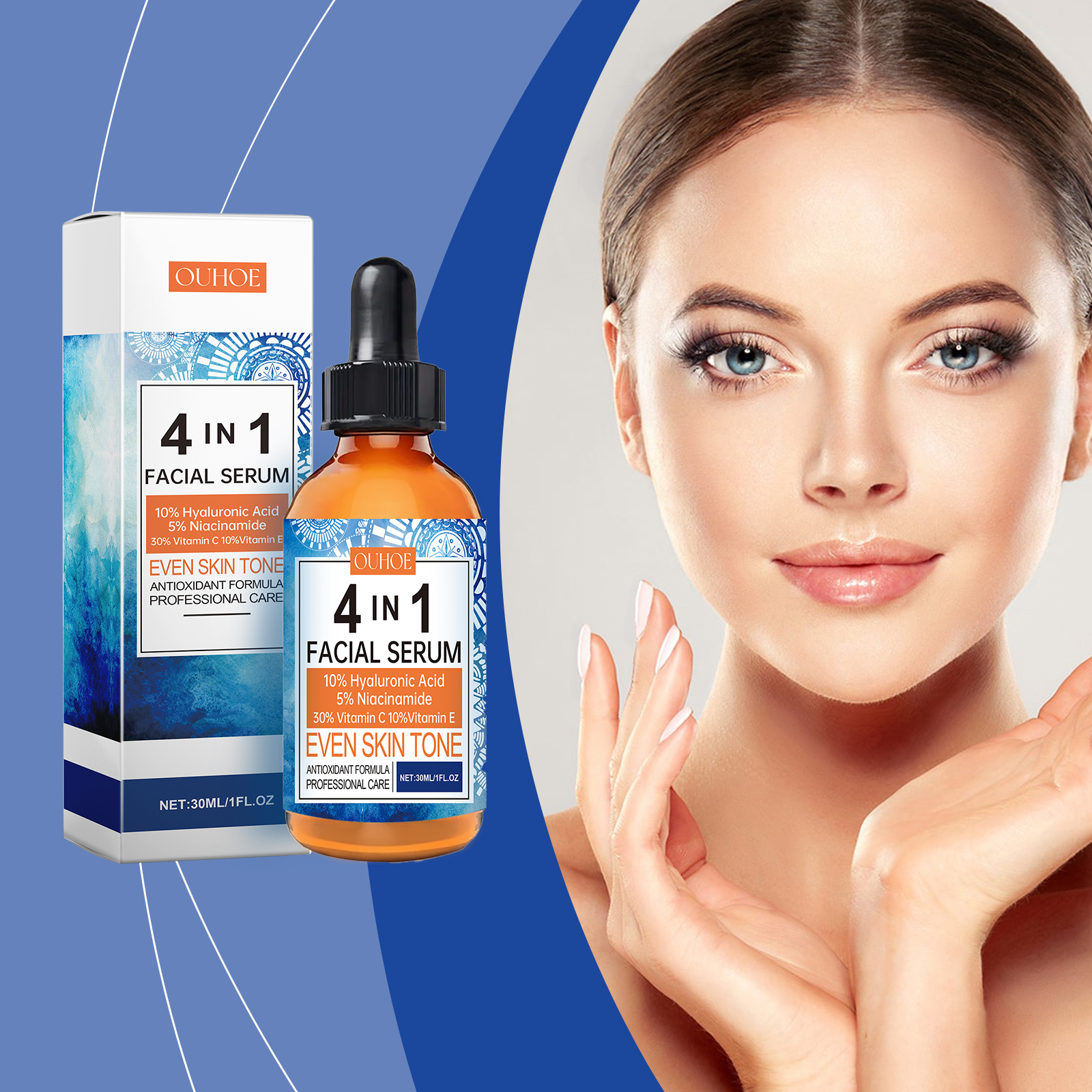 Our face serum contains tocopherol (vitamin E), acetyl tripeptide-1. It can remove dullness, restore skin shine, and make skin glow. The way to apply it is simple: thoroughly clean the skin and dry it first. Apply appropriate amount of this product evenly on the face. Gently massage until fully absorbed. And can repair damaged skin, promote cell regeneration, improve skin health.