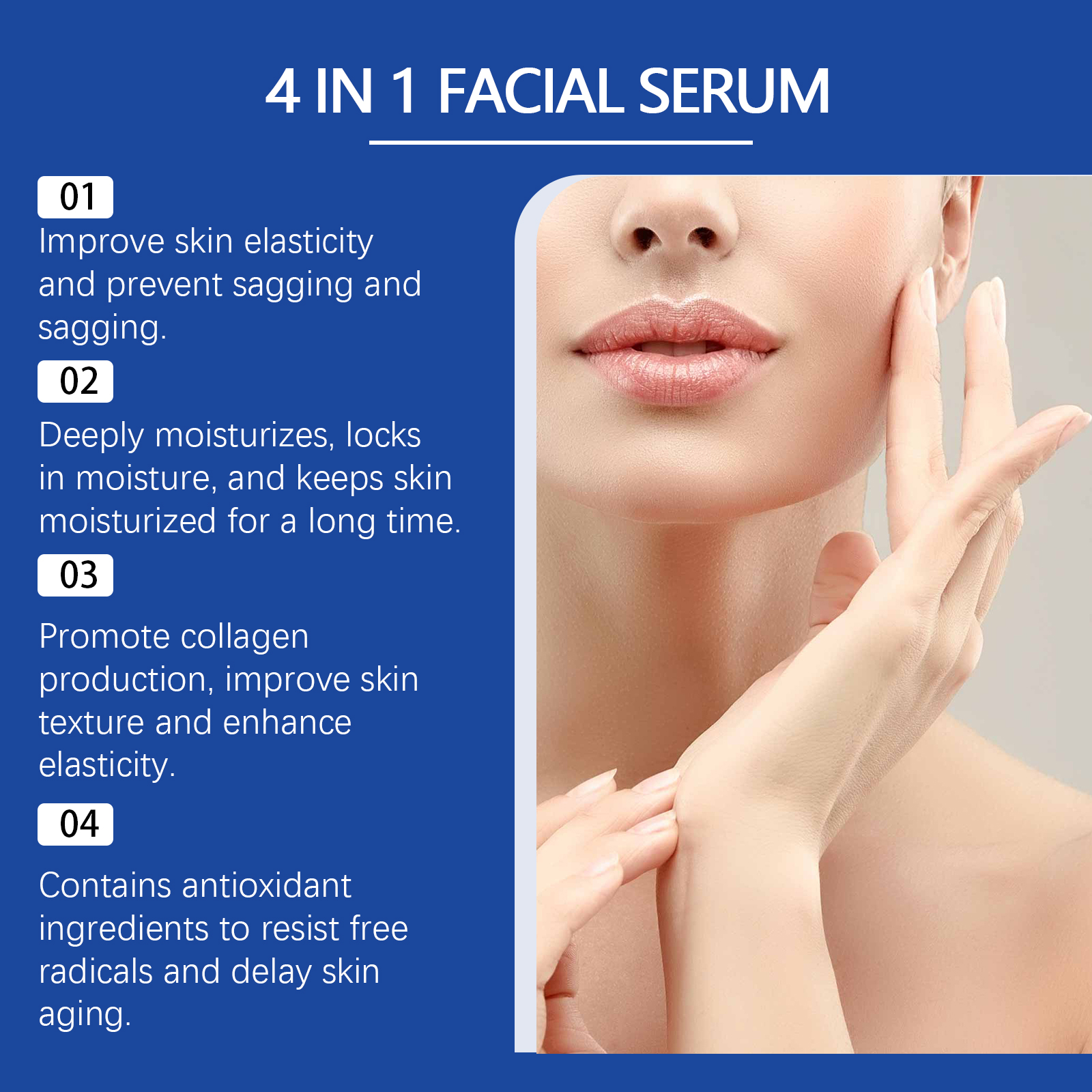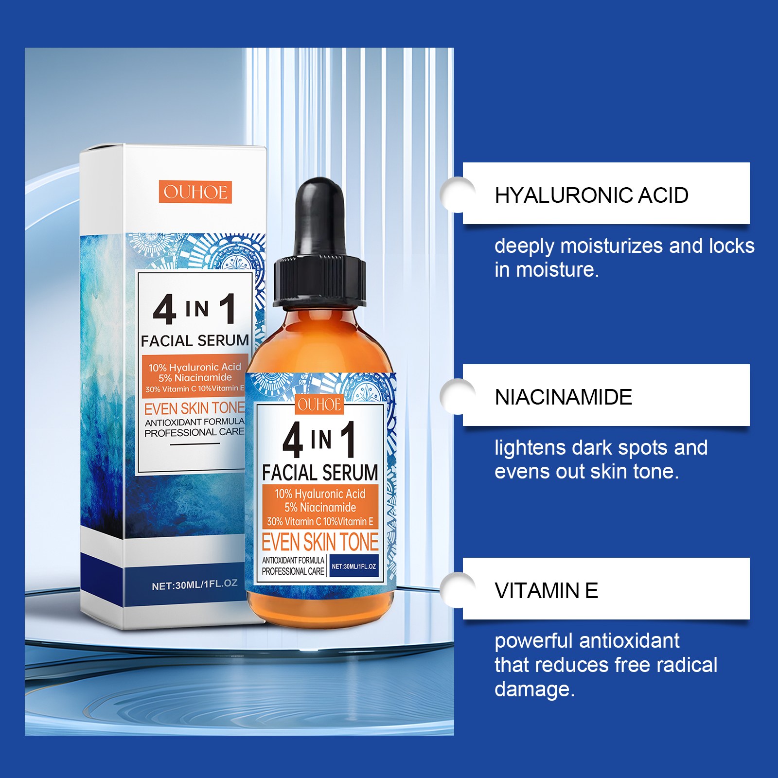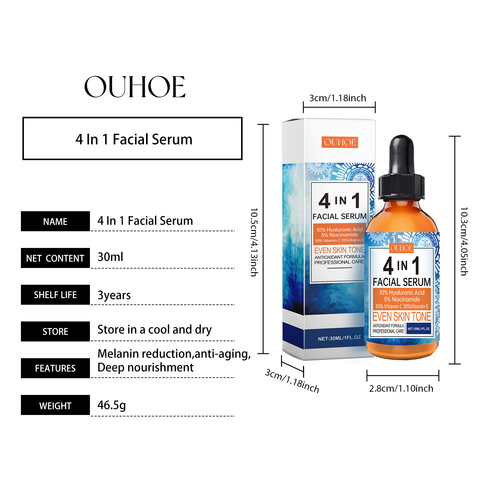 Our face serum contains tocopherol (vitamin E), acetyl tripeptide-1. It can remove dullness, restore skin shine, and make skin glow. The way to apply it is simple: thoroughly clean the skin and dry it first. Apply appropriate amount of this product evenly on the face. Gently massage until fully absorbed. And can repair damaged skin, promote cell regeneration, improve skin health.