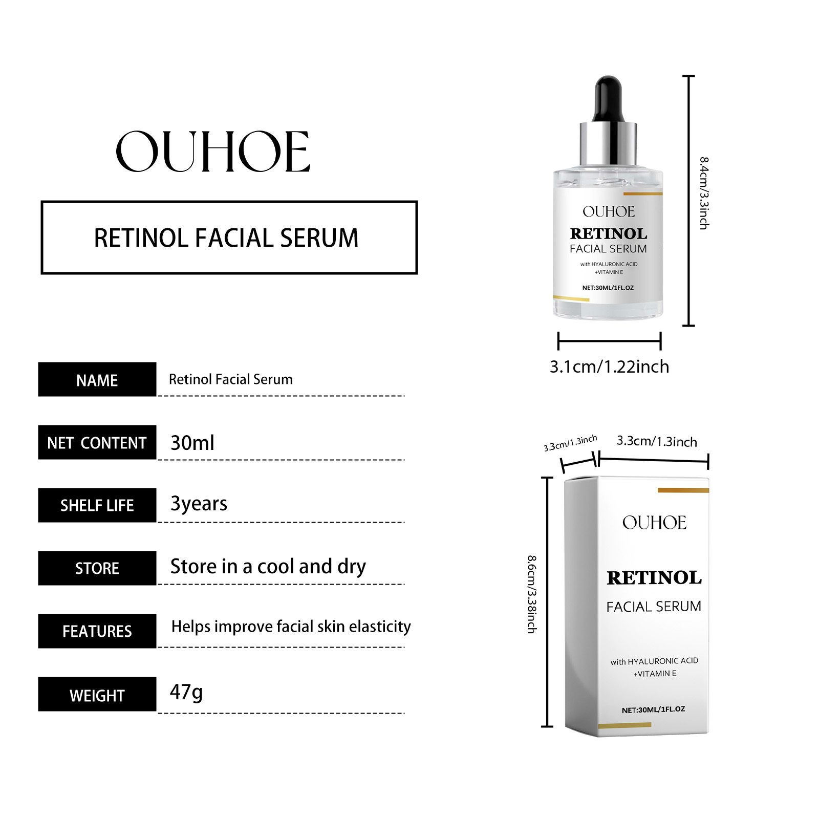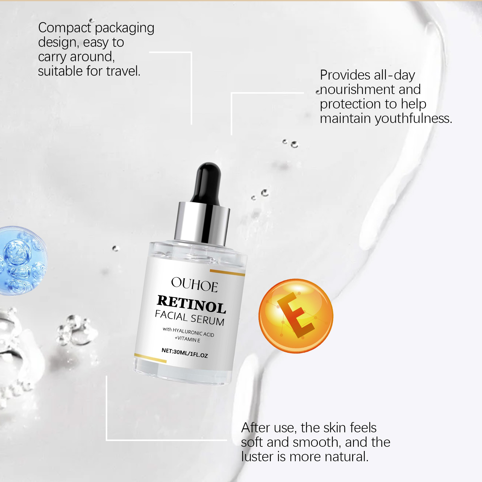 Our facial serum contains glycerin and retinol. It provides deep moisture and locks in moisture. Its application method is very simple: clean the facial skin to keep the skin dry, apply appropriate amount of this product evenly on the facial skin, gently massage until completely absorbed. And it can slow down aging and keep you young.