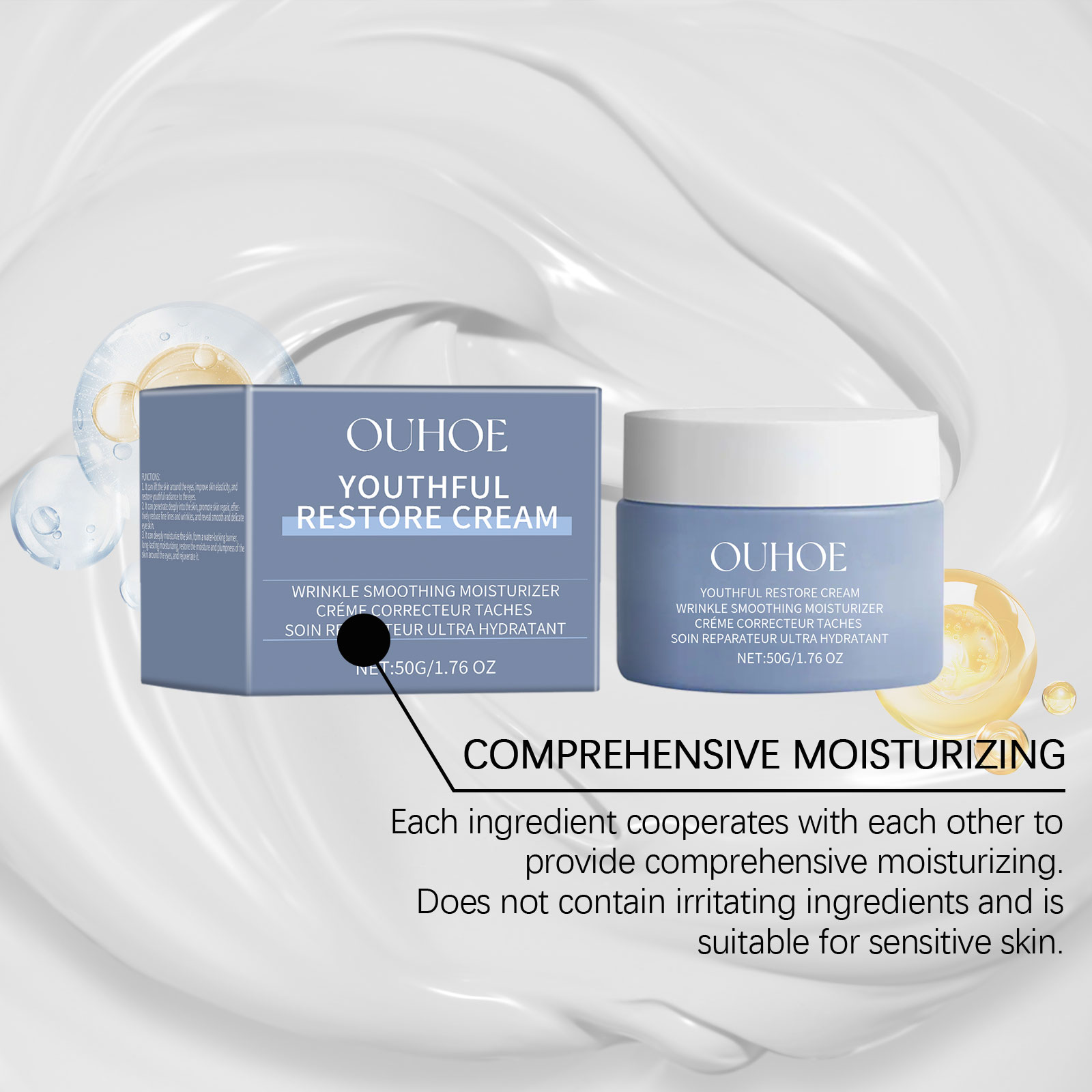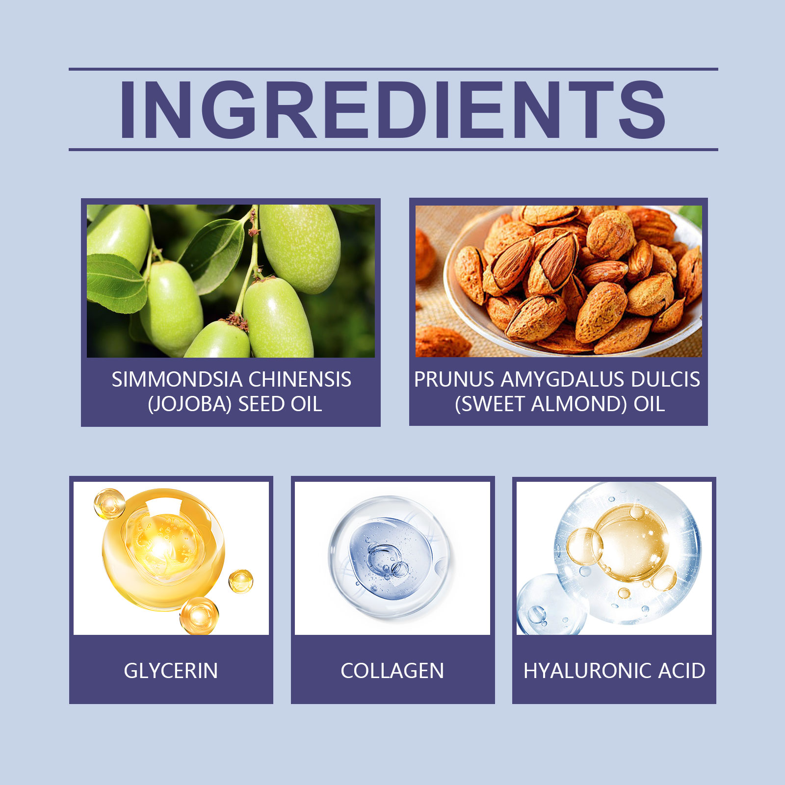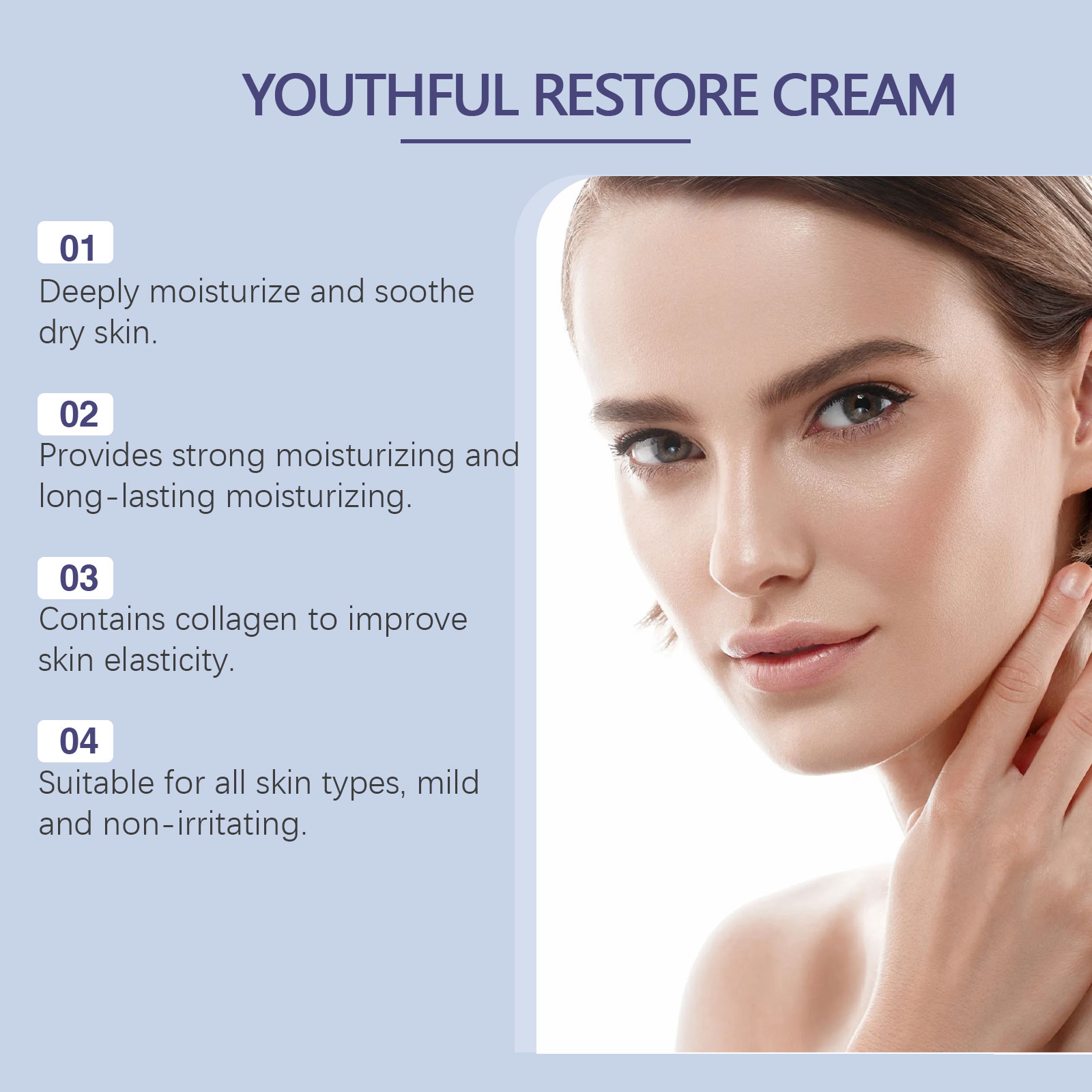 Our facial moisturizer contains sweet almond oil, collagen. It soothes the skin, maintains moisture balance and prevents dryness. Its application method is very simple: clean the facial skin, keep the skin dry, take an appropriate amount of cream, evenly apply on the facial skin, gently massage until completely absorbed. And can provide a deep moisturizing effect.