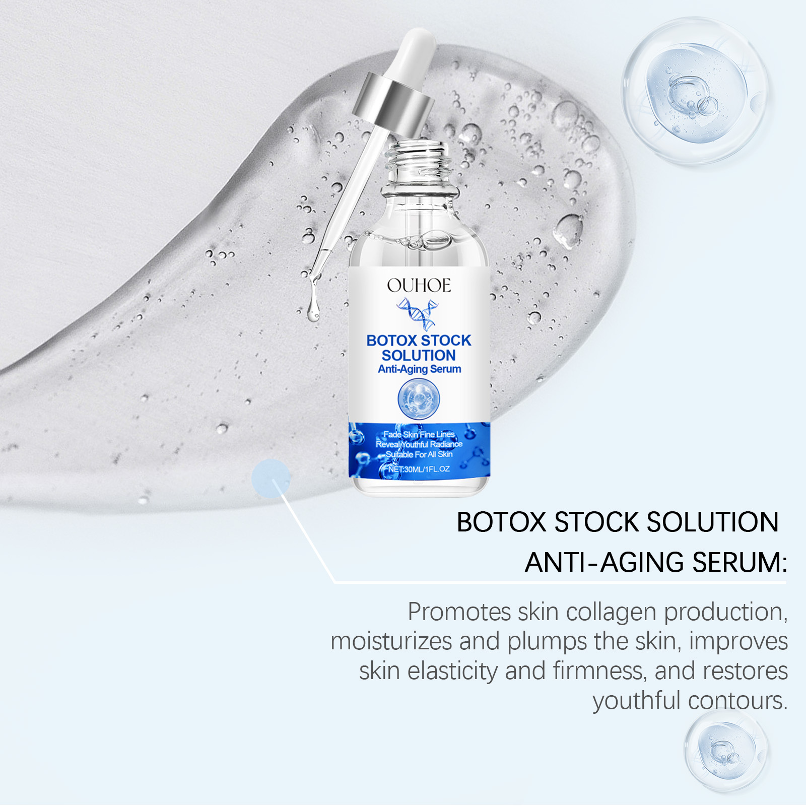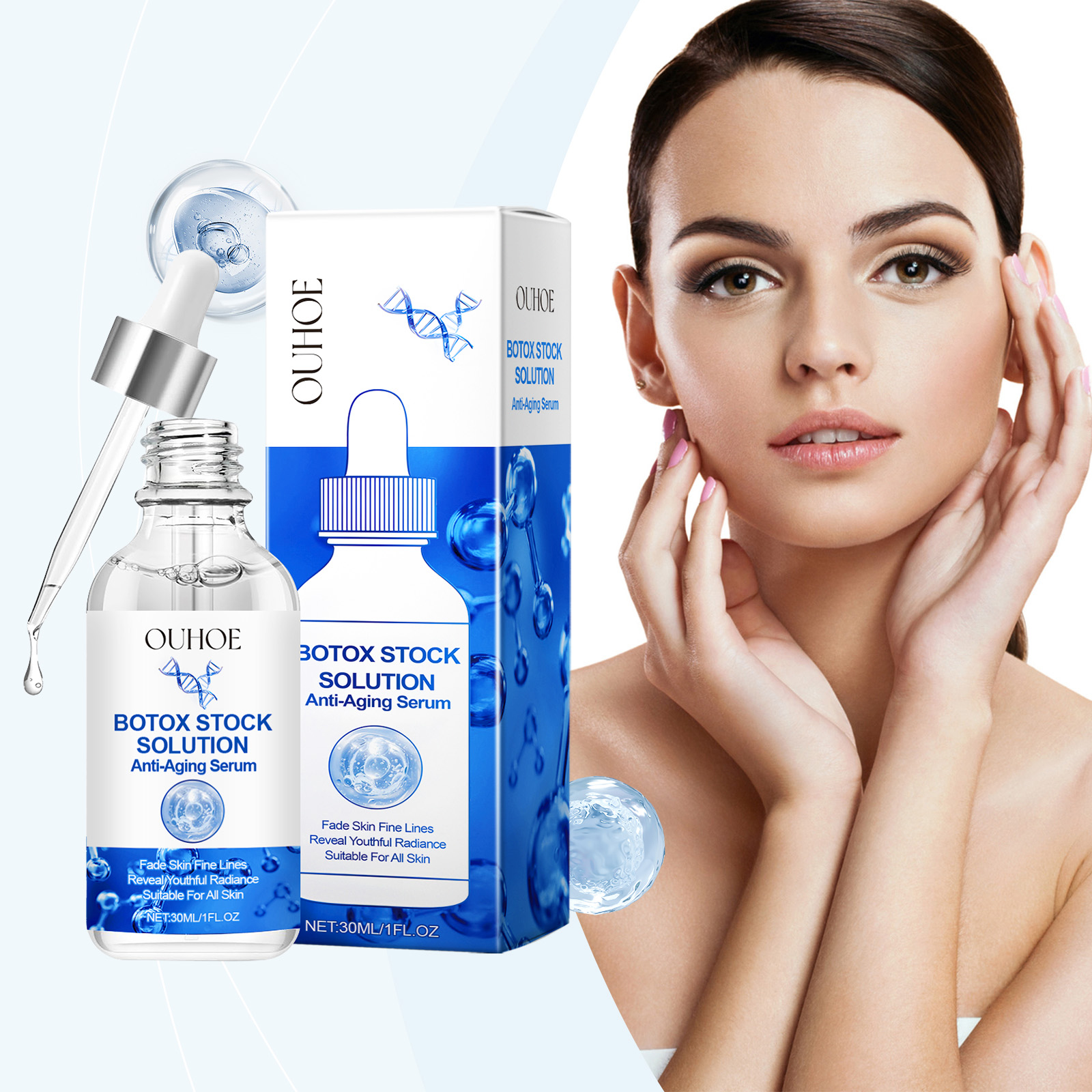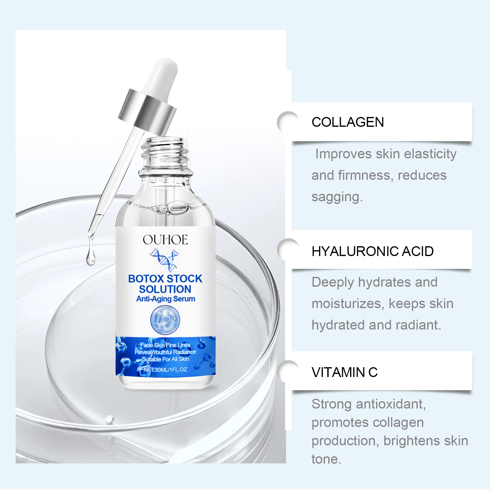 Our facial essence contains nicotinamide and vitamin C. It can deeply hydrate, lock in moisture for a long time, and make the skin plump and bright. Lock in moisture throughout the day, keep the skin tender, smooth and bid farewell to dryness. Its usage method is very simple: Clean your face, take an appropriate amount of essence with a dropper and apply it to your face. Gently massage in circular motions from the center of the face to the outside until it is completely done. And it can improve skin elasticity and reshape facial contours.